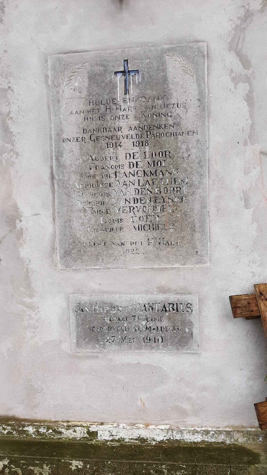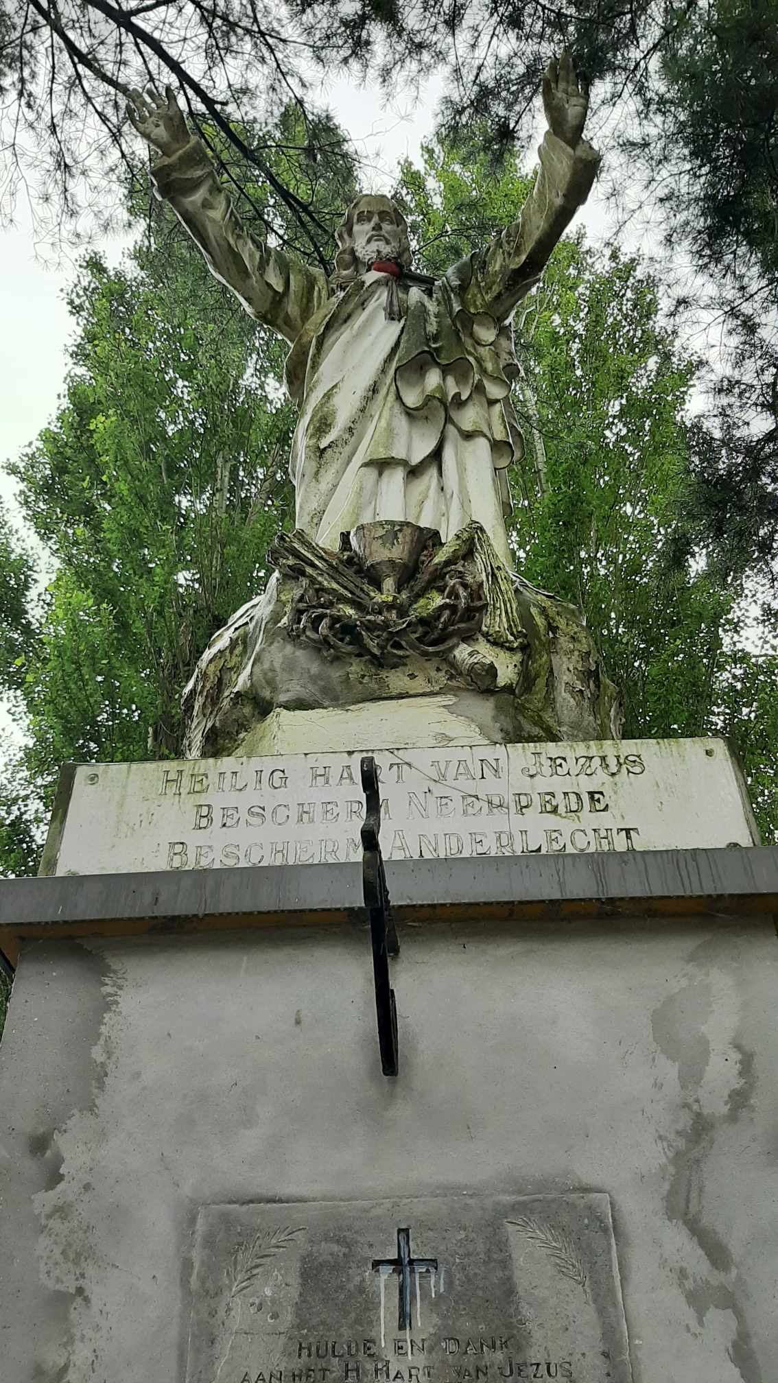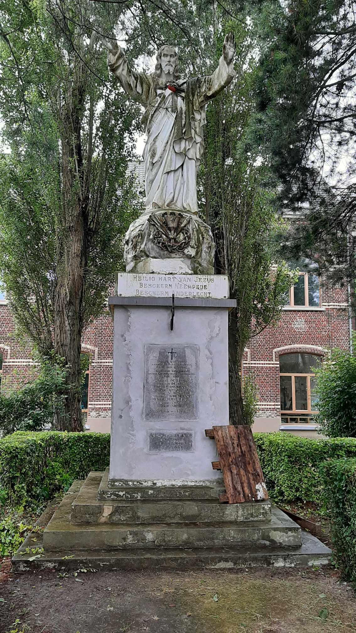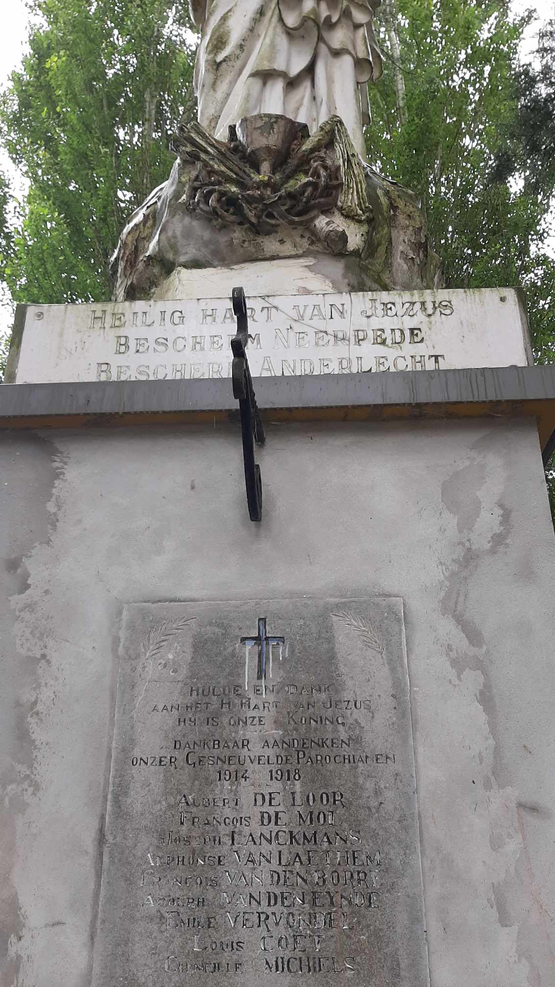 "(Socle de la statue) : HEILIG HART VAN JEZUS BESCHERM NEERPEDE BESCHERM ANDERLECHT / (stèle) HULDE EN DANK AAN HET HART VAN JEZUS HY IS ONZE KONING / DANKBAAR AANDENKEN ONDER GESNEUVELDE PAROCHIANEN 1914 1918 / ALBERT DE LOOR / FRANCOIS DE MOL / JOSEPH LANCKMANS / ALPHONSE VANLAETHEM / FRANCOIS VANDENBORRE / ADOPLH VANDENEYNDE / LOUIS COET / CORNEILLE MICHIELS / JAN BAPTIST JANUARIUS / SOLDAAT 7E LINIE / GESNEUVELD TE MALDEGEM / 27 MEI 1940