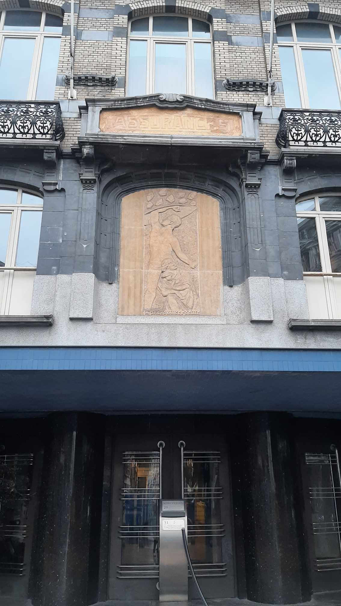 Ce bas-relief, présent sur le soubassement des bâtiments situés entre les n° 5 et 7 de la rue de l’Autonomie qui ont été réalisé par Ferdinand et Maxime Brunfaut en 1932, signé de la main de Dolf Ledel dans la partie inférieure droite, représente un homme nu soulevant un bouclier sur lequel s’abat une pluie de pierre, au-dessus d’une femme et de son enfant, dans un geste de protection. Ce dernier est le même, en plus grand, que celui présent sur la façade de l’immeuble de la Prévoyance Sociale.