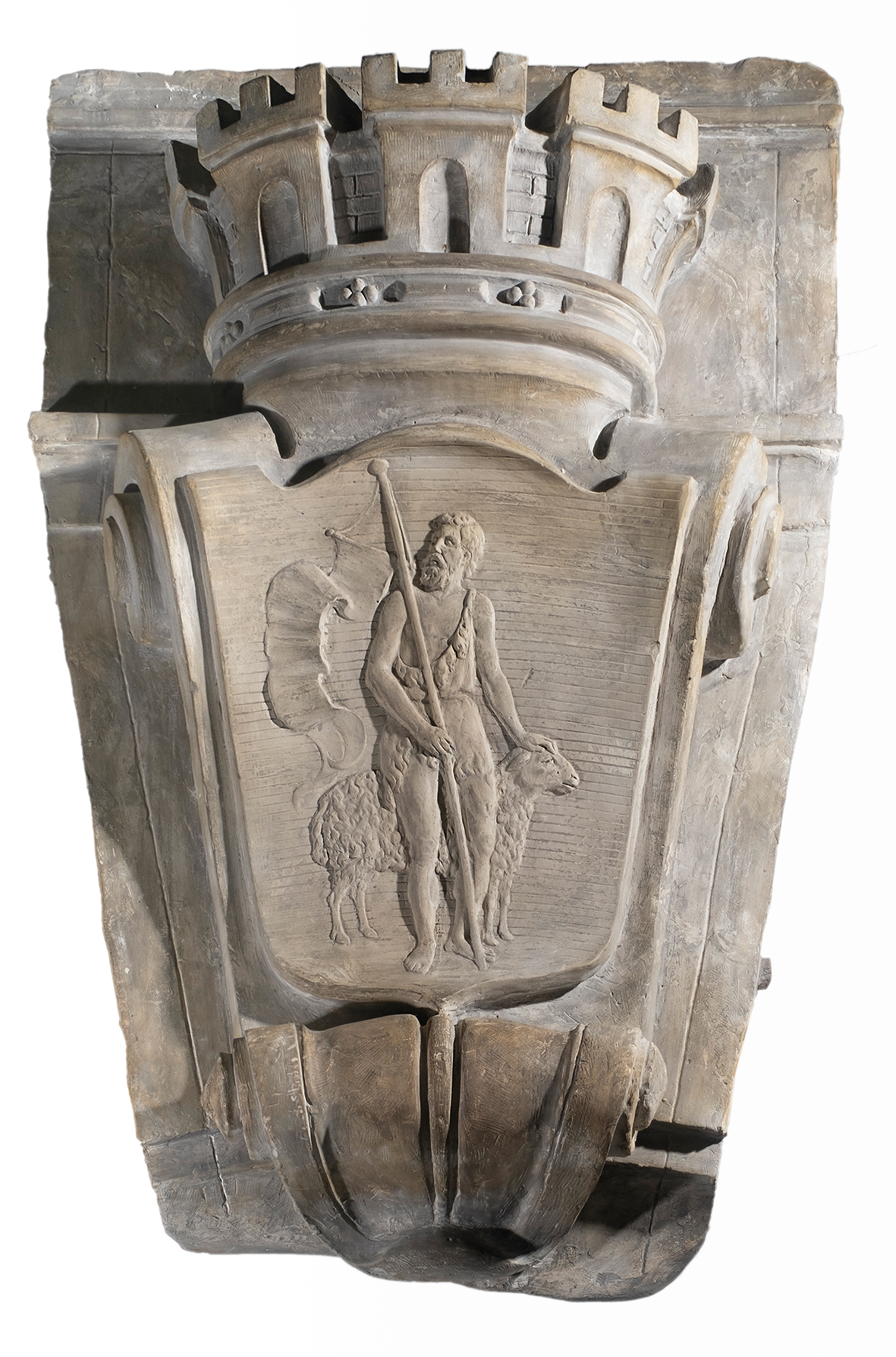 anon., Blason communal de Molenbeek-Saint-Jean (projet) avec Saint Jean-Baptiste, bas-relief en plâtre, s.d. [19e siècle ?].