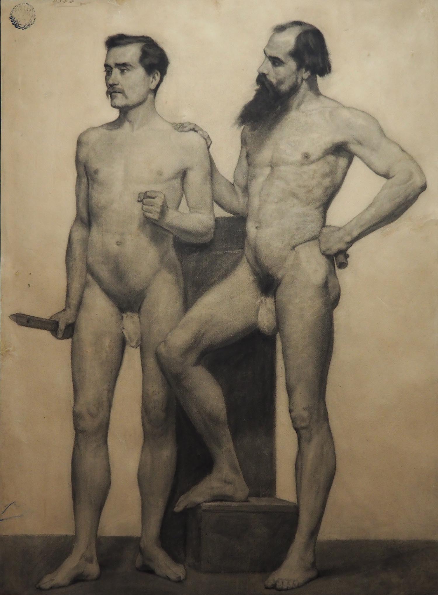 Étude de nu de deux hommes. Les deux figures se tiennent debout ; la main de l’un repose sur l’épaule de l’autre. Tous deux tiennent un court attribut. Adrien-Joseph Madiol a remporté le premier prix de dessin de modèle à l'Académie royale des Beaux-Arts de Bruxelles avec cette œuvre.