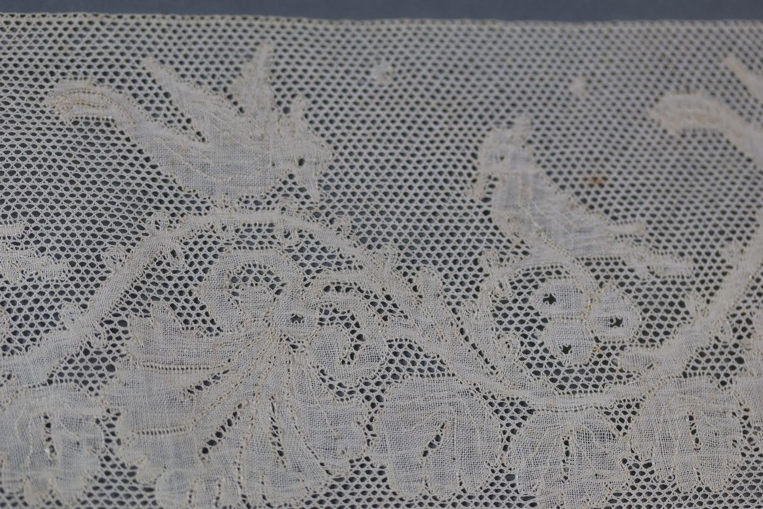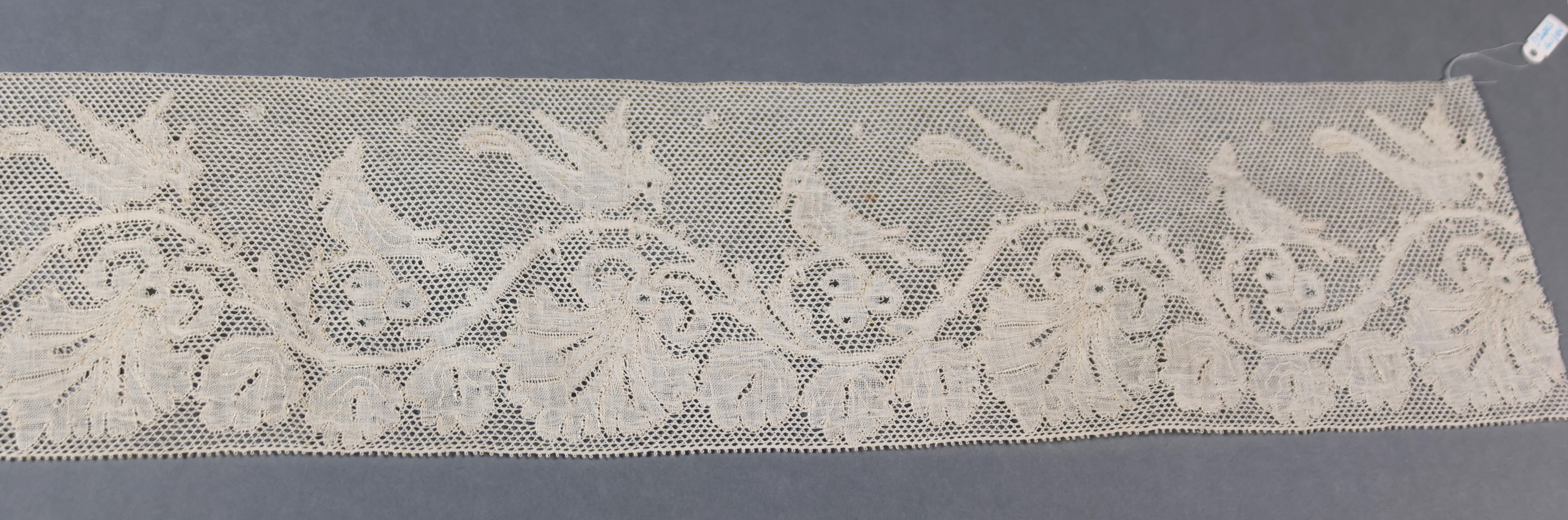 Décor d'oiseaux huppés voletants et posés sur une guirlande avec feuilles et fruits stylisés. La longueur de la pièce indique qu’il s’agit d’un bord pour linge domestique.
