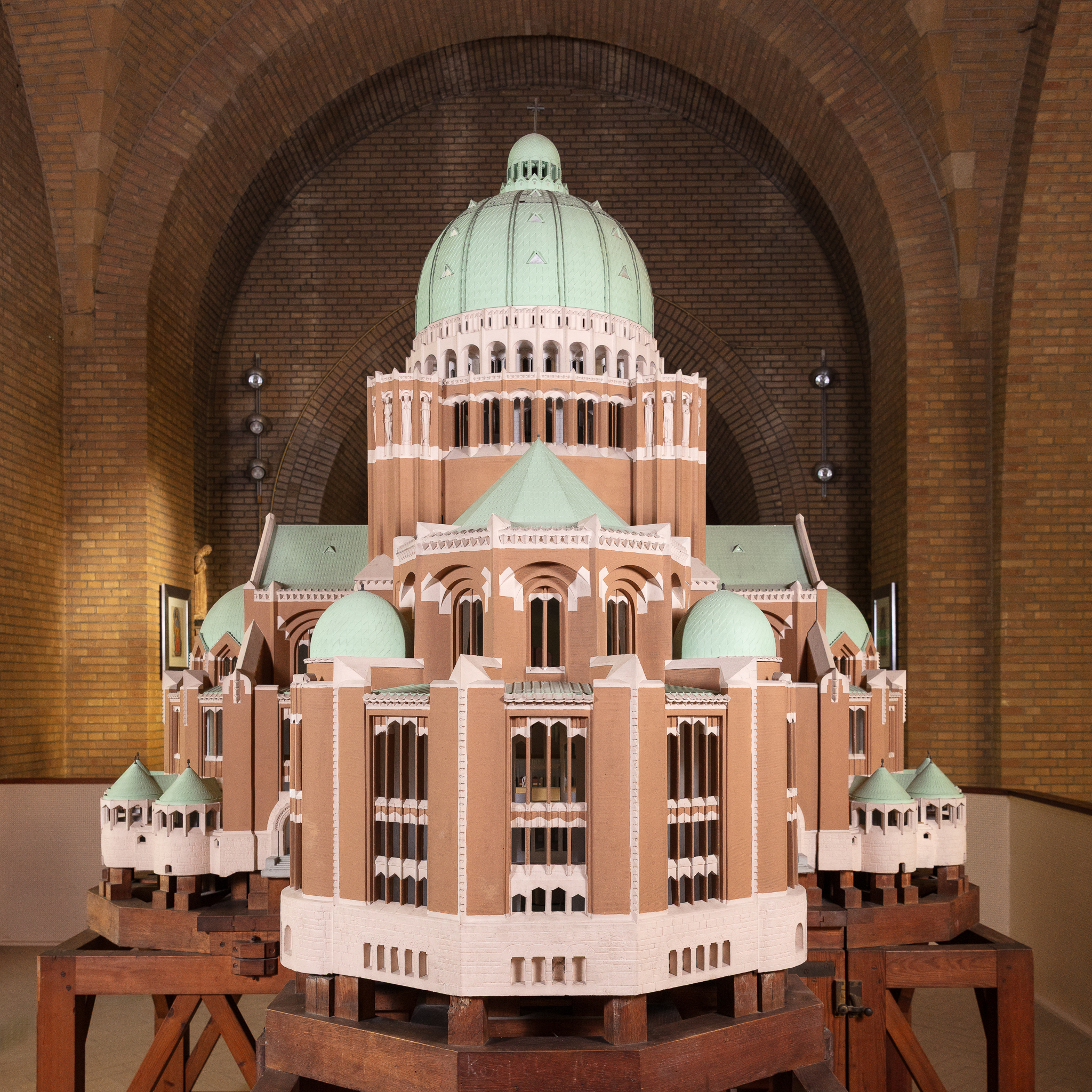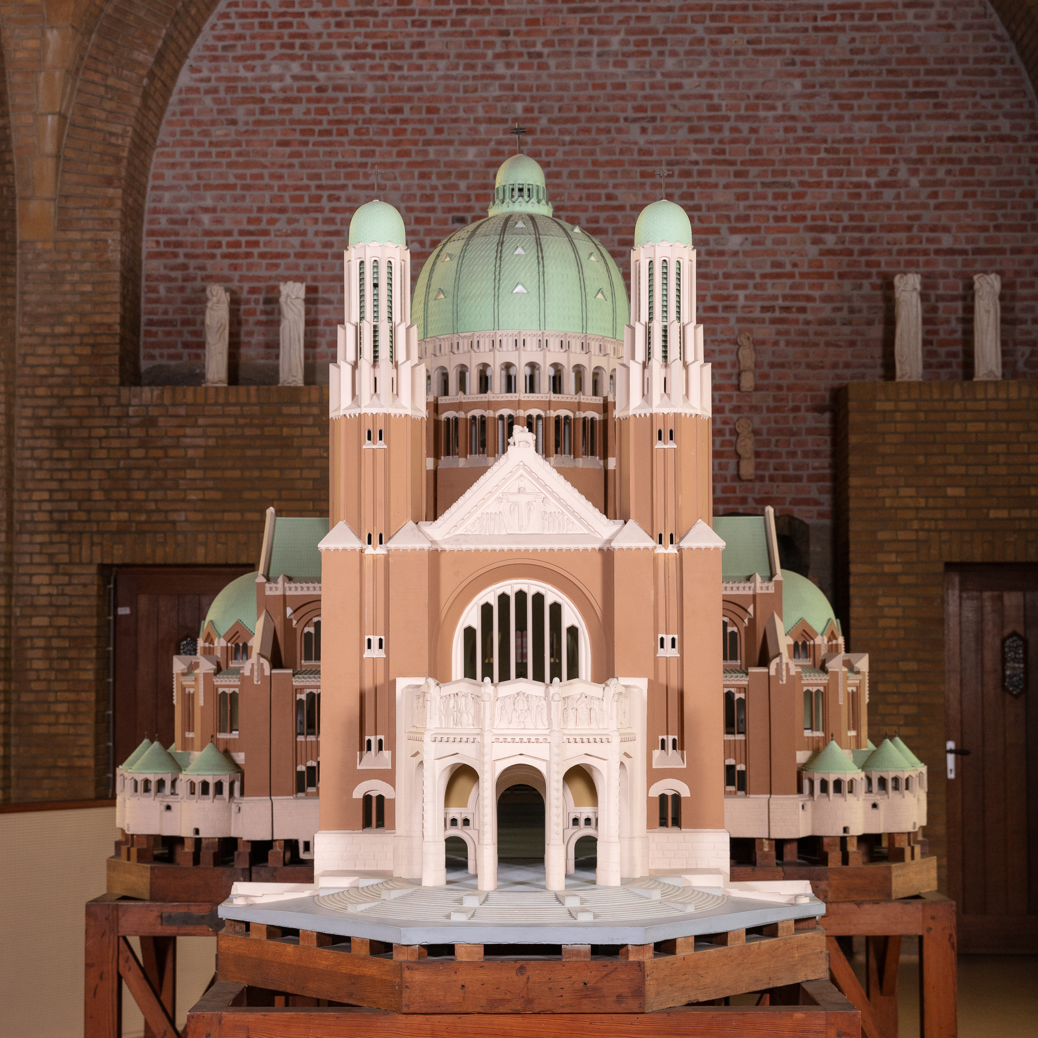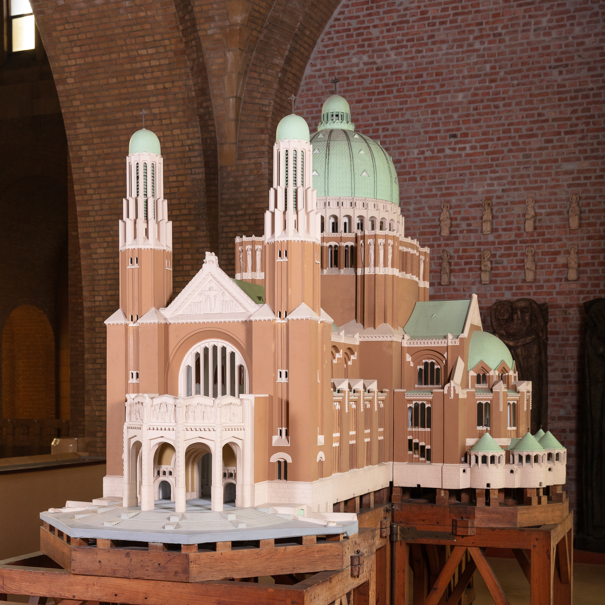 Alors que le plan initial de la Basilique, conçu par l’architecte Pierre Langerock en 1905, est abandonné après la Première Guerre mondiale, un nouveau projet est proposé par l’architecte Albert Van Huffel en 1921. Avant de l’accepter, la Commission royale des Monuments demande qu’en plus des plans, l’architecte réalise une maquette de l’édifice projeté, à l’échelle 1/40e. Celle-ci est présentée à l’Exposition internationale des Arts Décoratifs de Paris en 1925. Van Huffel y remporte le Grand Prix d’architecture. Cette exposition, donnant son nom à l’ « Art Déco », avait pour but de renouveler l’art décoratif français, de lancer un nouveau style qui ferait fi de toute imitation, copie ou reproduction des styles passés. Le pavillon belge est dessiné par Victor Horta. En plus de sa maquette, Van Huffel y expose également du mobilier conçu pour la Maison de décoration Rosel. La maquette de la Basilique est ensuite présentée à plusieurs reprises dans les expositions du mouvement De Pelgrim, plaidant pour un renouveau de l’art religieux. La maquette en plâtre est exceptionnelle par la précision des détails rendus, tant à l’extérieur qu’à l’intérieur du bâtiment. Elle aurait été réalisée par les ateliers du sculpteur ornemaniste Alban Chambon.
