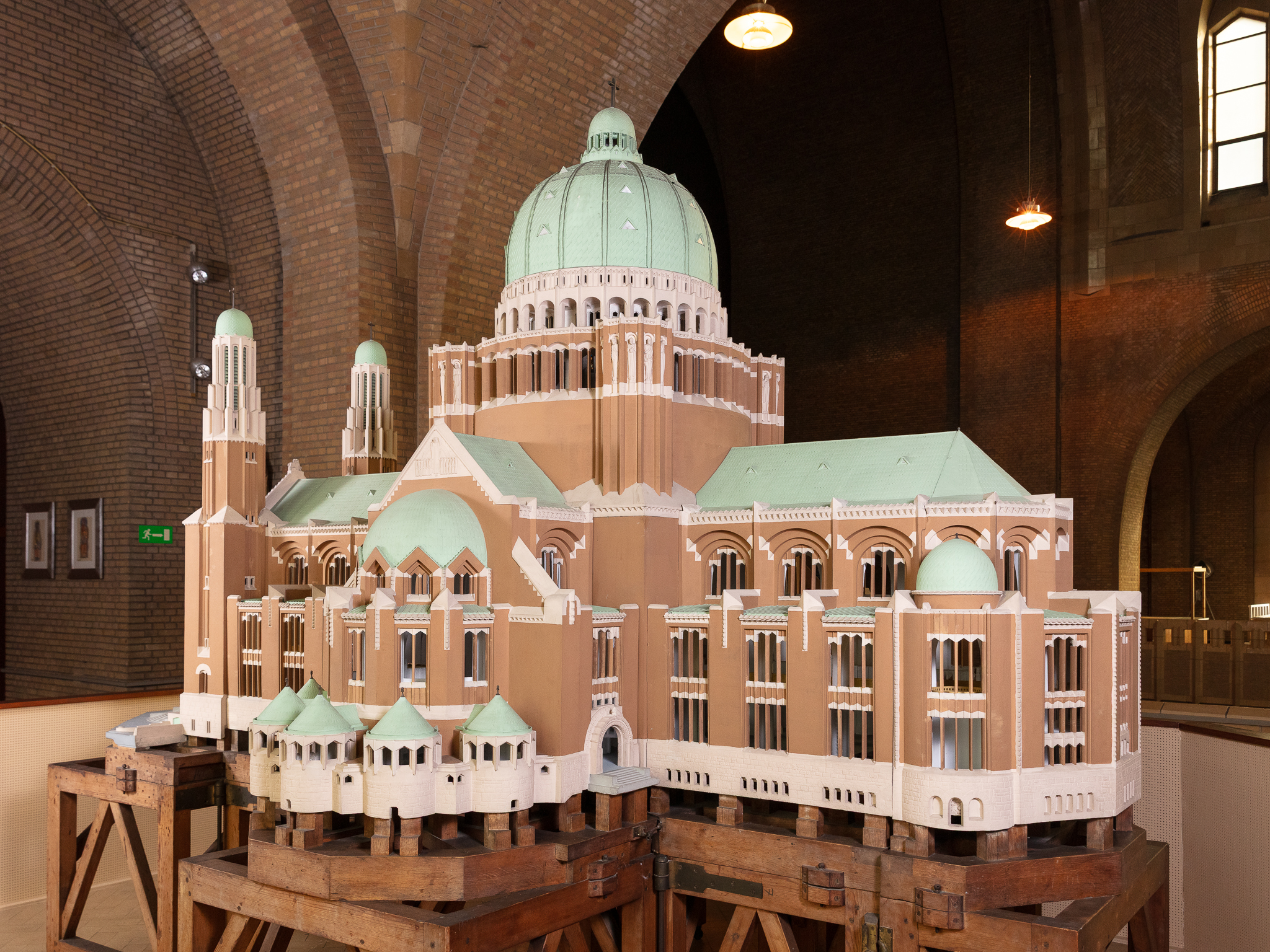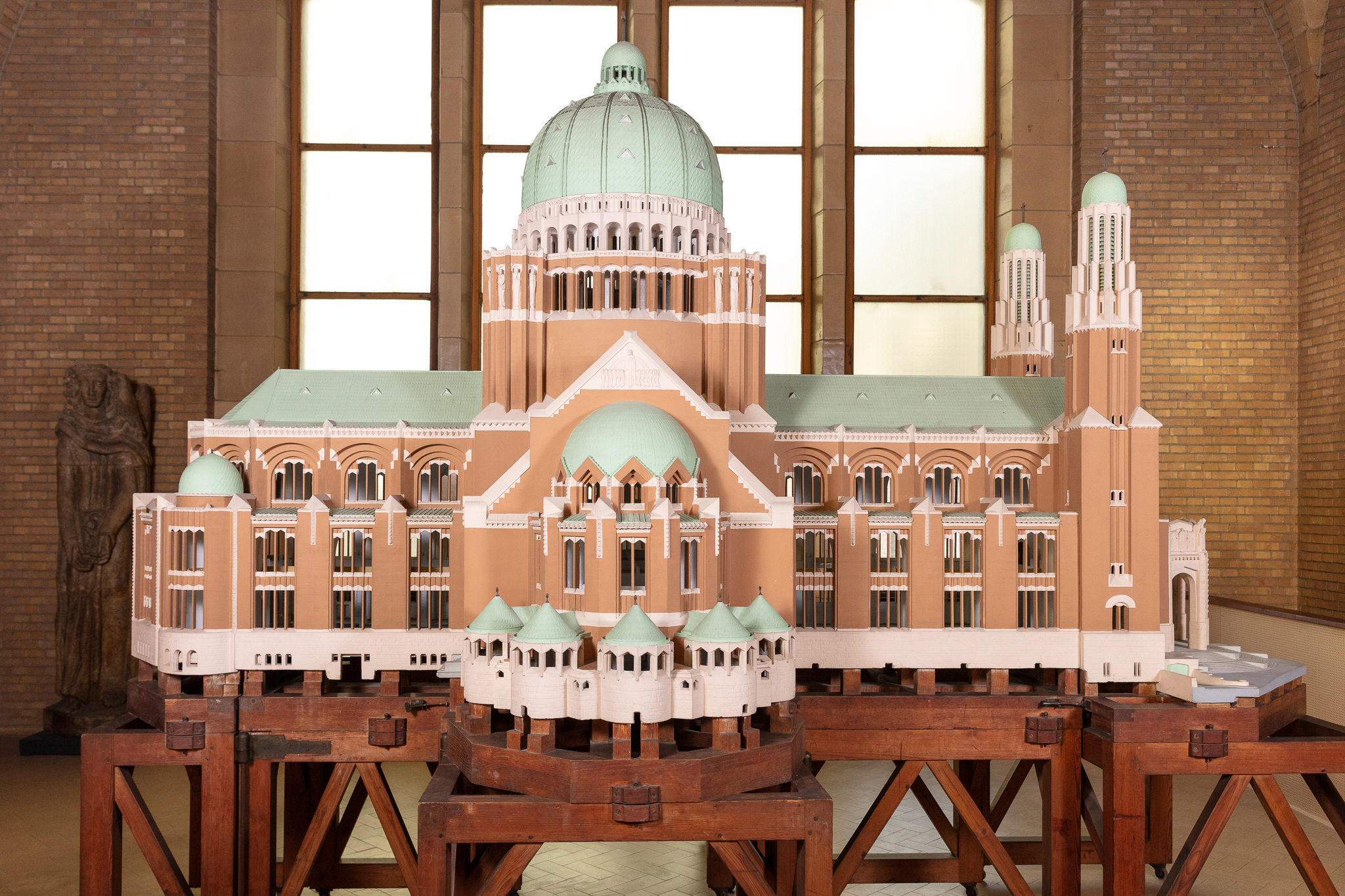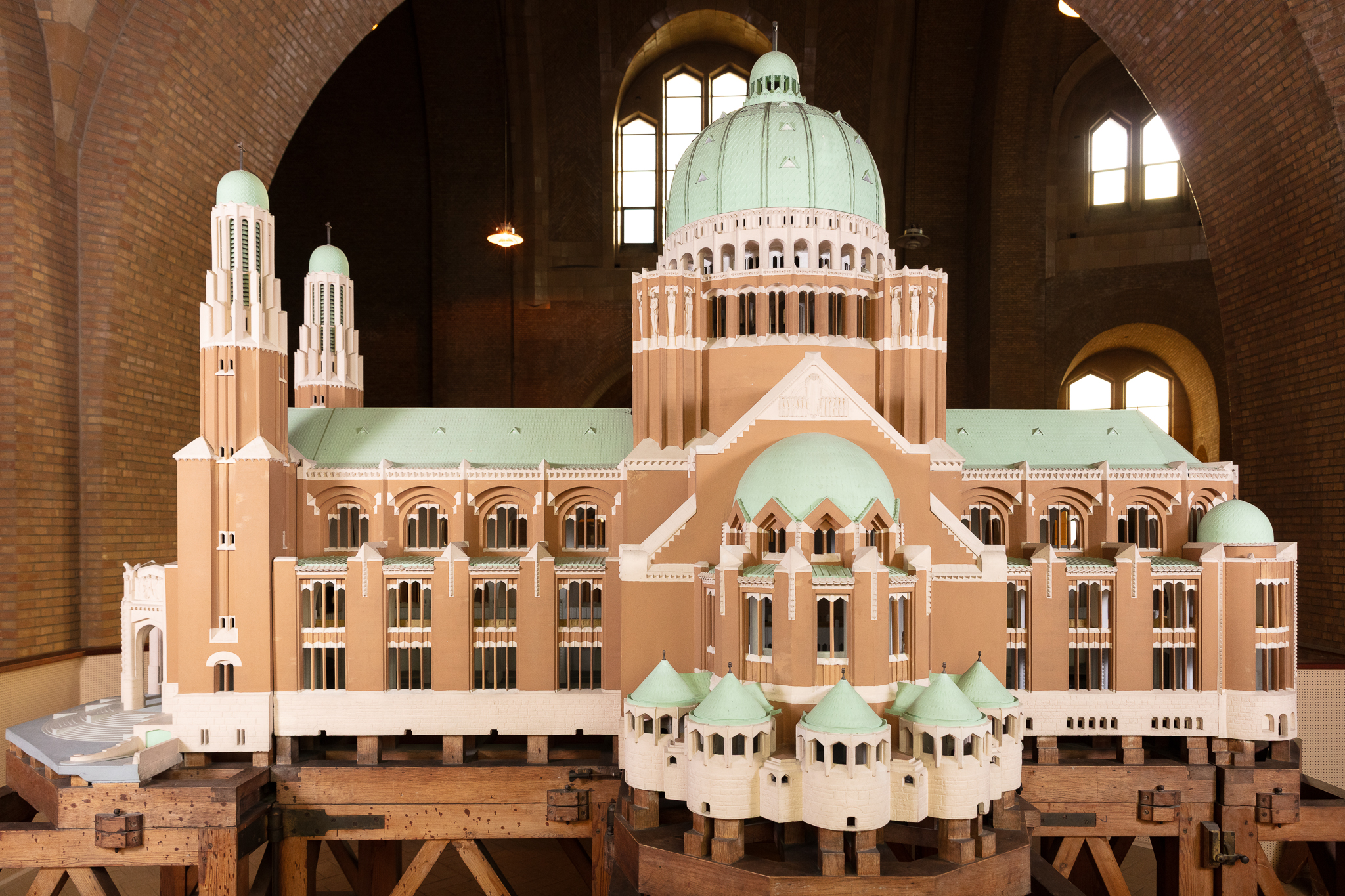 Alors que le plan initial de la Basilique, conçu par l’architecte Pierre Langerock en 1905, est abandonné après la Première Guerre mondiale, un nouveau projet est proposé par l’architecte Albert Van Huffel en 1921. Avant de l’accepter, la Commission royale des Monuments demande qu’en plus des plans, l’architecte réalise une maquette de l’édifice projeté, à l’échelle 1/40e. Celle-ci est présentée à l’Exposition internationale des Arts Décoratifs de Paris en 1925. Van Huffel y remporte le Grand Prix d’architecture. Cette exposition, donnant son nom à l’ « Art Déco », avait pour but de renouveler l’art décoratif français, de lancer un nouveau style qui ferait fi de toute imitation, copie ou reproduction des styles passés. Le pavillon belge est dessiné par Victor Horta. En plus de sa maquette, Van Huffel y expose également du mobilier conçu pour la Maison de décoration Rosel. La maquette de la Basilique est ensuite présentée à plusieurs reprises dans les expositions du mouvement De Pelgrim, plaidant pour un renouveau de l’art religieux. La maquette en plâtre est exceptionnelle par la précision des détails rendus, tant à l’extérieur qu’à l’intérieur du bâtiment. Elle aurait été réalisée par les ateliers du sculpteur ornemaniste Alban Chambon.