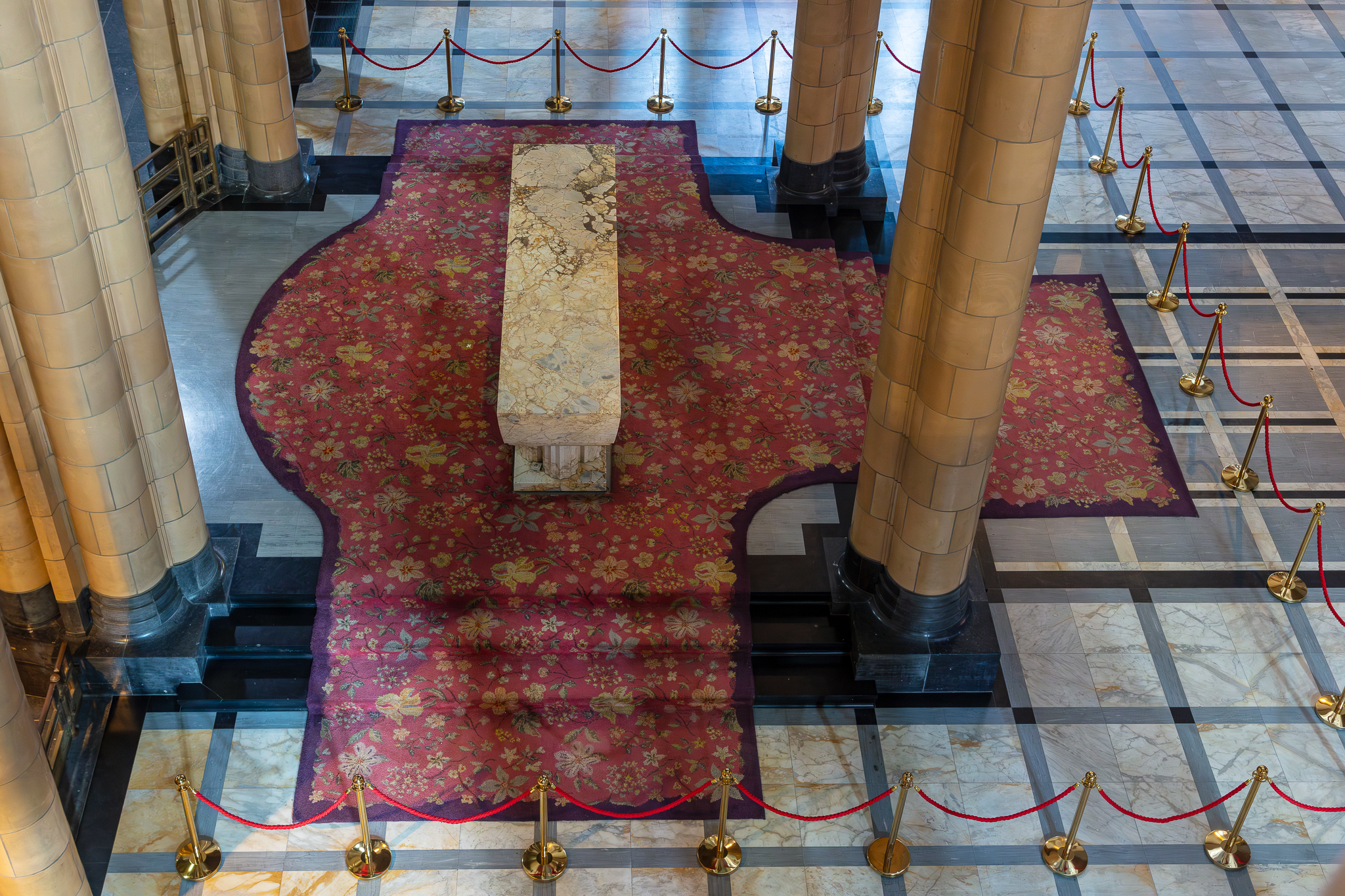 Tapis de l'Autel Majeur, sous le ciborium, réalisé en quatre morceaux, au point noué de Flandres. Il couvre les trois marches menant à l'autel et une partie du sol.