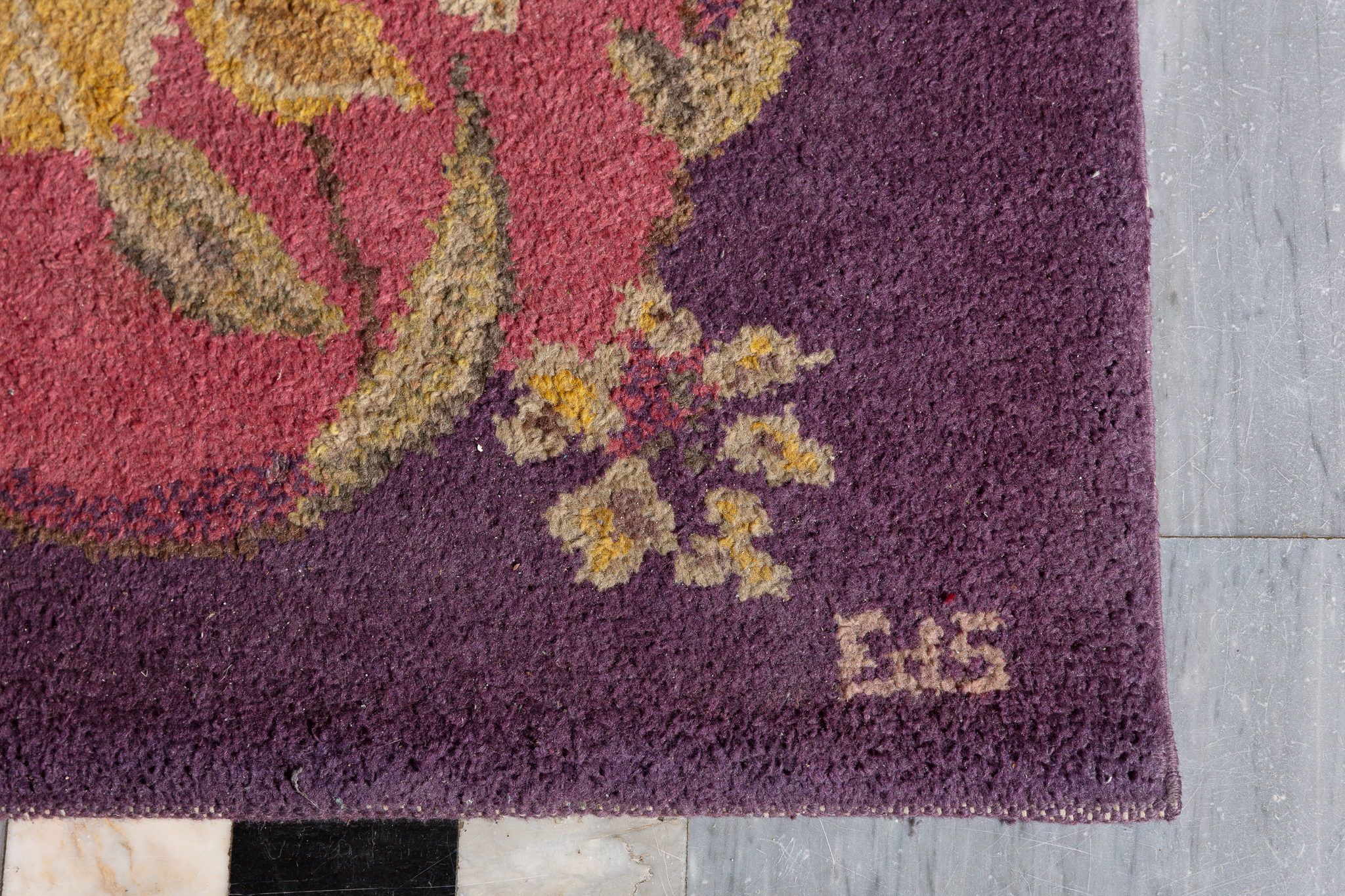 Les motifs végétaux sur fond amarante représenteraient tous les spécimens de la flore belge, parmi lesquels l'iris jaune est particulièrement mis en avant. Cette composition pourrait évoquer les mille-fleurs des tapisseries médiévales bruxelloises.