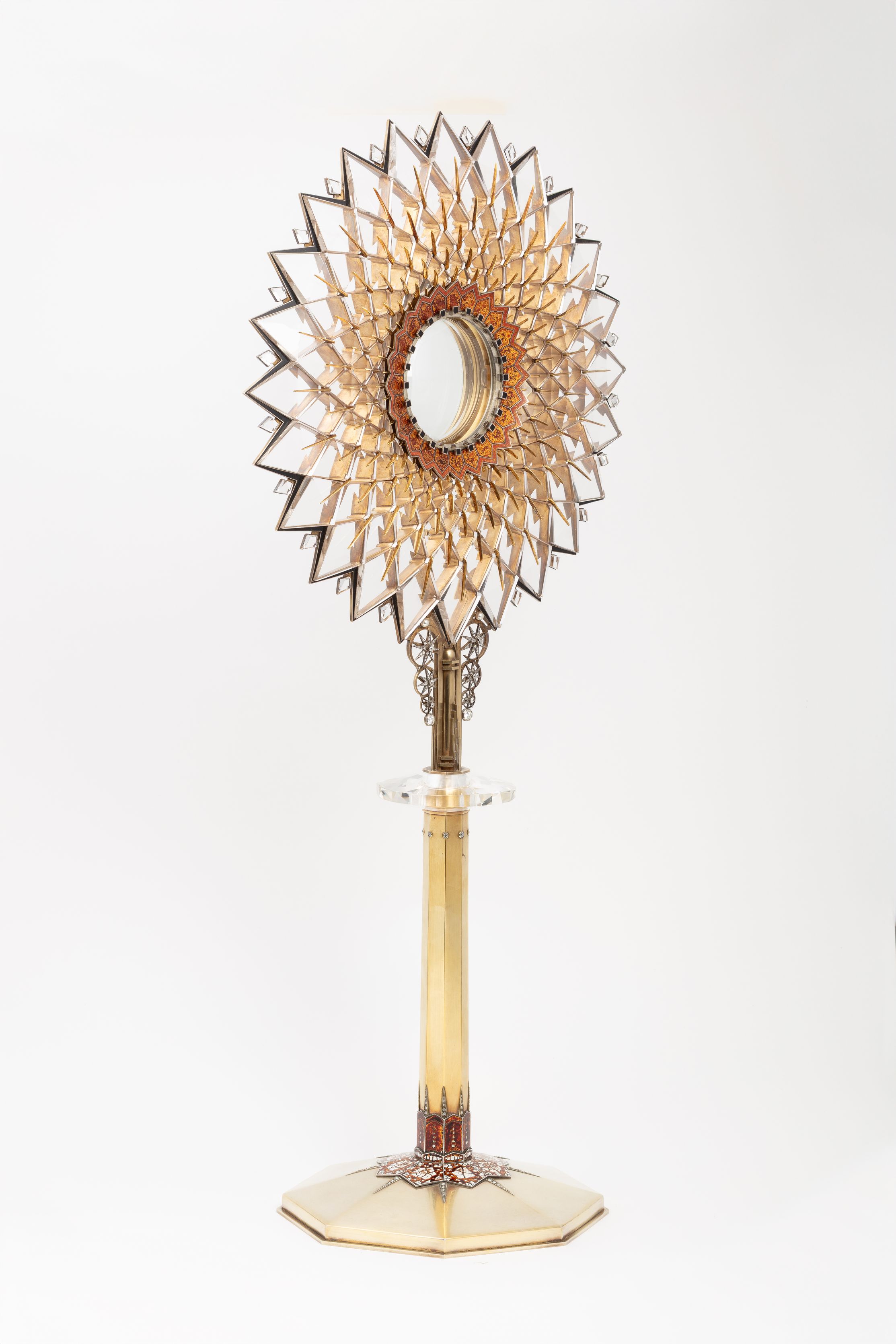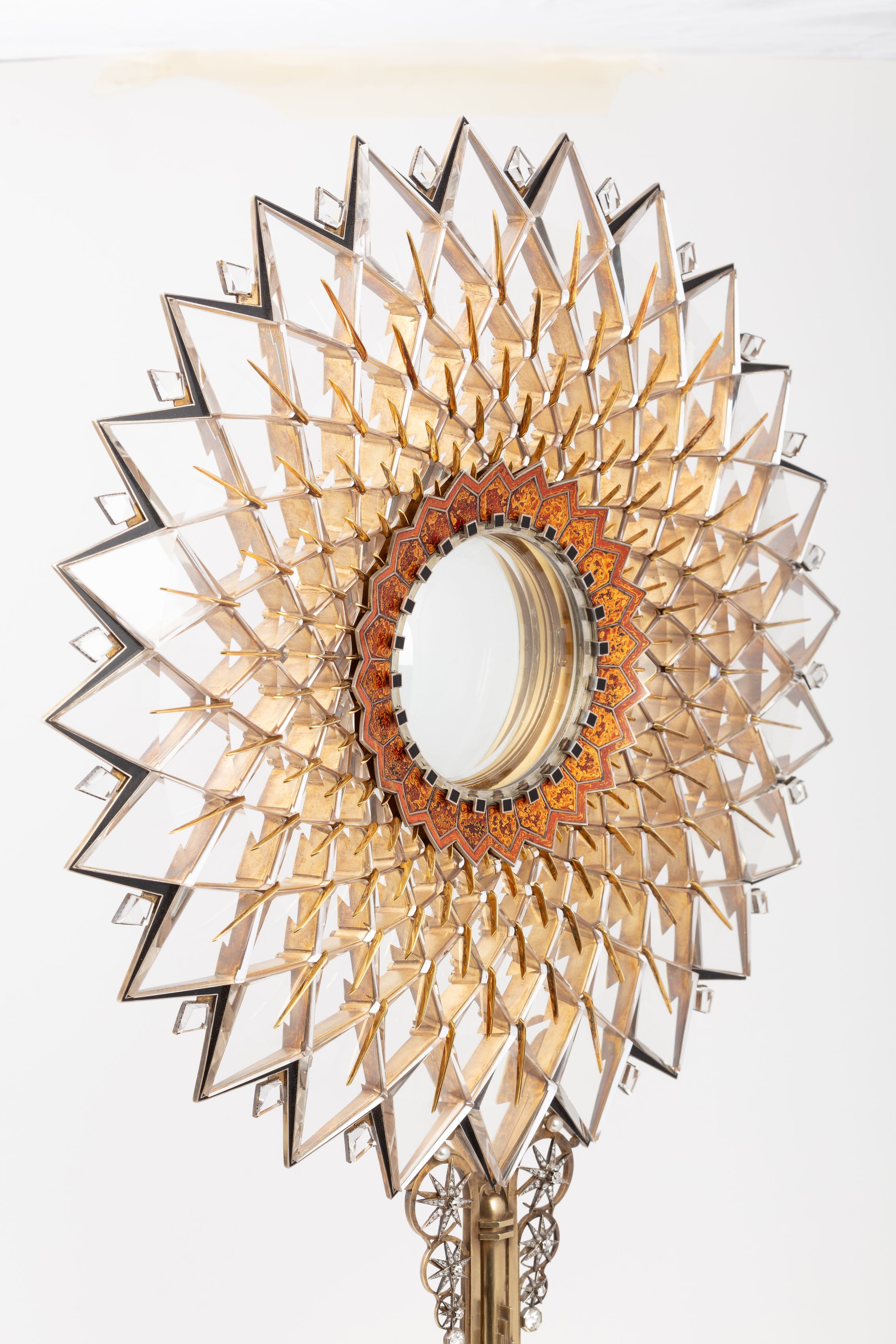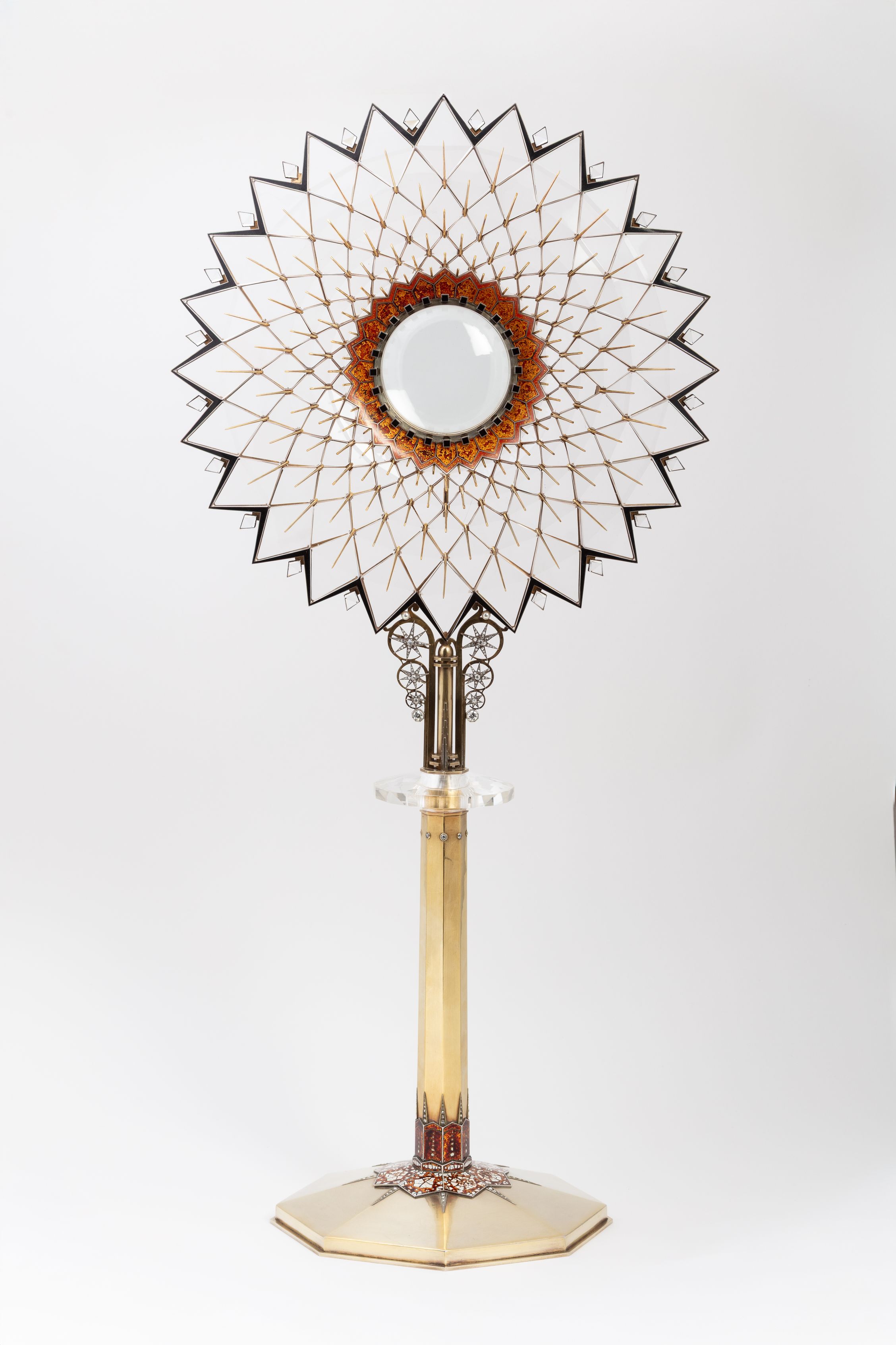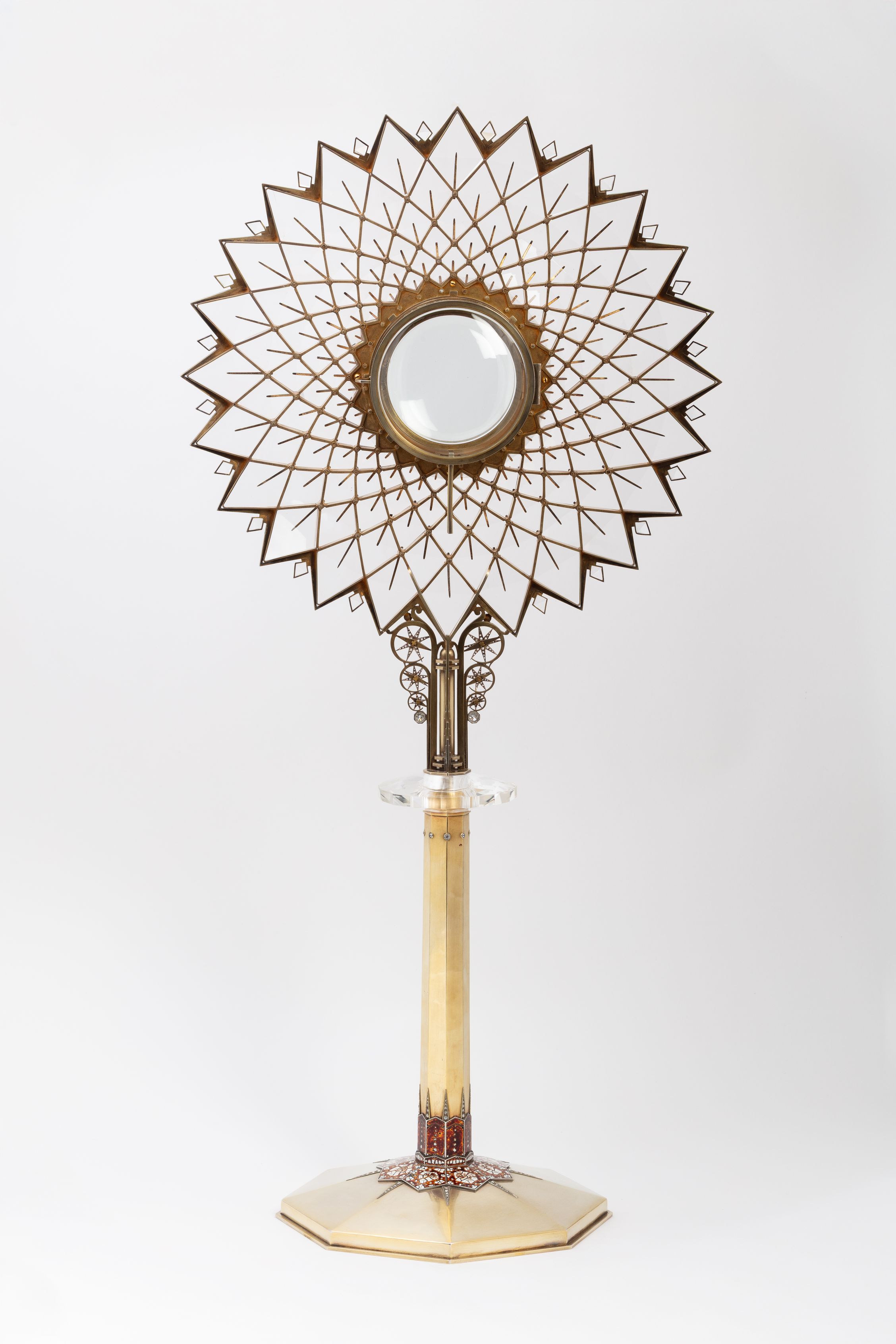 L’ostensoir est un objet destiné à présenter une hostie consacrée à l’adoration des fidèles. Le Saint-Sacrement est abrité dans le compartiment central circulaire, muni d’une lunule, et dont le verre grossissant permet une vision précise de l’hostie, même de loin. Des motifs géométriques, faits à la laque japonaise or, rouge et noir, avec incrustations, ornent son pourtour. Les agrafes rayonnantes, disposées de manière à former une résille métallique, et l’utilisation du cristal de roche taillé, matériau translucide à travers duquel la lumière se réfléchit, donnent à l’ostensoir son aspect solaire, d’un point de vue formel aussi bien que symbolique, éclairant littéralement la contemplation des fidèles. Le pied, à huit pans coupés, est orné de motifs faits à la laque avec incrustations de coquilles d’œuf. La tige est, elle aussi, de forme octogonale, et parée d’un nœud en cristal et de huit brillants. Le haut de la tige est décoré de perles et de motifs étoilés faits de diamants, provenant de bijoux anciens. Ces précieux éléments, de taille croissante, créent la jonction avec la partie rayonnante.