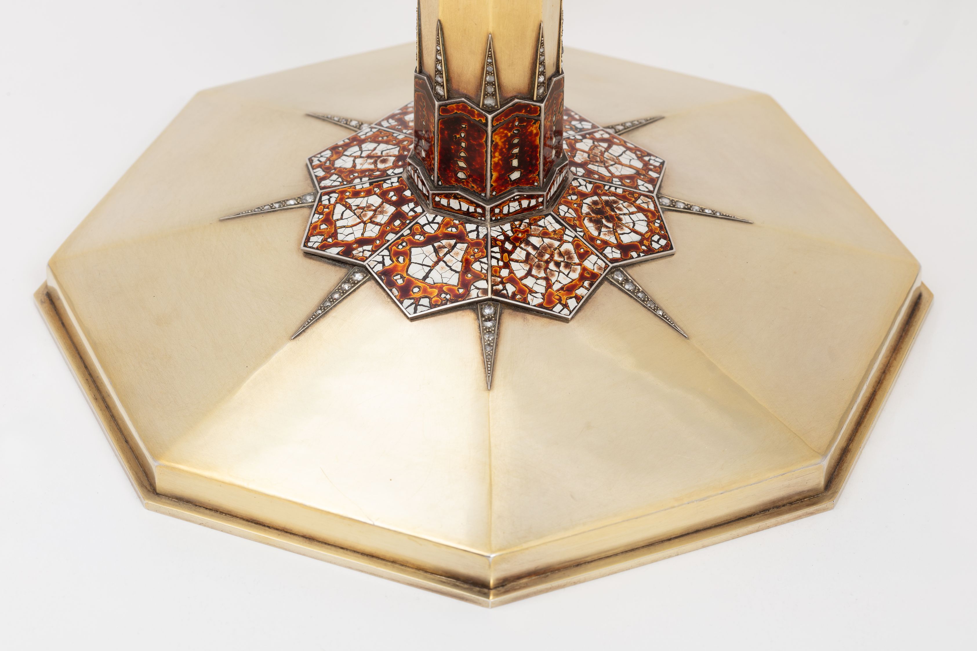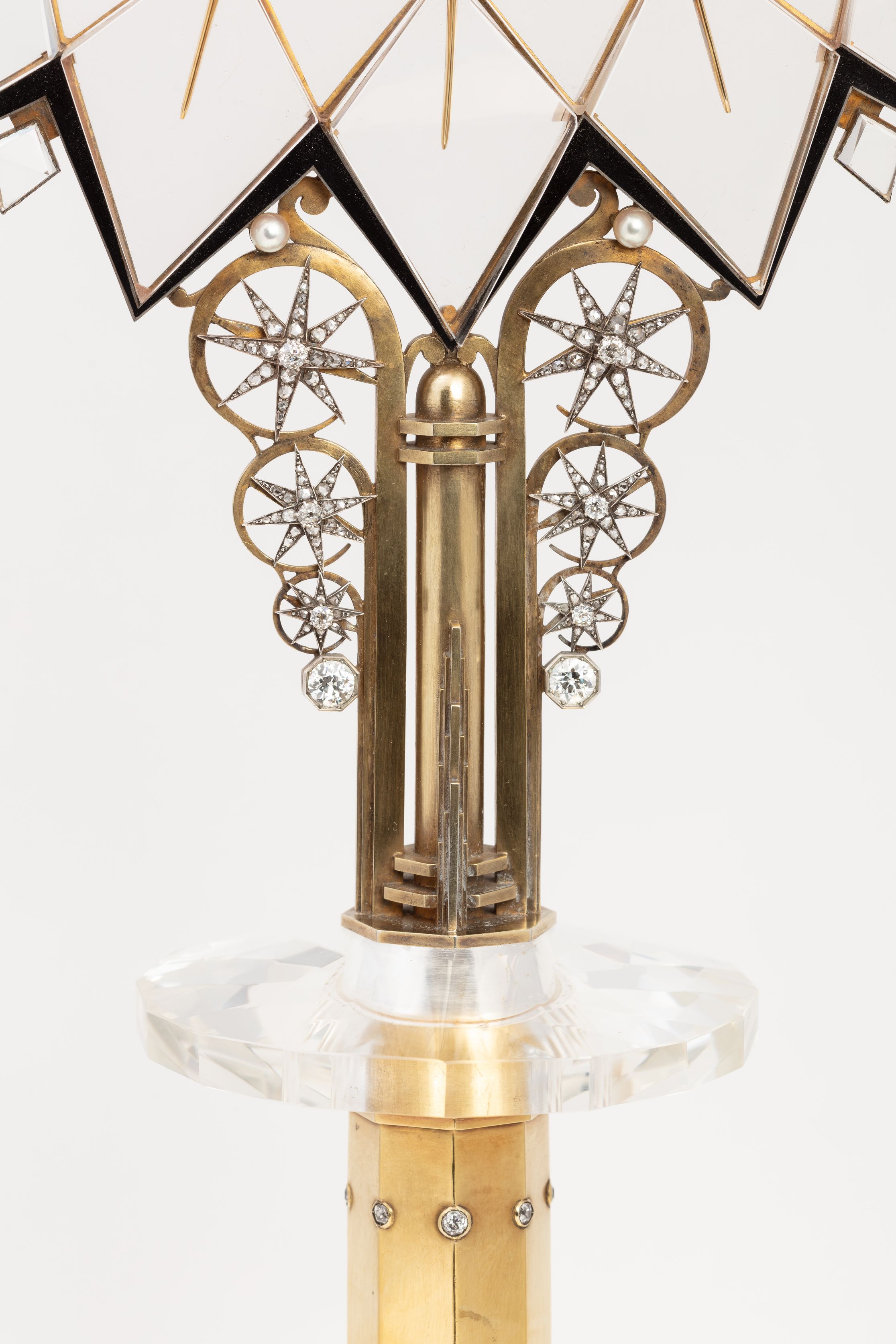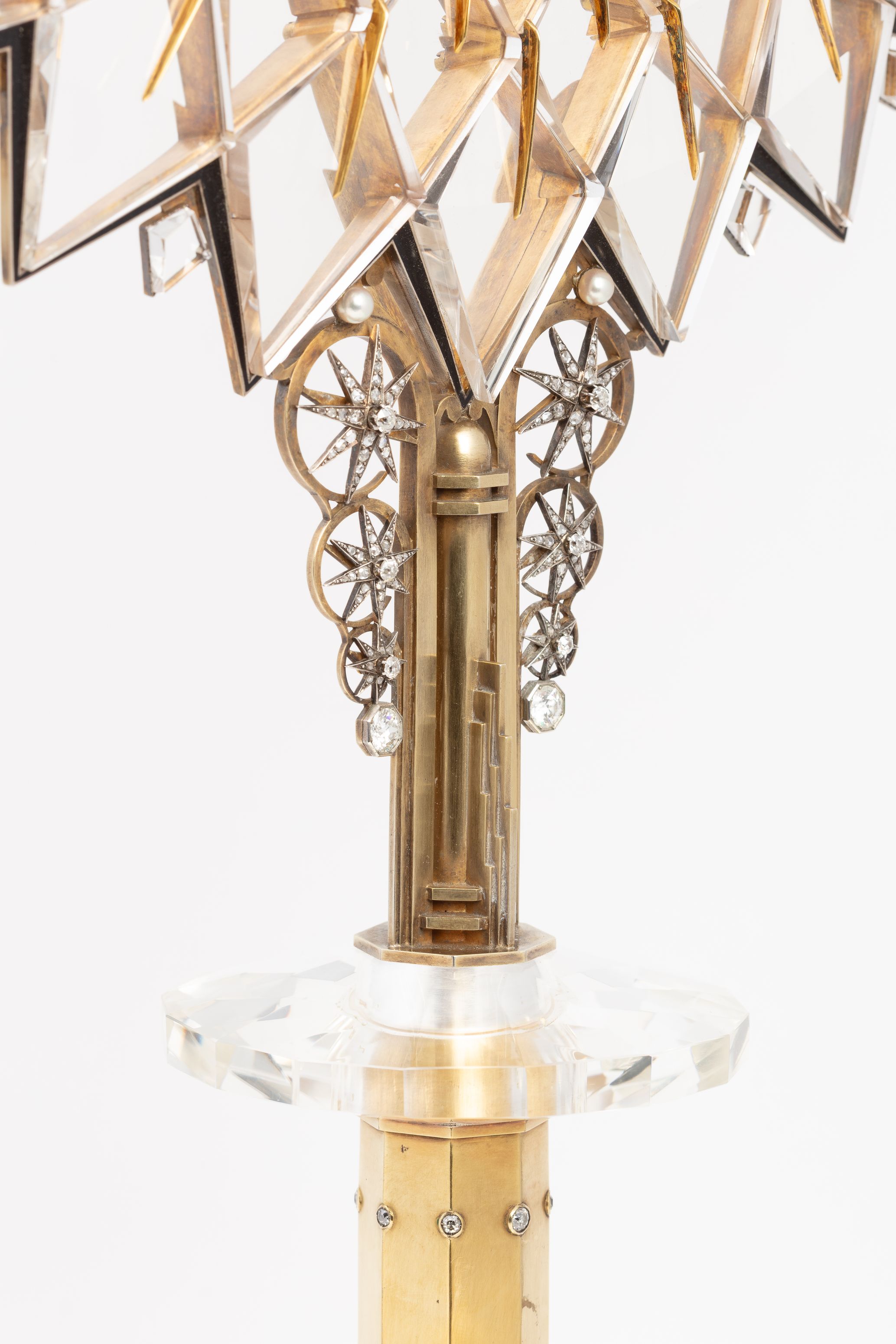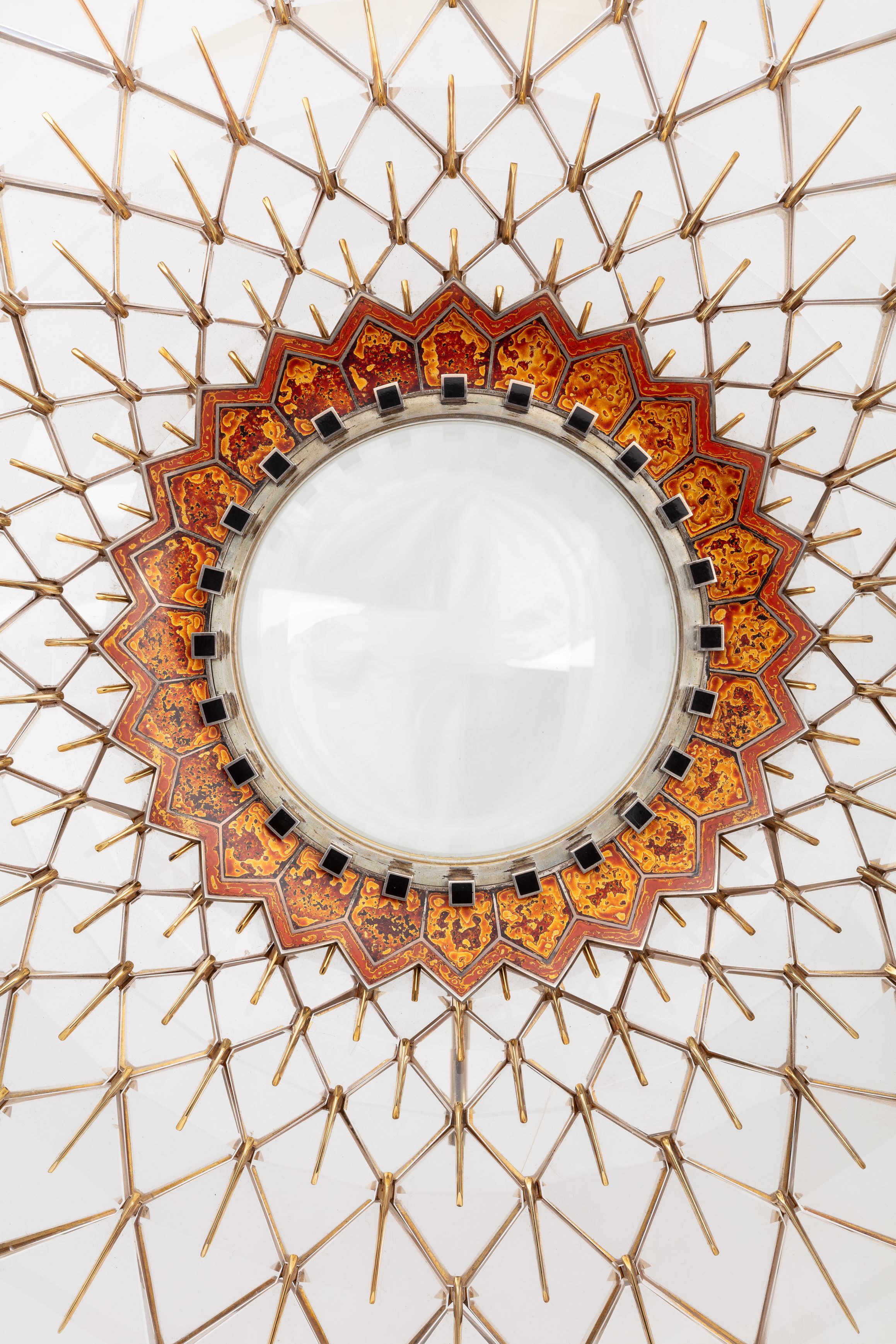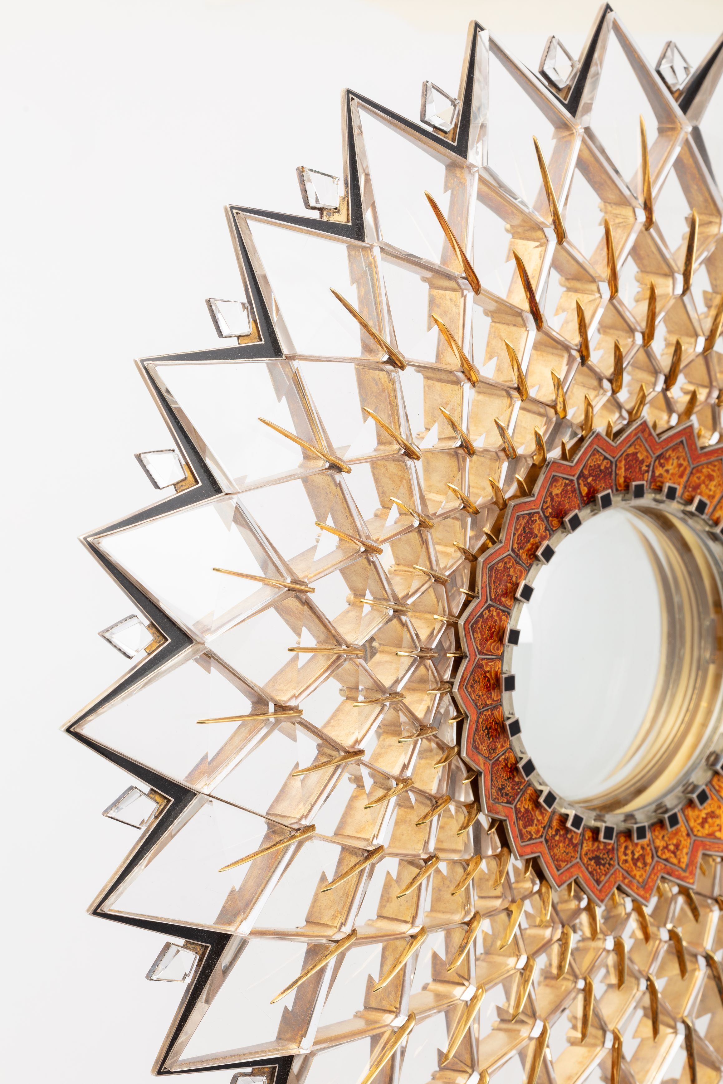 L’ostensoir est un objet destiné à présenter une hostie consacrée à l’adoration des fidèles. Le Saint-Sacrement est abrité dans le compartiment central circulaire, muni d’une lunule, et dont le verre grossissant permet une vision précise de l’hostie, même de loin. Des motifs géométriques, faits à la laque japonaise or, rouge et noir, avec incrustations, ornent son pourtour. Les agrafes rayonnantes, disposées de manière à former une résille métallique, et l’utilisation du cristal de roche taillé, matériau translucide à travers duquel la lumière se réfléchit, donnent à l’ostensoir son aspect solaire, d’un point de vue formel aussi bien que symbolique, éclairant littéralement la contemplation des fidèles. Le pied, à huit pans coupés, est orné de motifs faits à la laque avec incrustations de coquilles d’œuf. La tige est, elle aussi, de forme octogonale, et parée d’un nœud en cristal et de huit brillants. Le haut de la tige est décoré de perles et de motifs étoilés faits de diamants, provenant de bijoux anciens. Ces précieux éléments, de taille croissante, créent la jonction avec la partie rayonnante.