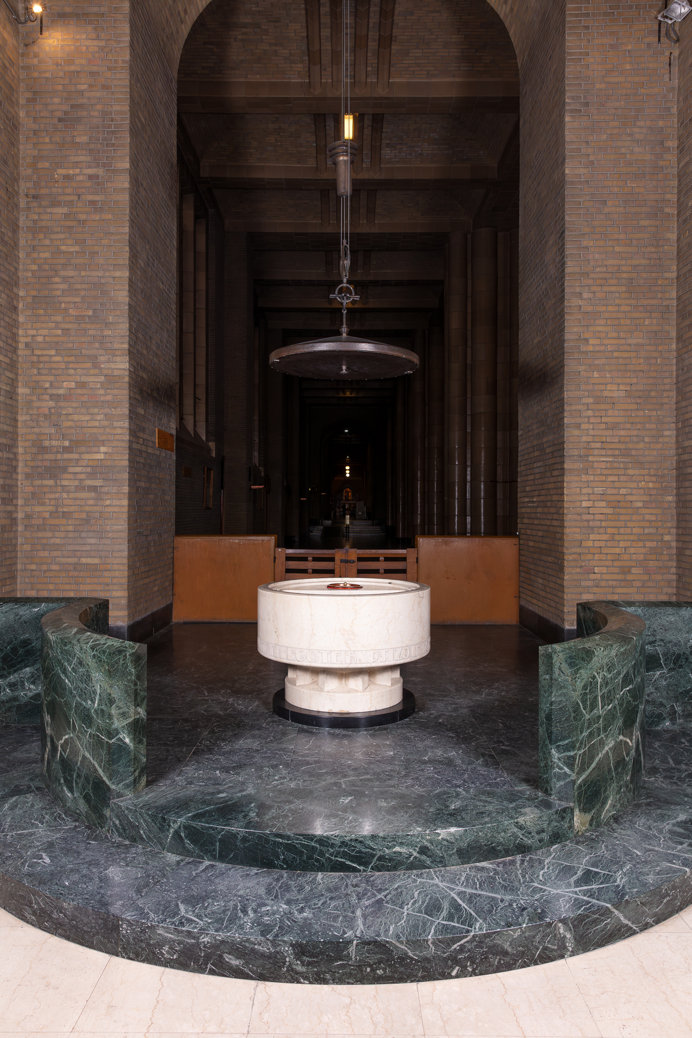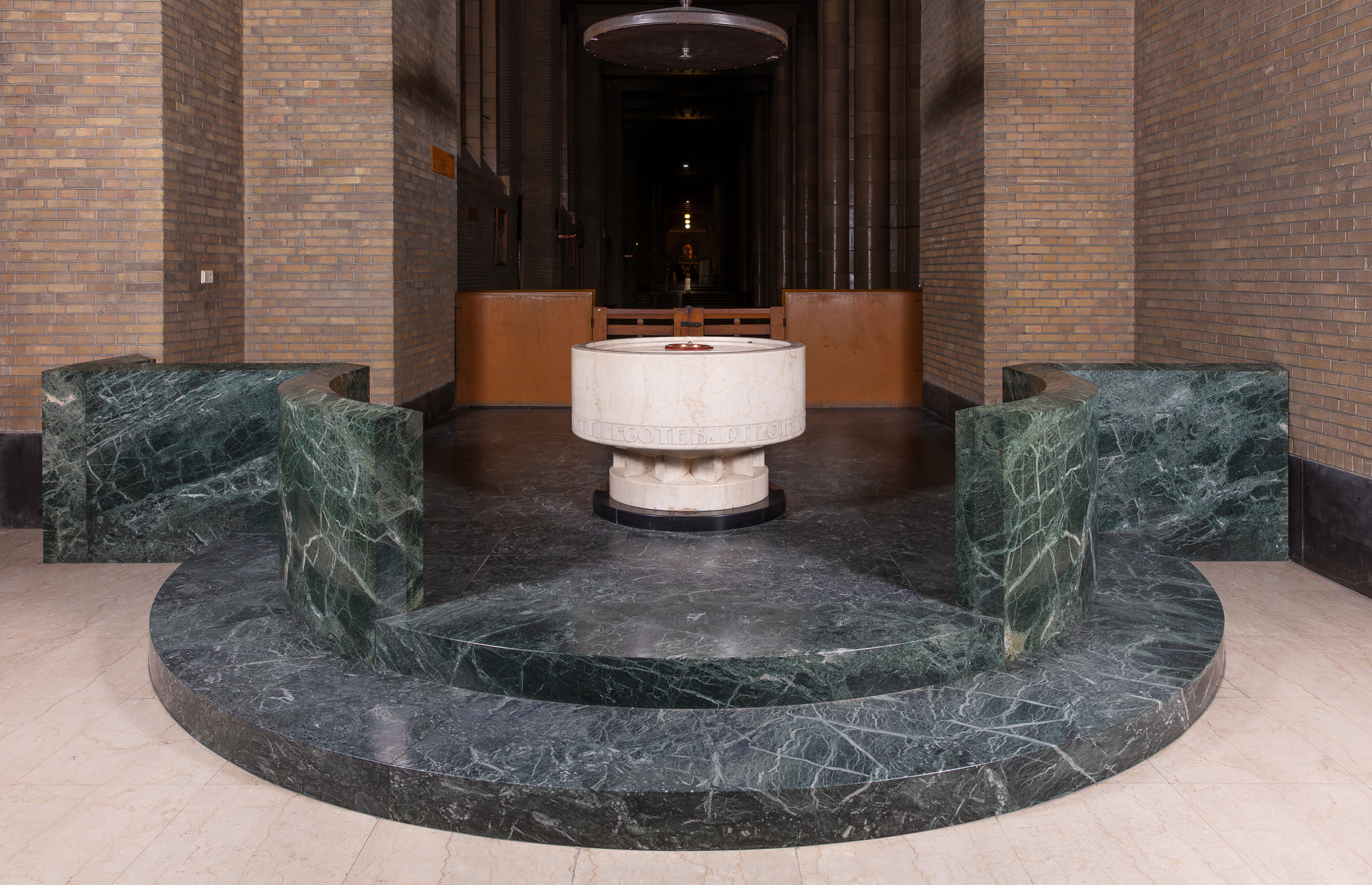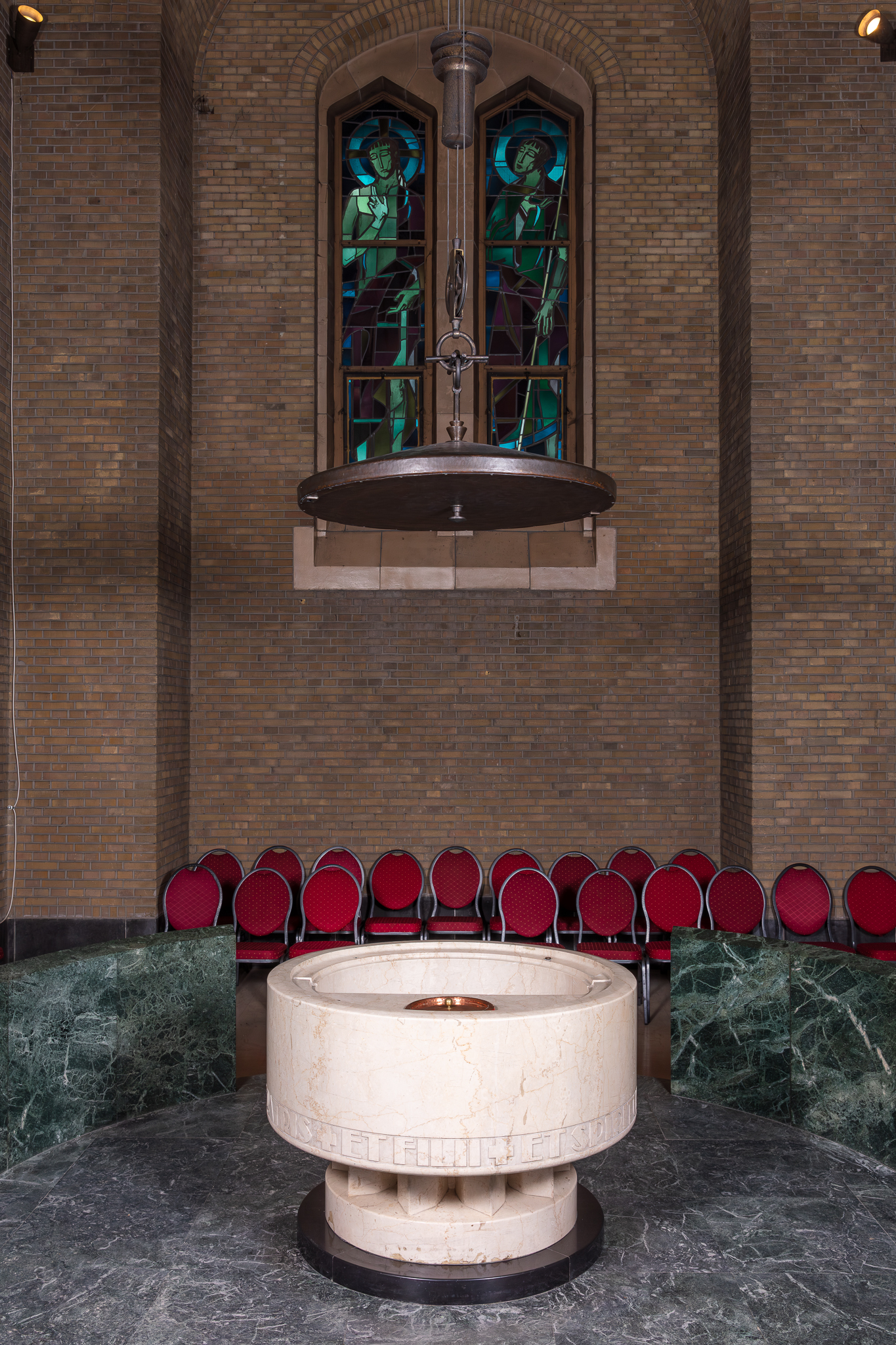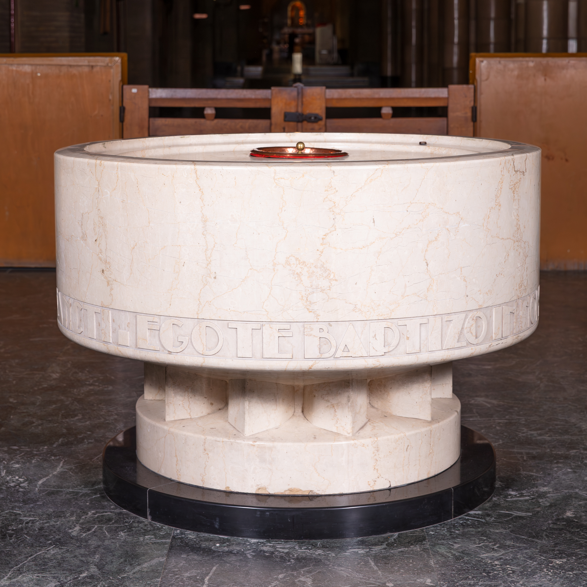 La cuve baptismale est disposée sur un podium surélevé (2 marches) en marbre vert, avec clôtures. Le couvercle s'actionne par un système de poulies. Au-dessus de la cuve se trouve un occulus à caissons en métal.