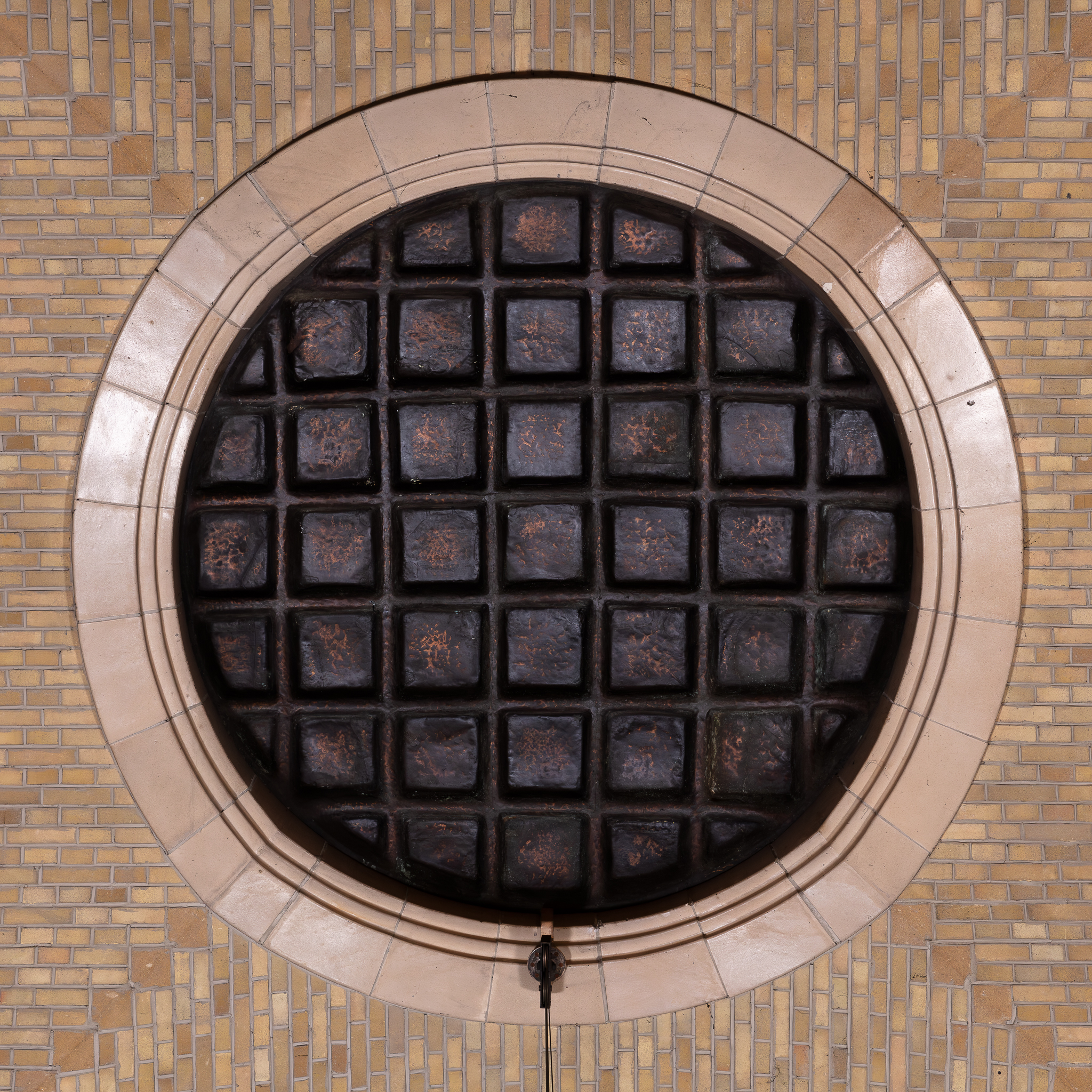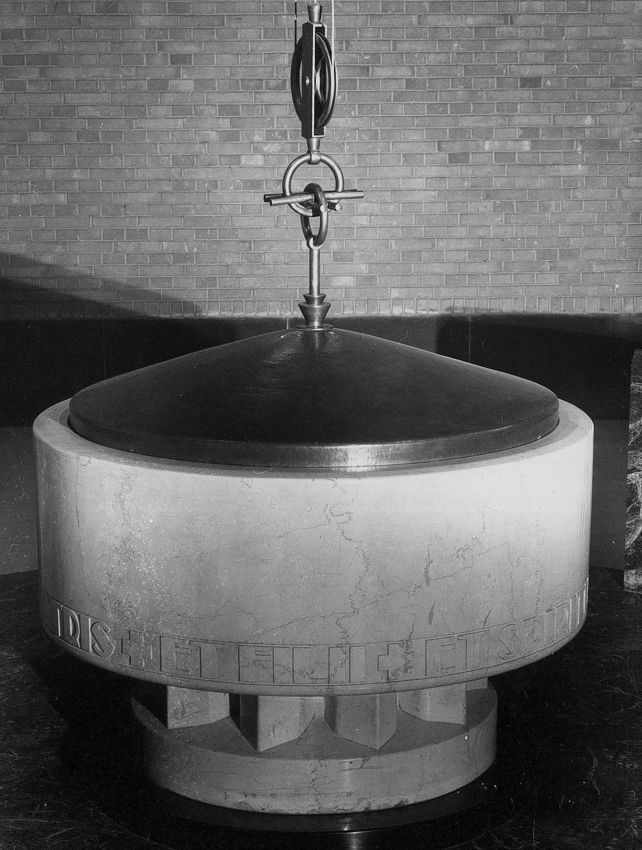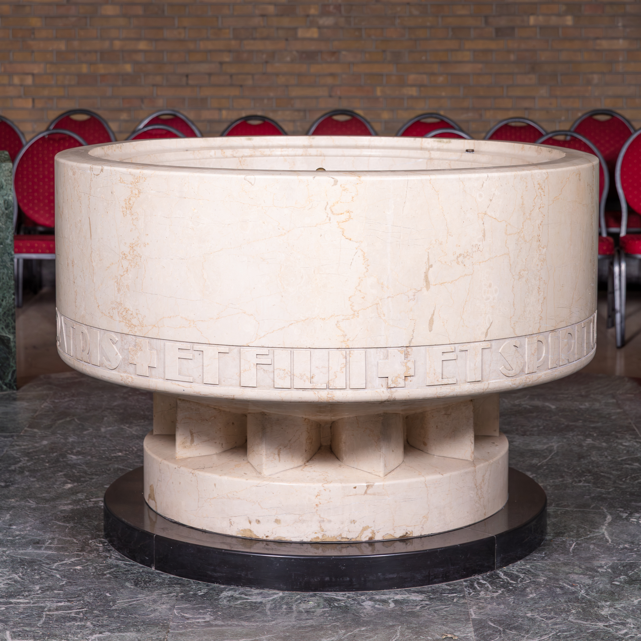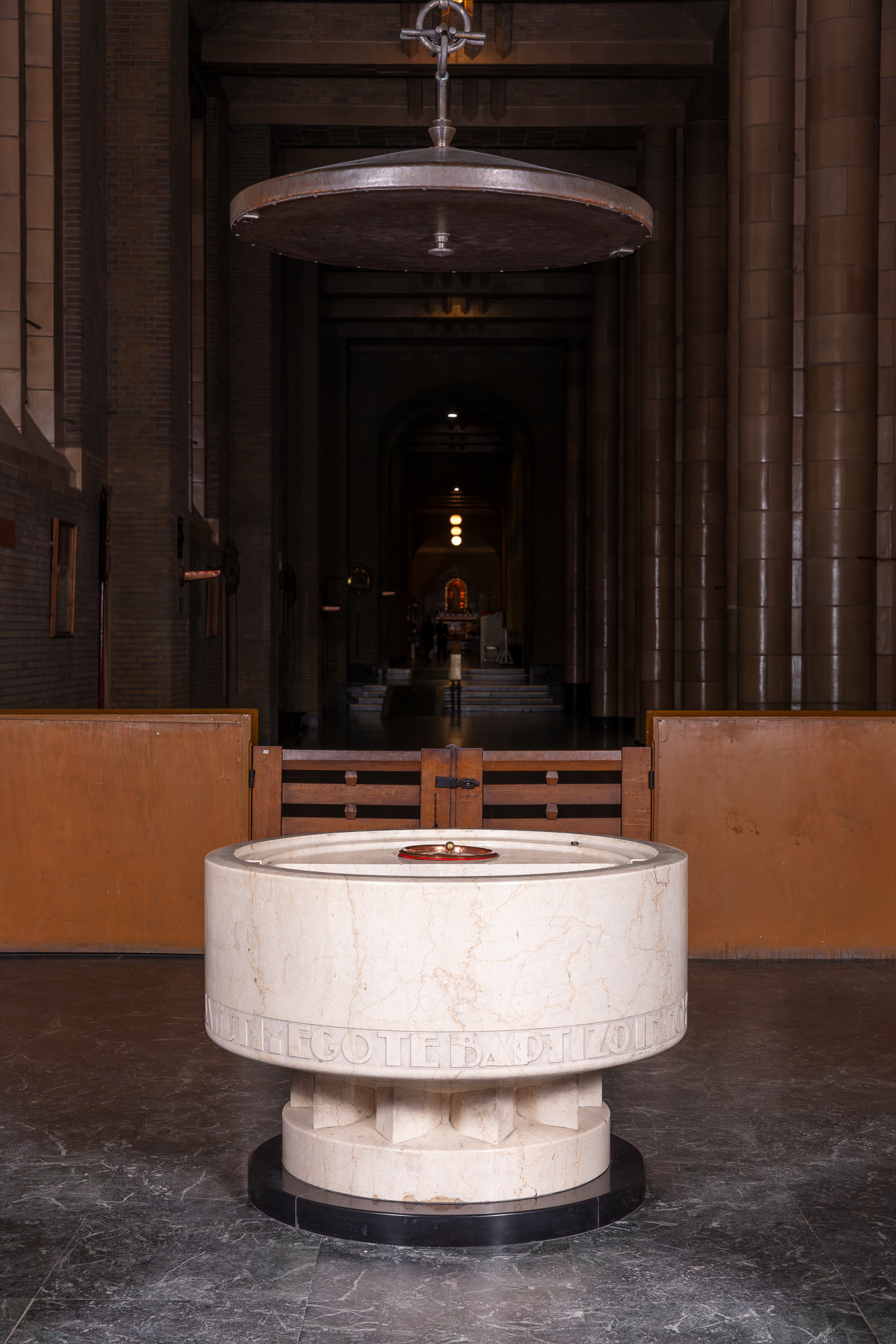 La cuve baptismale est disposée sur un podium surélevé (2 marches) en marbre vert, avec clôtures. Le couvercle s'actionne par un système de poulies. Au-dessus de la cuve se trouve un occulus à caissons en métal.