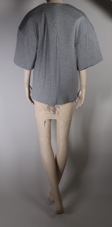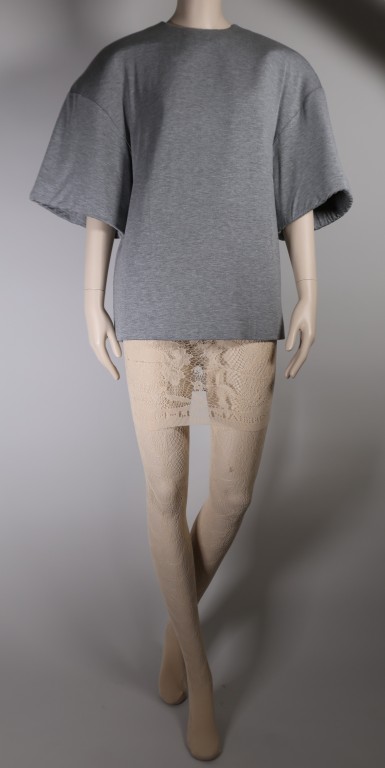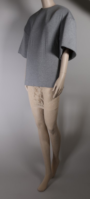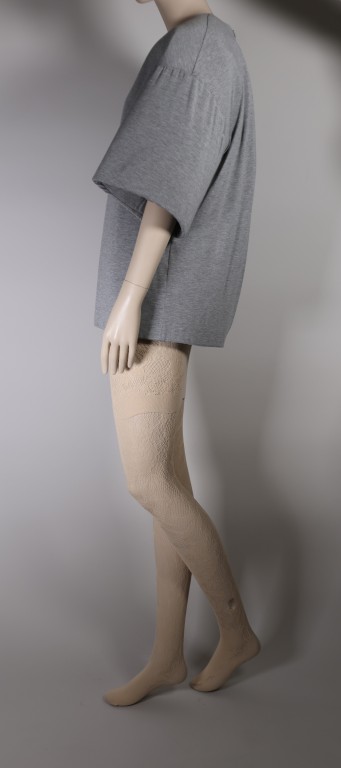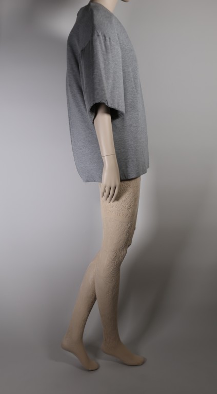 Jersey de coton gris et mousse plastique chair, maille de polyamide et élasthane chair et cuir beige.