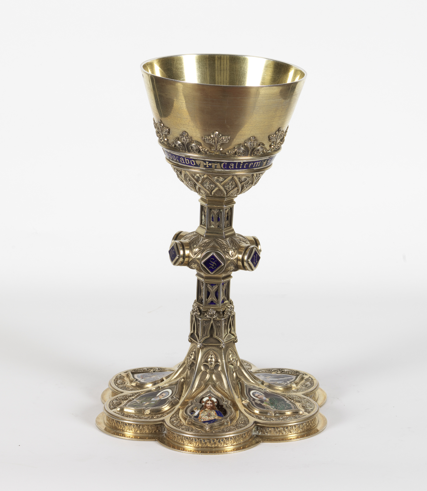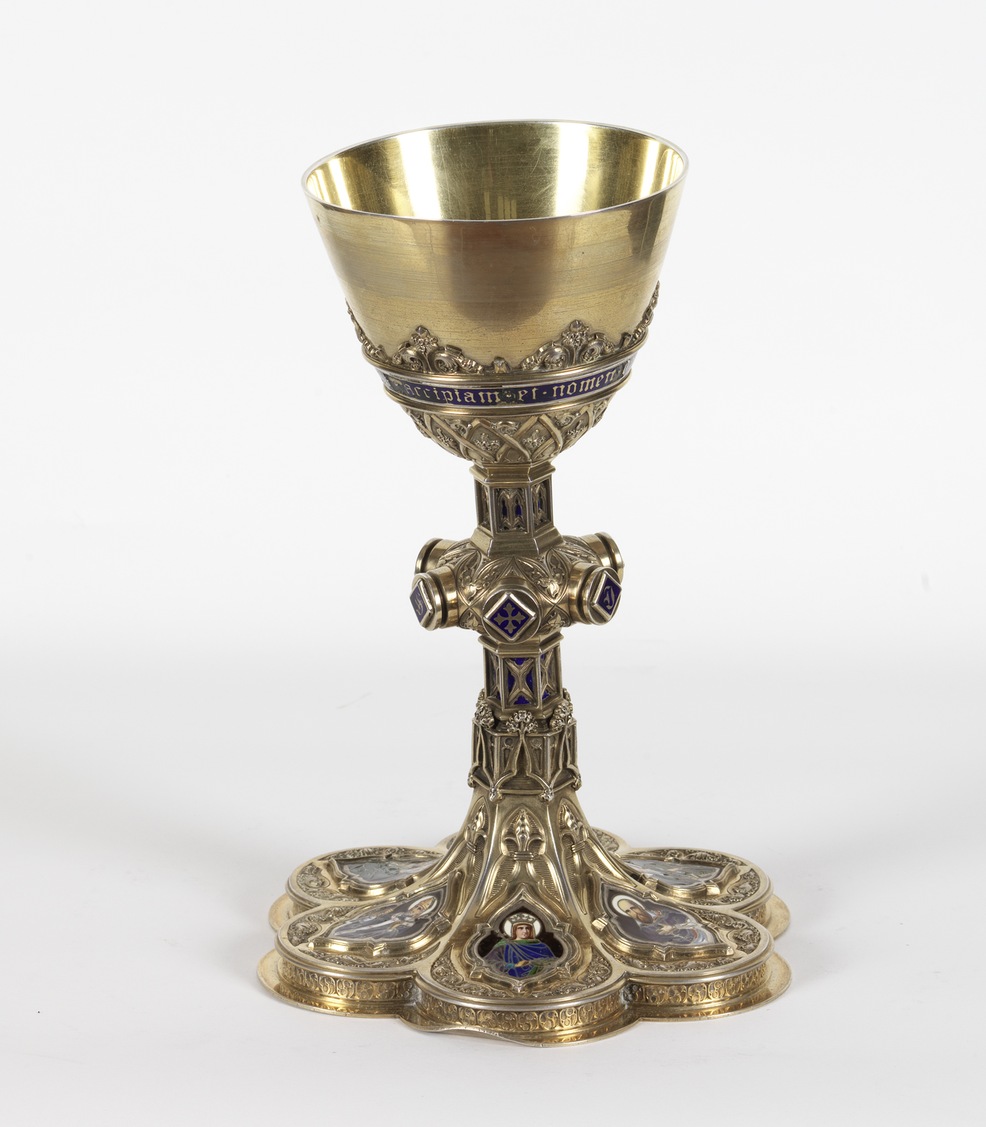 Le pied est orné de six médaillons en émaux cloisonnées et peints très délicats, figurant le Christ et des saints, en buste, et le nœud est orné de cabochons en émaux, avec les lettres J E S U S. De nombreux motifs et entrelacs ornementaux complètent la décoration de la pièce.