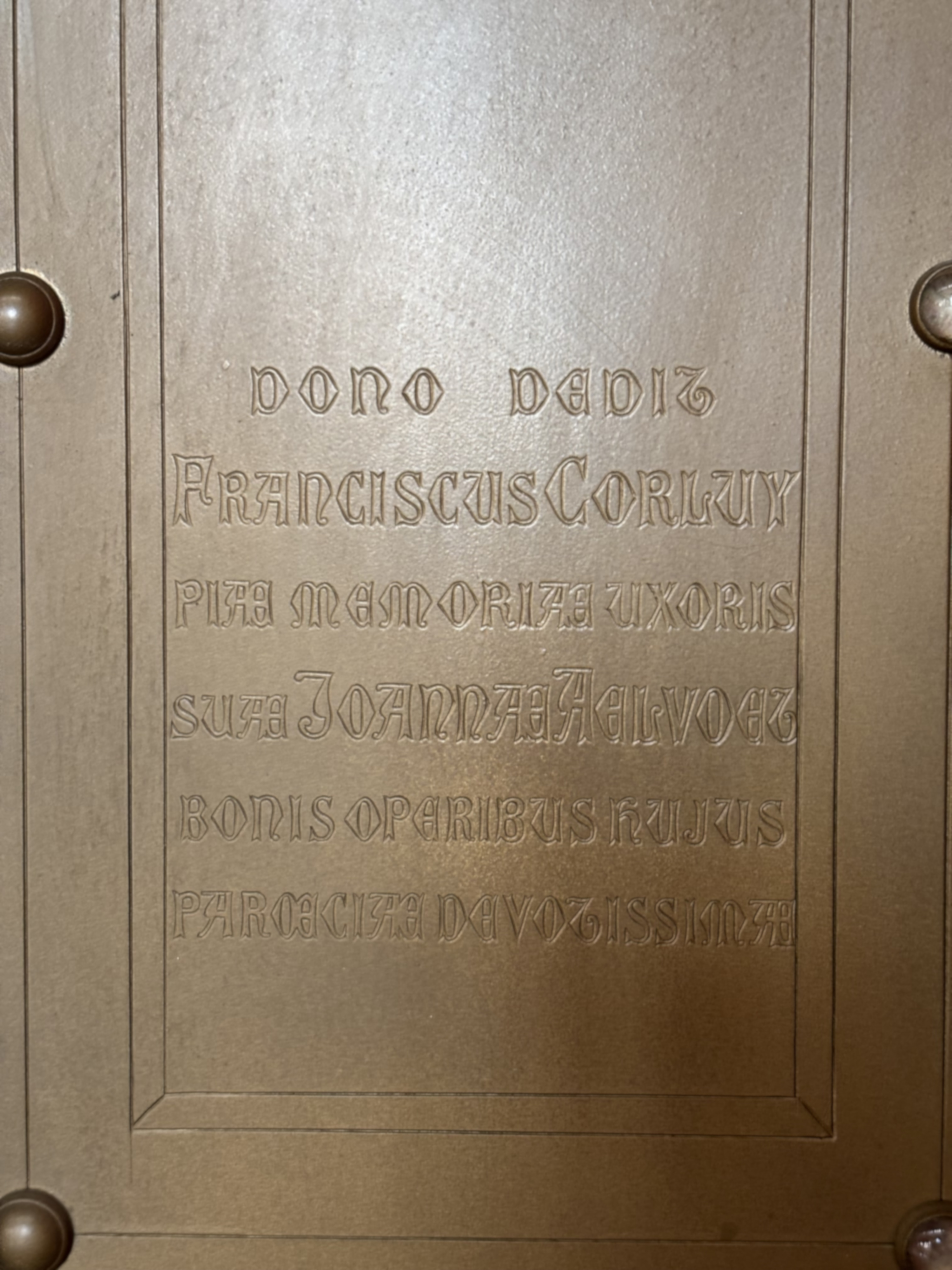 "Dono dedit Franciscus Corluy piae memoriae uxoris suae Joannae Aelvoet bonis operibus hujus paroeciae devotissimae" ('François Corluy a fait ce don à la pieuse mémoire de son épouse Jeanne Aelvoet, très dévouée aux bonnes œuvres de cette paroisse.' Gravé sur la face latérale droite du retable)
