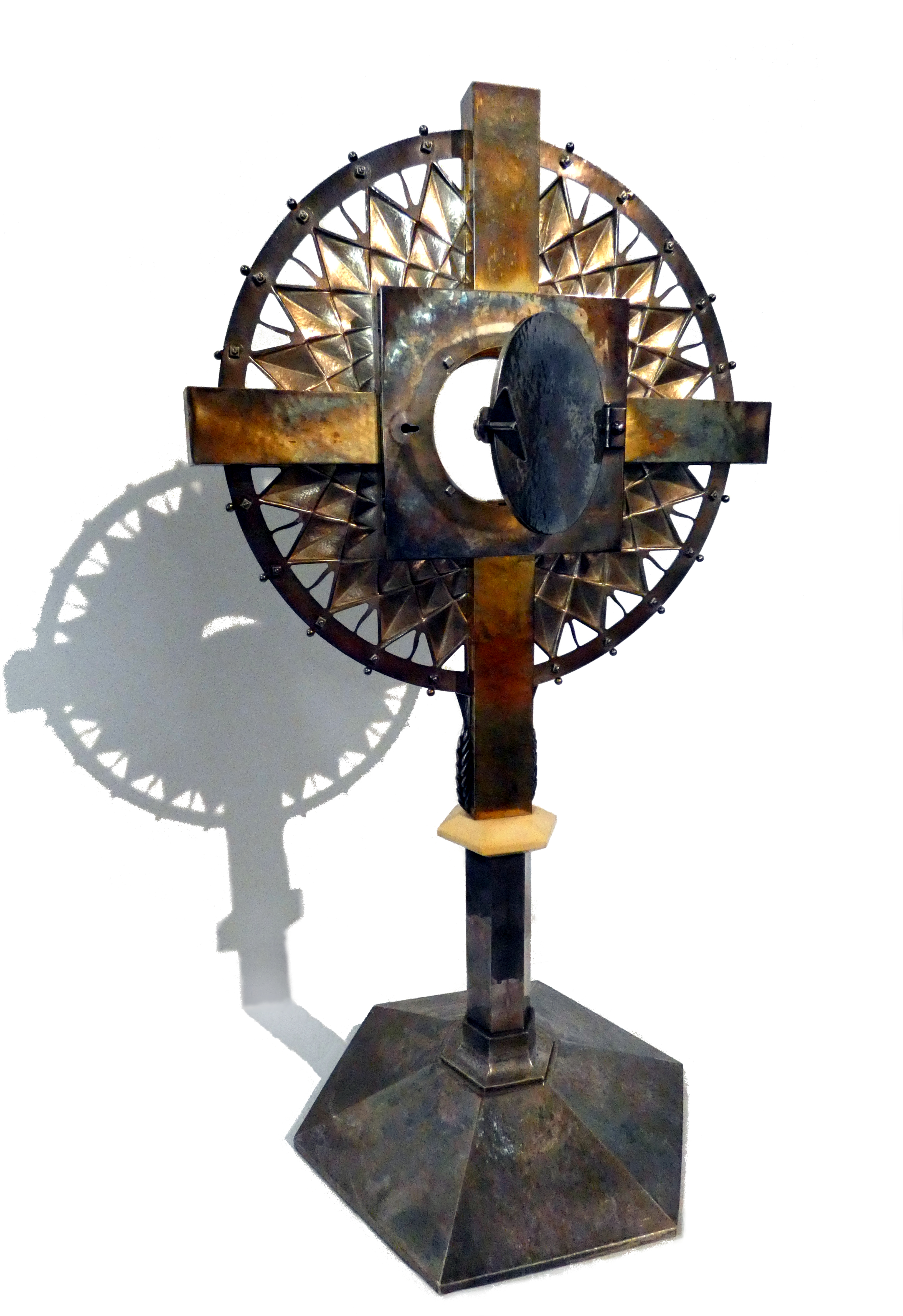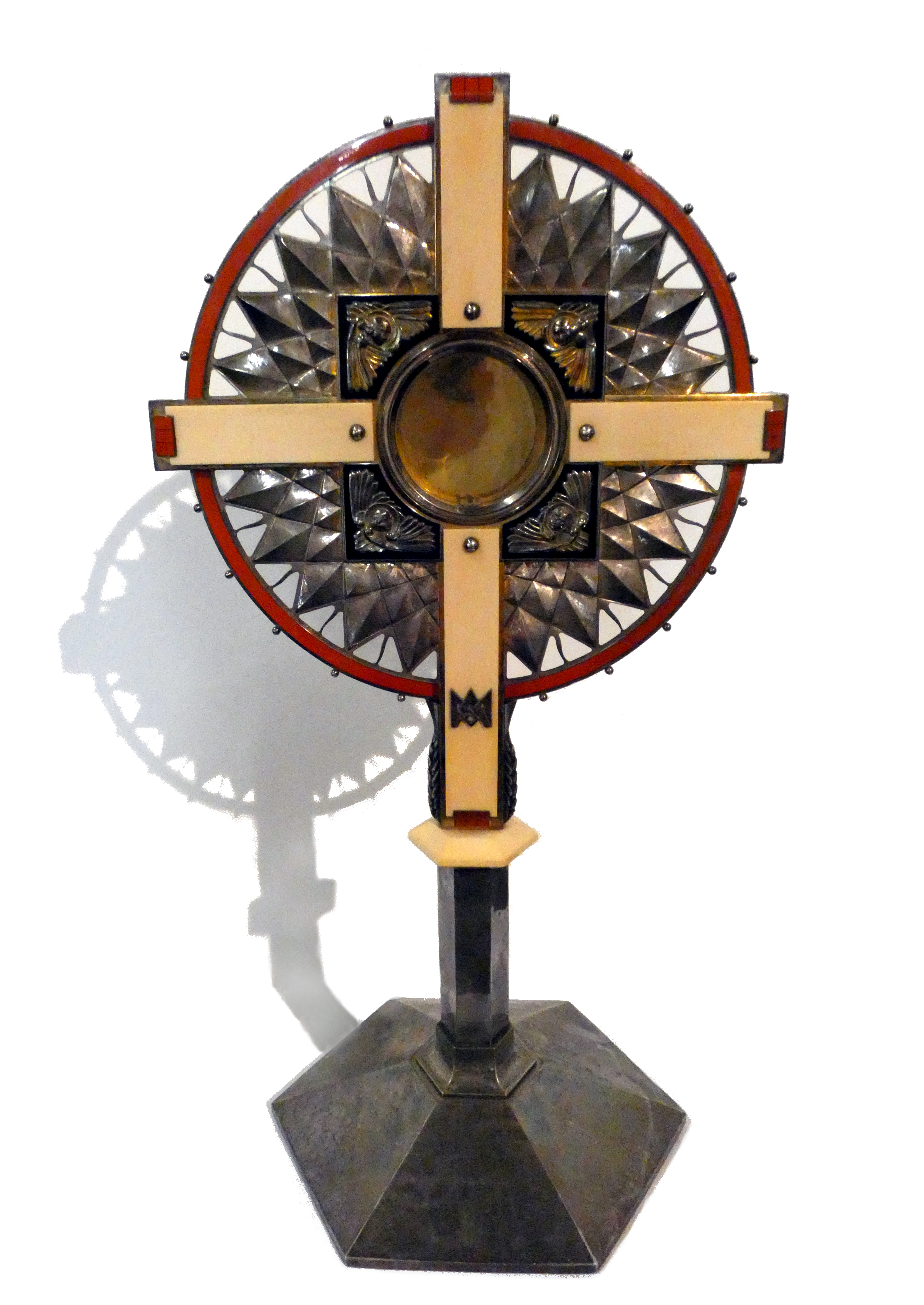 Cet ostensoir, portant le poinçon de l’atelier des Frères Devroye, est offert par l’œuvre des Vases Sacrés à l’occasion de la fête du Christ Roi de 1938, d’après l’inscription sous le pied. Joseph et Charles Devroye fondent un atelier d’orfèvrerie en 1919 où ils travaillent ensemble, comme associés, jusqu’en 1945. L’atelier est alors dissous et chacun des deux frères crée son propre atelier. Le poinçon apposé sous le pied représente les lettres F et D, pour « Devroye Frères », dans une graphie géométrisée. Les travaux des frères Devroye s’inscrivent dans la mouvance Art déco, privilégiant des formes simplifiées et géométrisées, et des lignes épurées. L’ostensoir intègre des plaques et un nœud en ivoire ainsi que de l’émail rouge, soulignant notamment le pourtour extérieur de la partie supérieure rayonnante. Celle-ci, composée de losanges facettés en argent formant des rayons sur lesquels la lumière se reflète, n’est pas sans rappeler le majestueux ostensoir-soleil réalisé par l’orfèvre Henri-Joseph Holemans, contemporain de Devroye, pour la Basilique de Koekelberg (Ostensoir-soleil / Basilique Nationale du Sacré-Coeur – Inventaire du patrimoine mobilier).