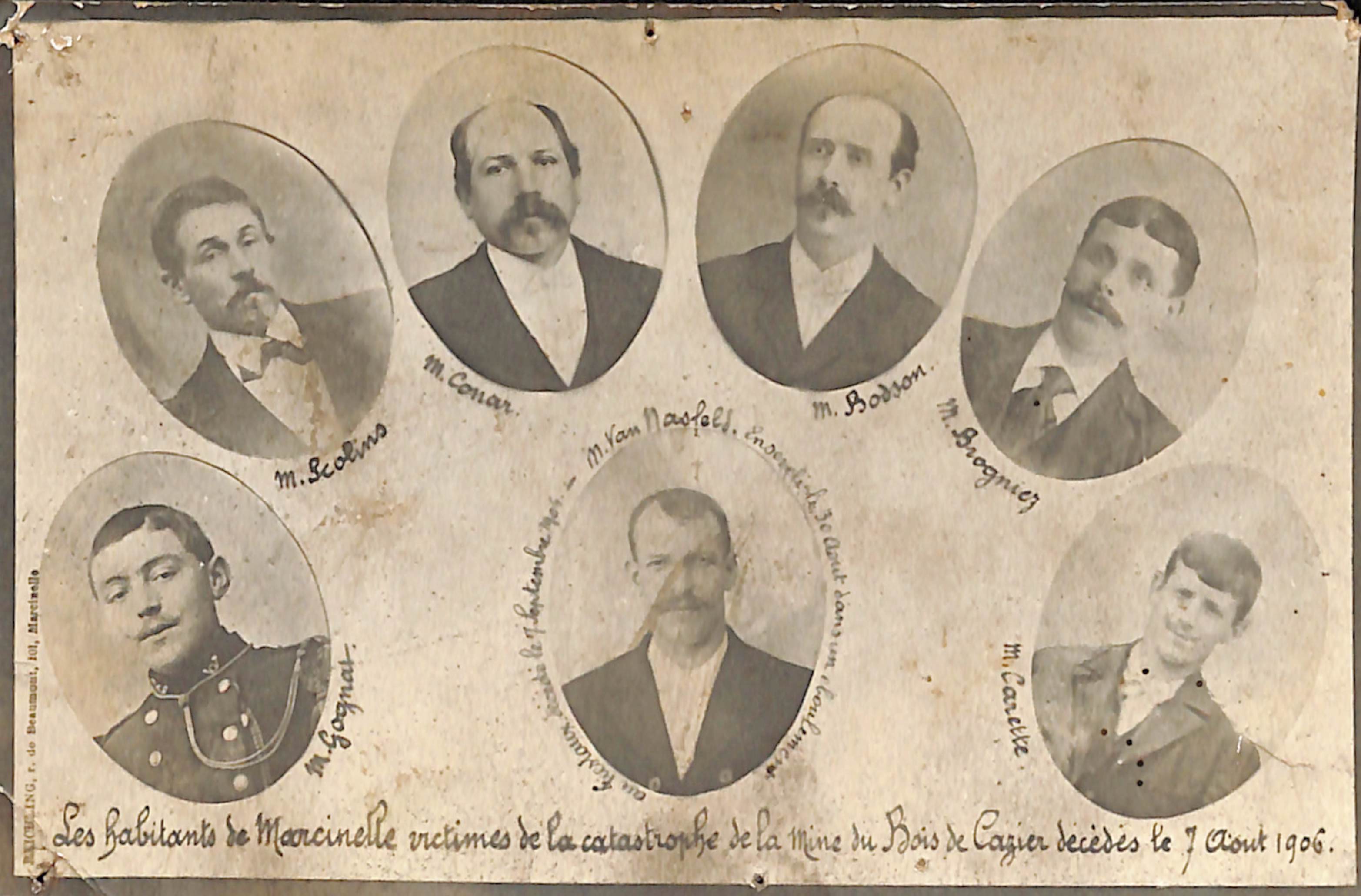 "Les habitants de Marcinelle victimes de la catastrophe de la mine du Bois de Cazier décédés le 7 août 1906."