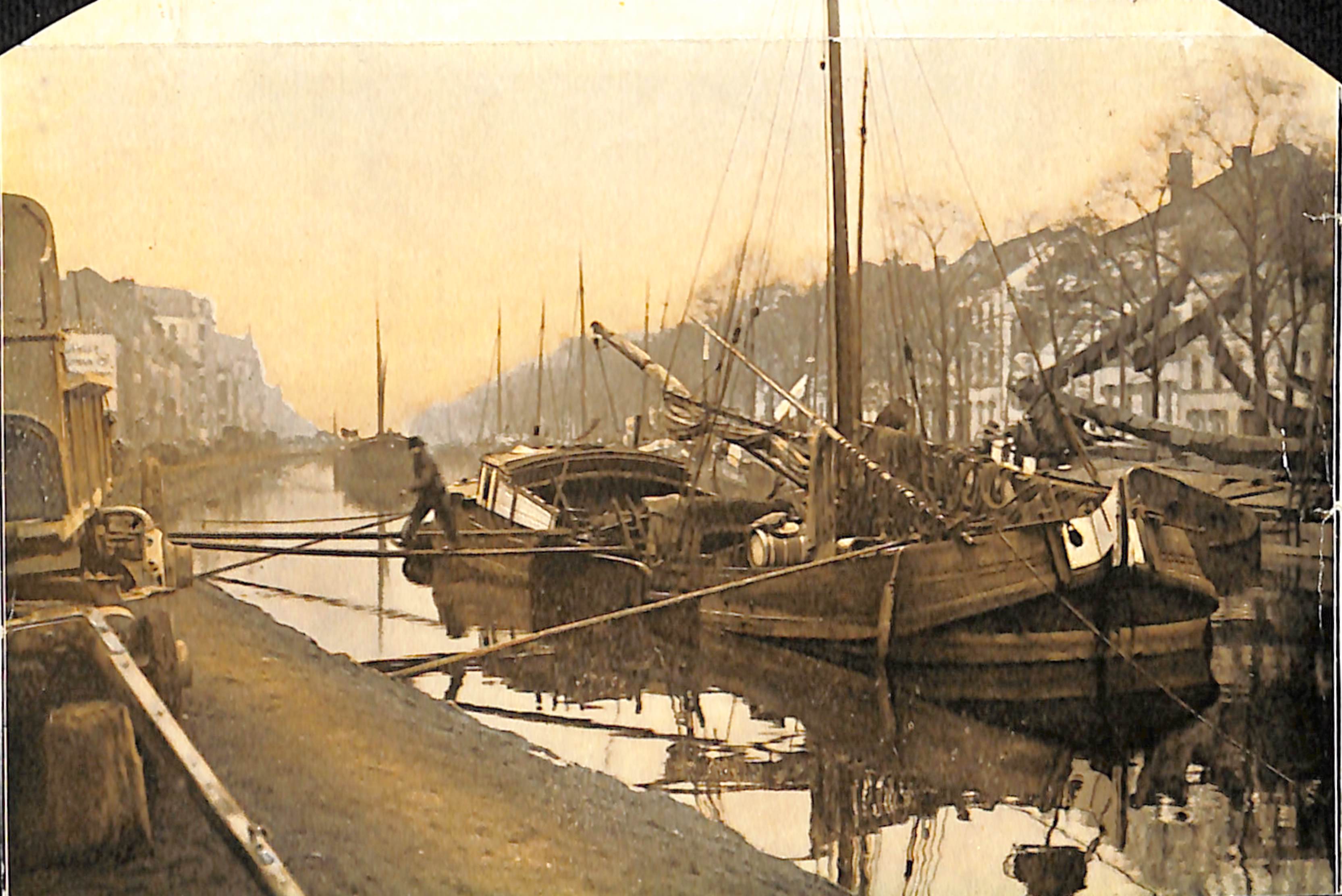 L'image montre bien, entre autres, les berges en terre côté Molenbeek, la longue gaffe qui tient le chaland à distance du quai et les planches étroites donnant accès aux bateaux.