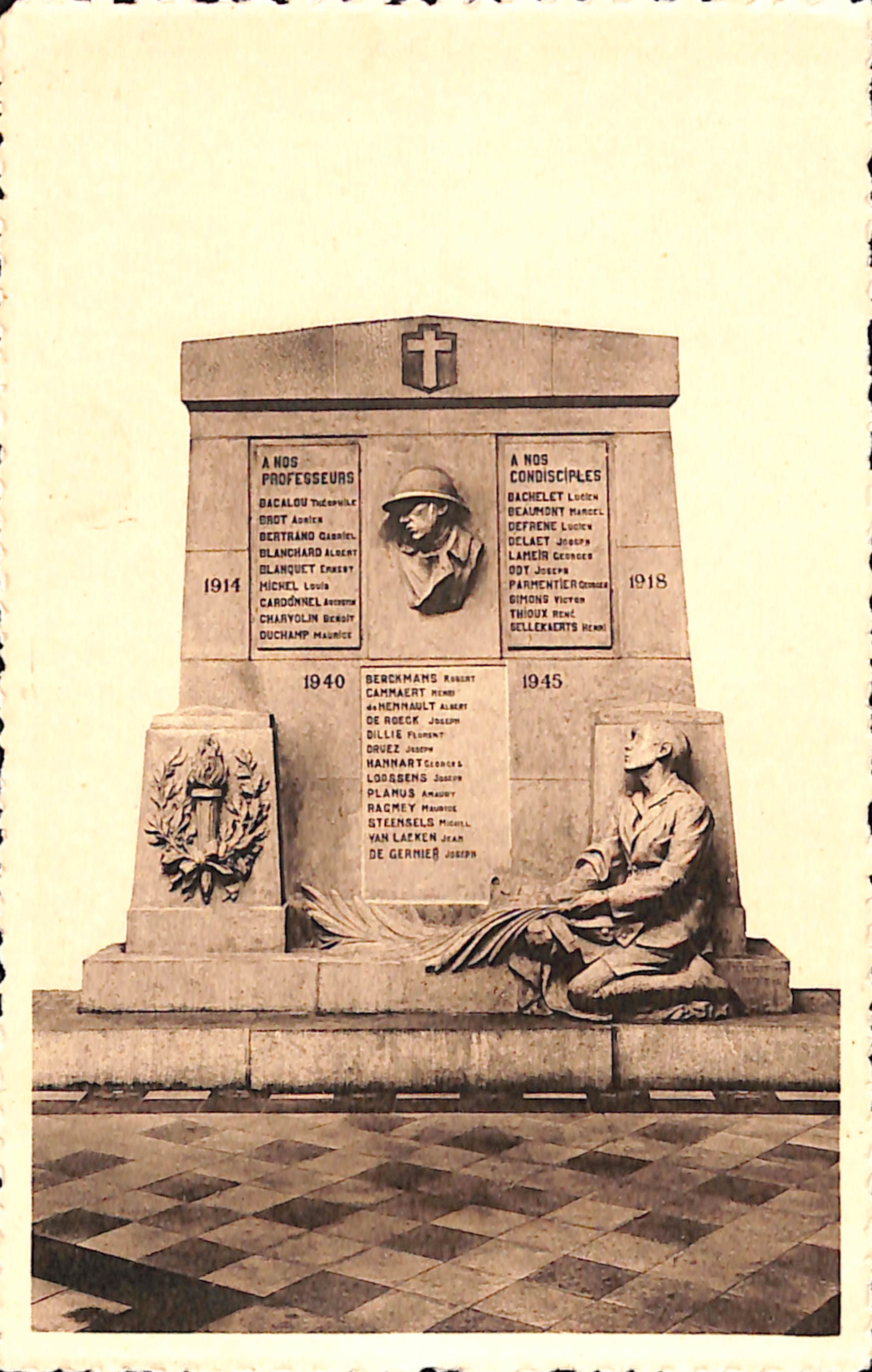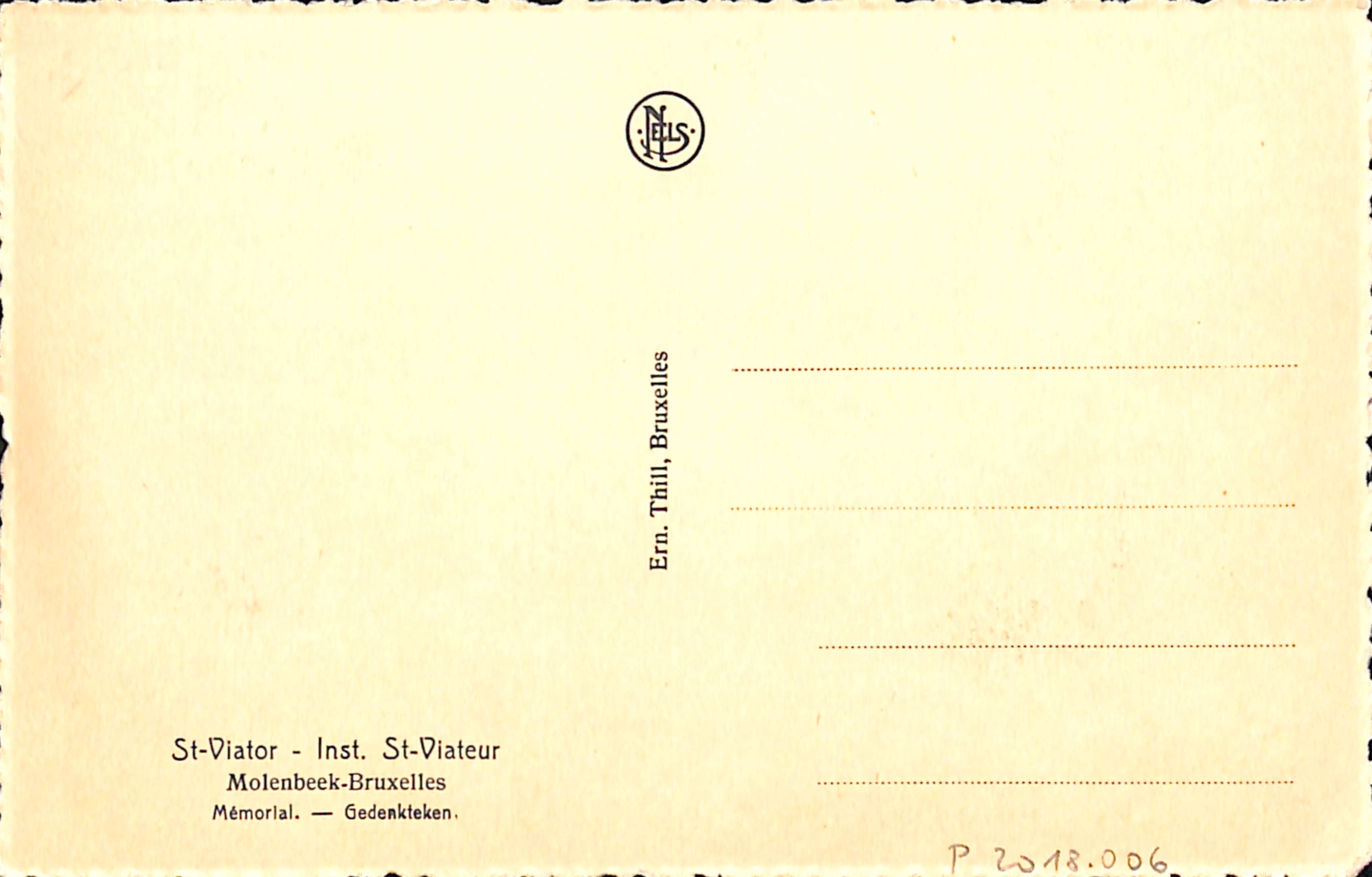 Carte-vue Monument aux morts 1914-1918, 1940-1945, Institut Saint-Viateur (Molenbeek-Saint-Jean), éd. Nels (Bruxelles), s.d. [vers 1945-1946].