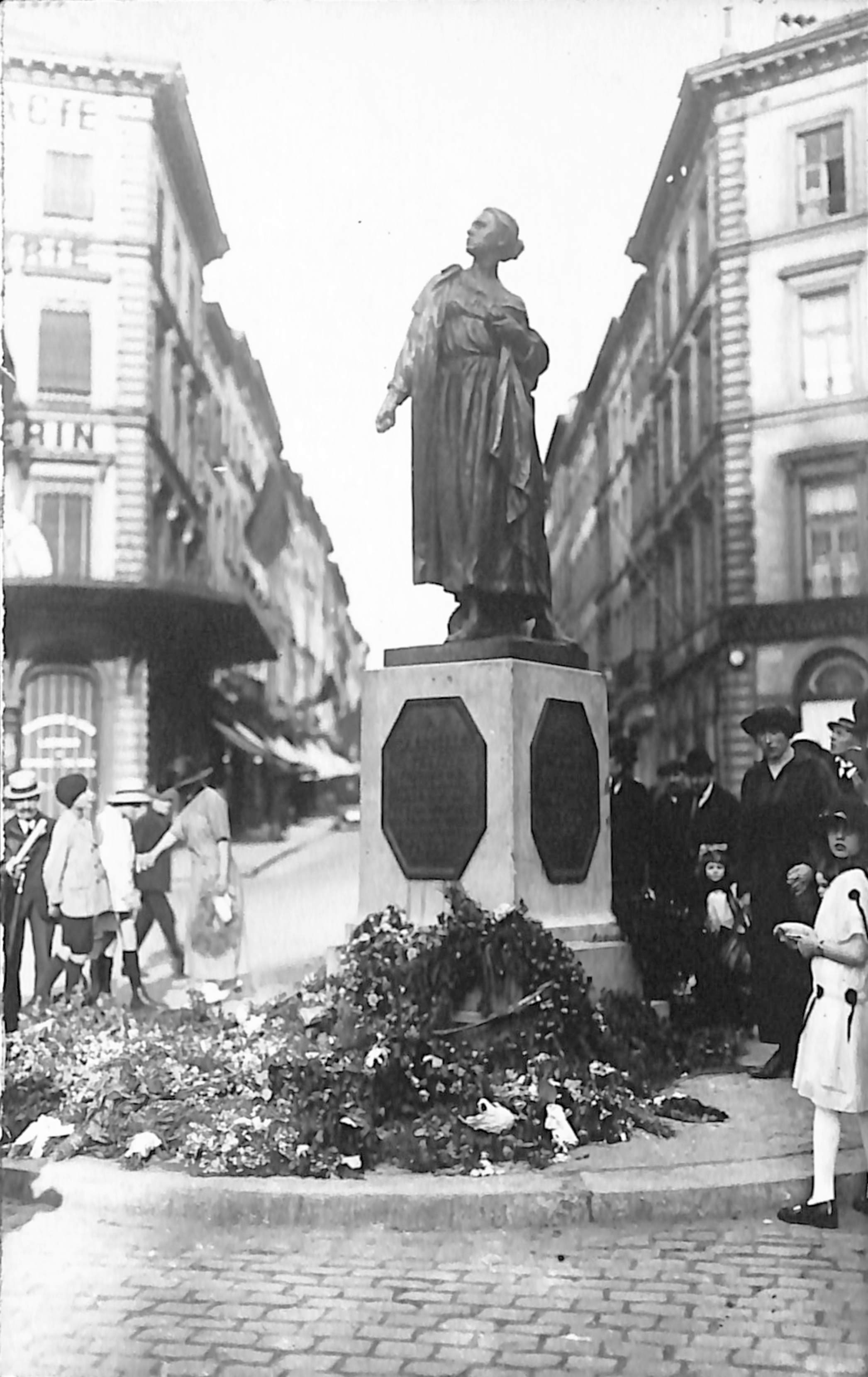 Carte photo Statue résistante belge Gabrielle Petit par Egide Rombaux, Place Saint-Jean (Bruxelles), photogr. anon., s.d. [vers 1923].