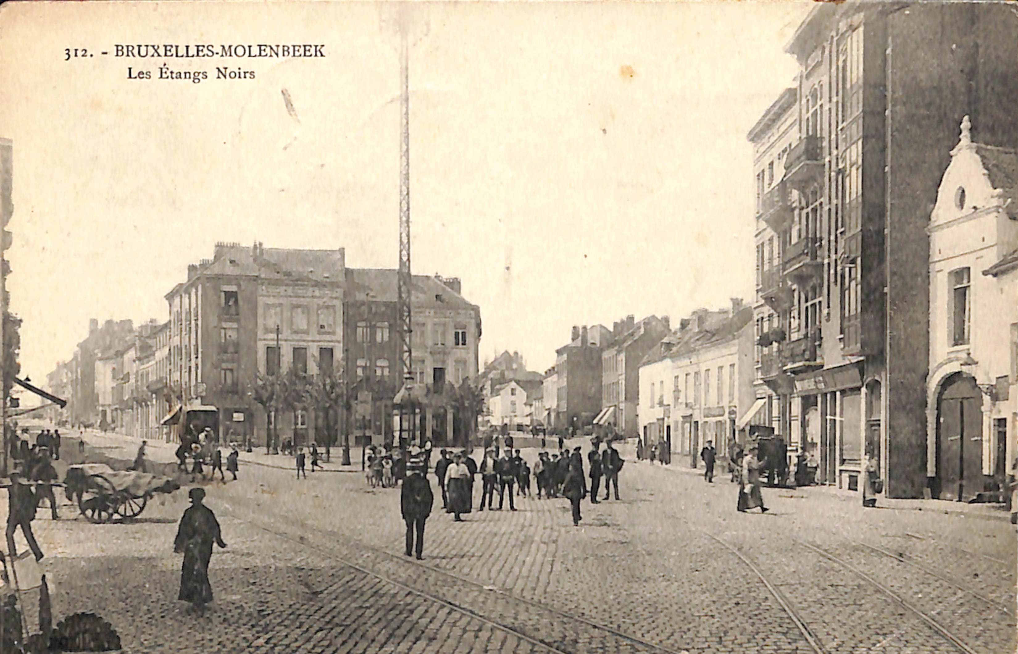 Carte-vue Place des Etangs noirs, Chaussée de Gand, Rue des Etangs noirs, pylone, colonne Morris (Molenbeek-Saint-Jean), éd. G. Hermans (Anvers), 1913.