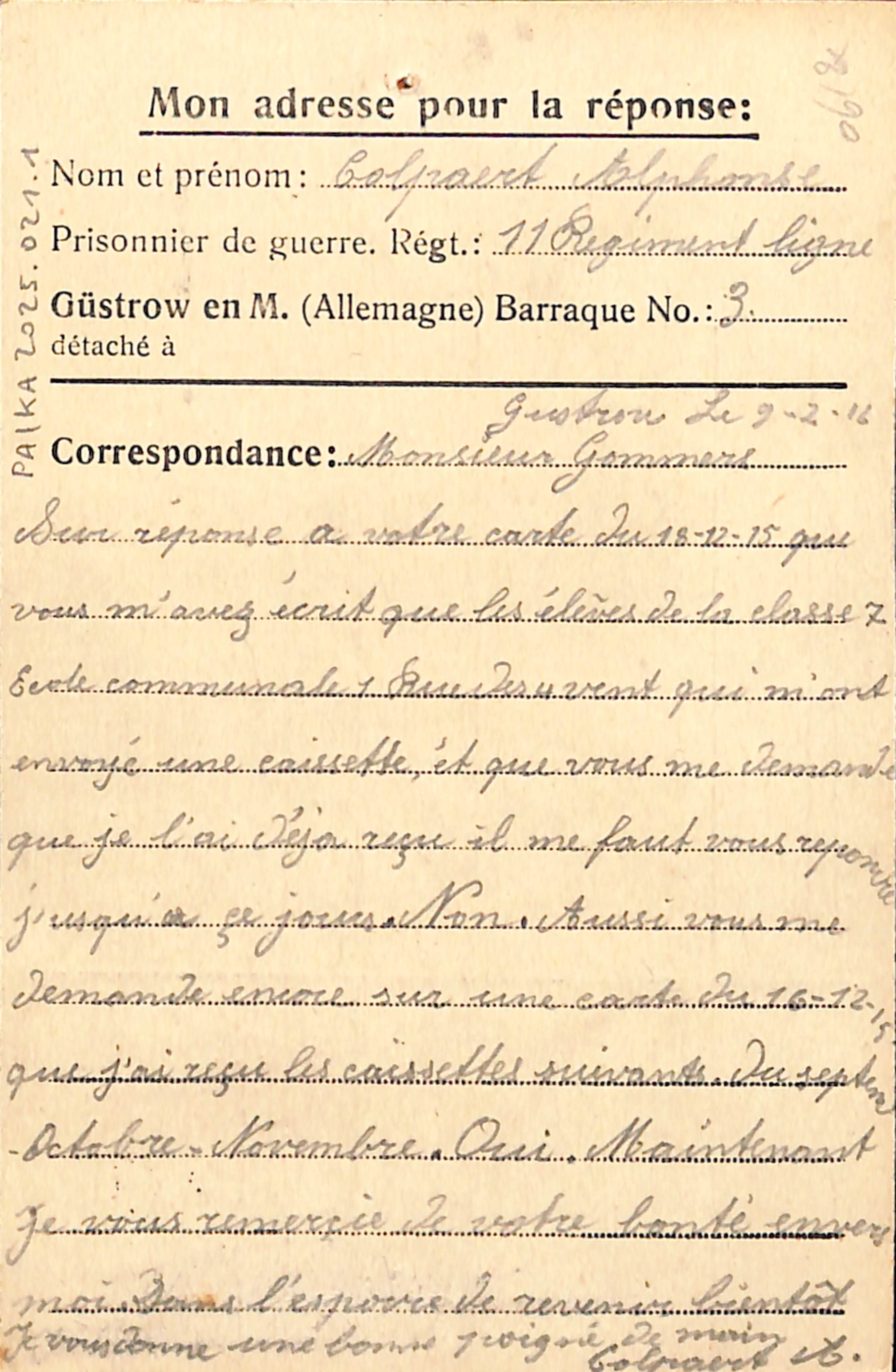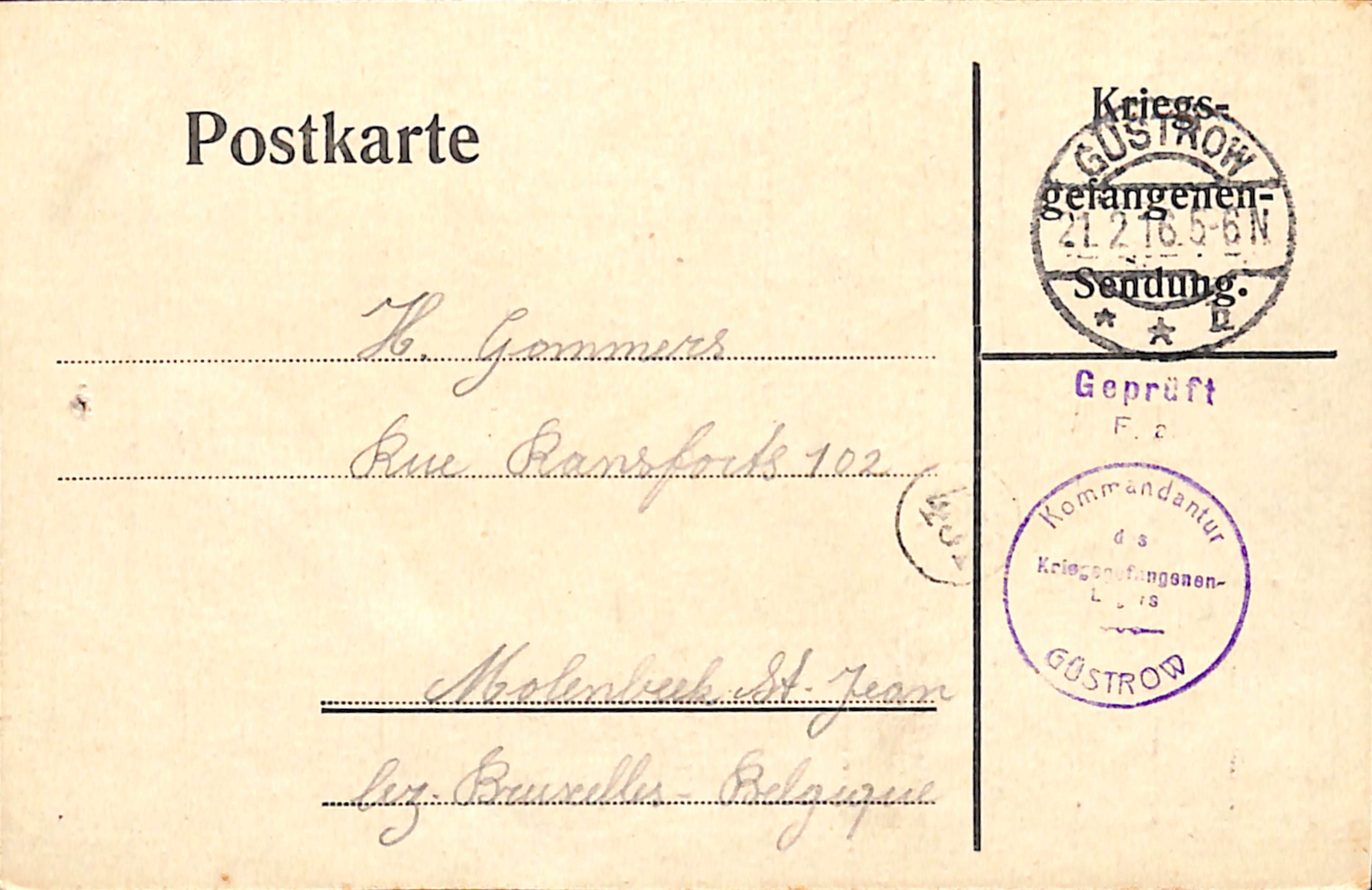 Carte postale Prisonnier de guerre Alphonse Colpaert, 11e régiment de Ligne, envoyée du camp de Güstrow vers Molenbeek-Saint-Jean, 1916.
