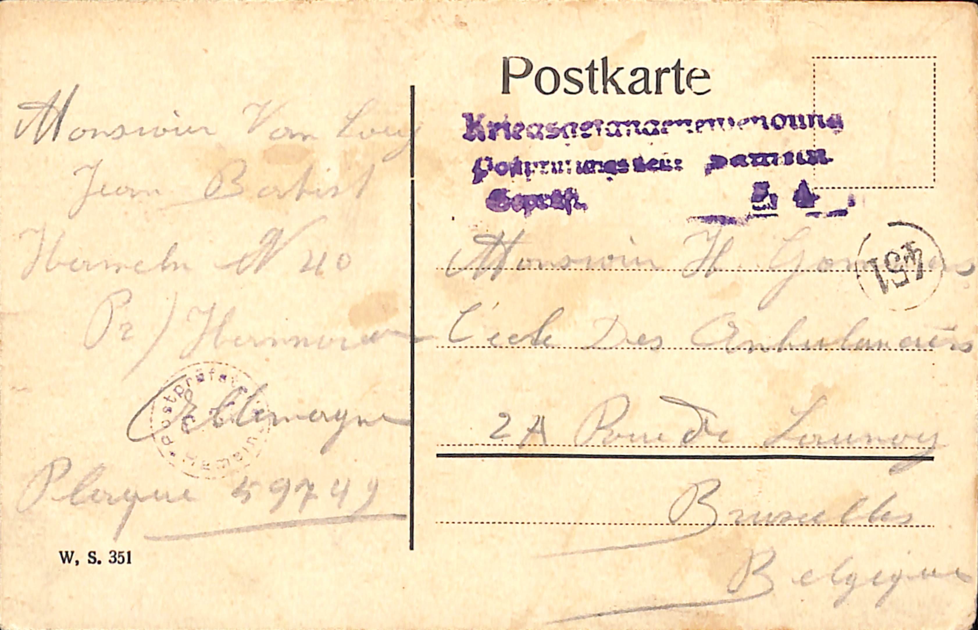 Carte postale Prisonnier de guerre Jean-Baptiste Van Loey envoyée du camp de Hameln au Cercle des ambulanciers de Molenbeek-Saint-Jean, 1917.