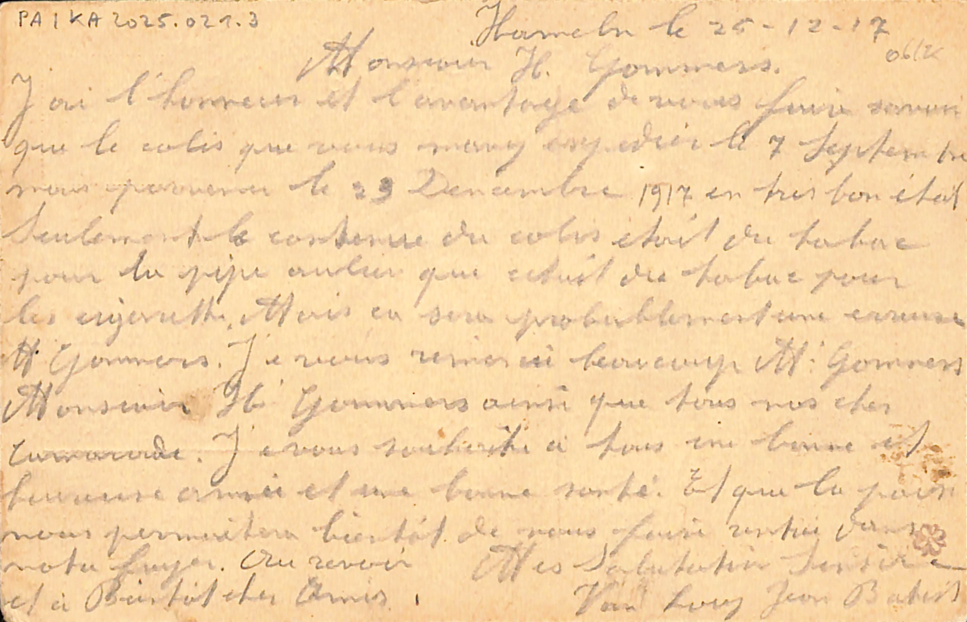 Carte écrite le 25 décembre 1917 en remerciement d'un colis, adressé à H. Gommers.