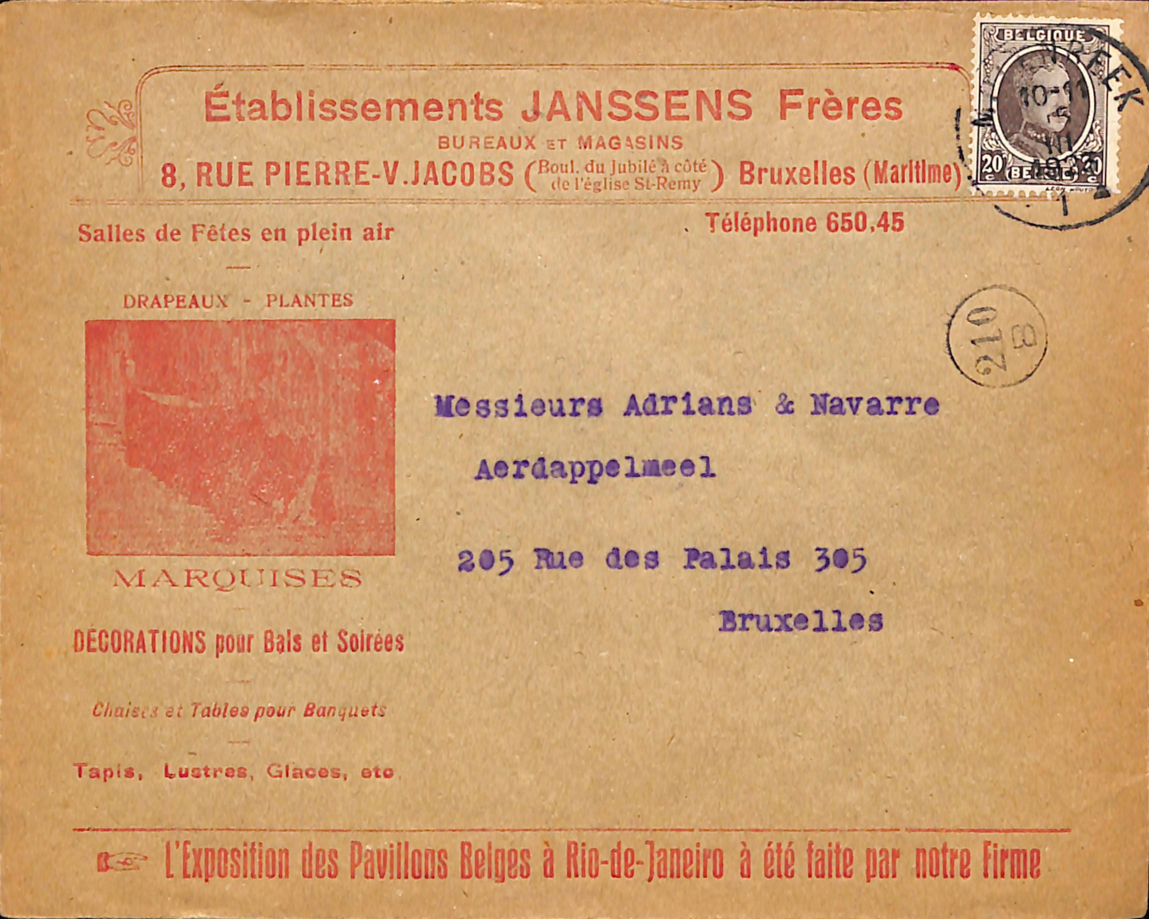 Enveloppe à en-tête Etablissements Janssens Frères, décorations pour bals et soirées, Rue Pierre-Victor Jacobs, 8 (Molenbeek-Saint-Jean), 1923.