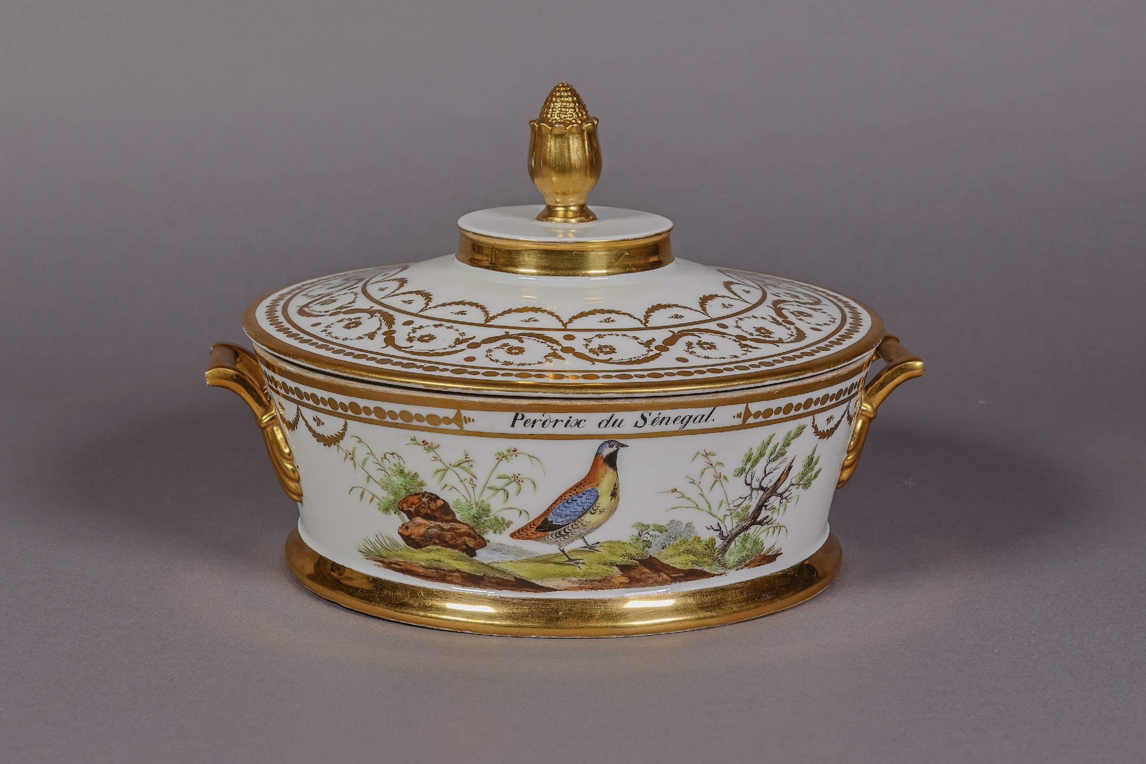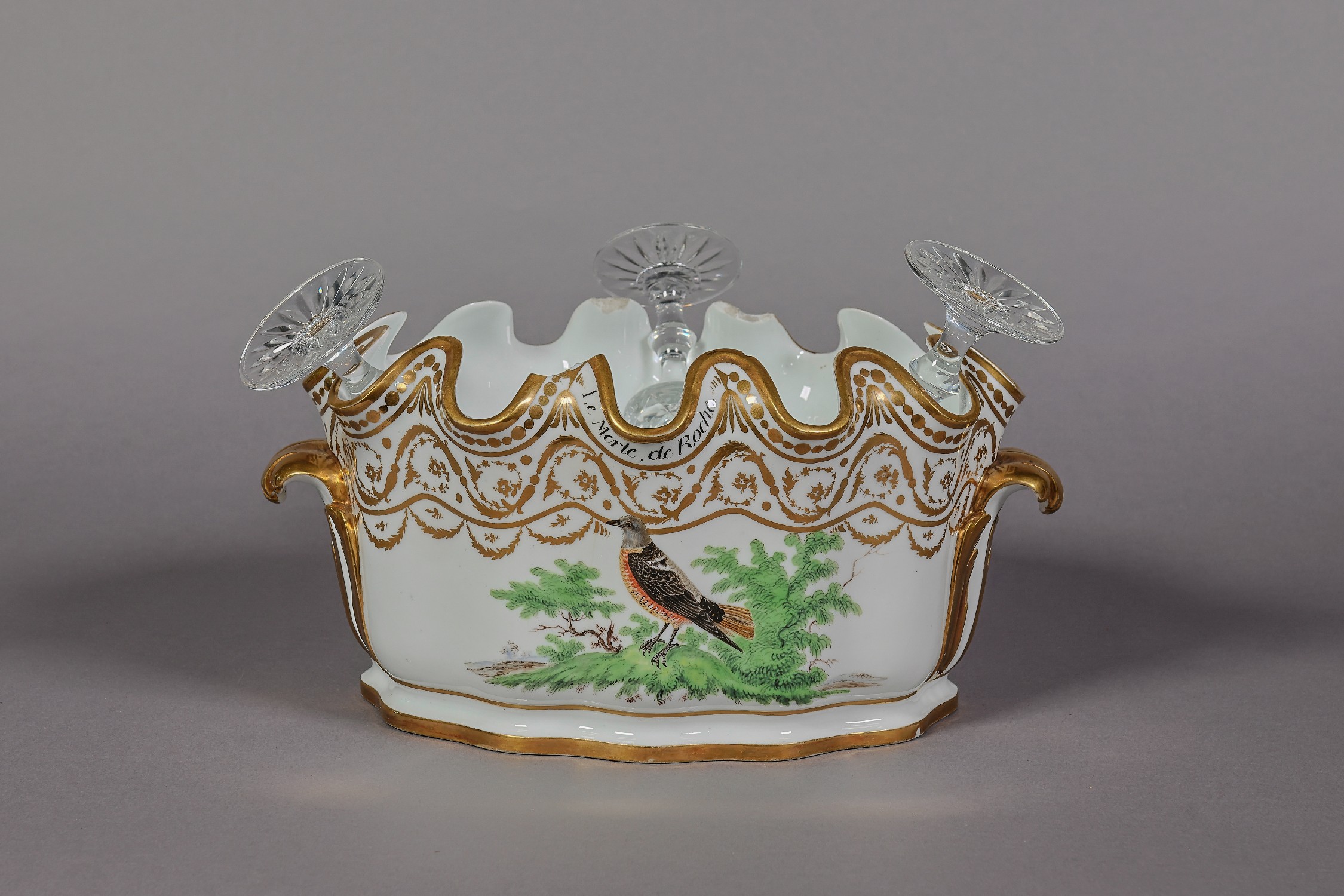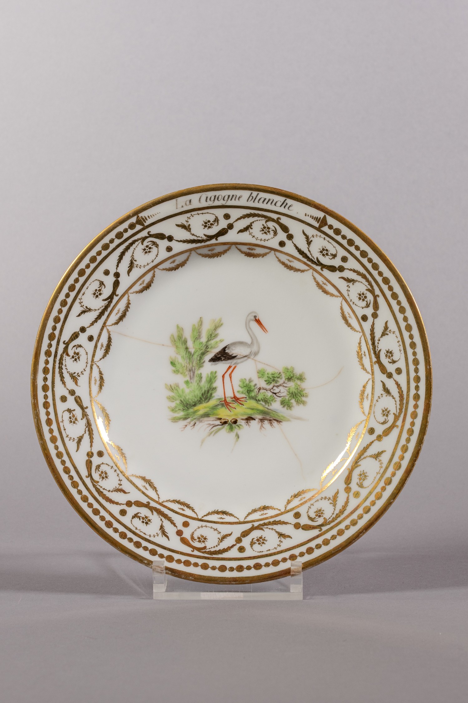 Ce service prestigieux a été peint à Bruxelles au début du 19e siècle par Louis Cretté avec des représentations d’oiseaux tirées de l’Histoire naturelle des oiseaux de Buffon. Cretté souhaitait offrir ce service de 1.100 pièces à Bonaparte, le Premier Consul, mais cela ne s’est jamais concrétisé. Le service a été dispersé, et c’est aujourd’hui le Musée de la Ville de Bruxelles qui en conserve le plus grand ensemble (93 pièces).