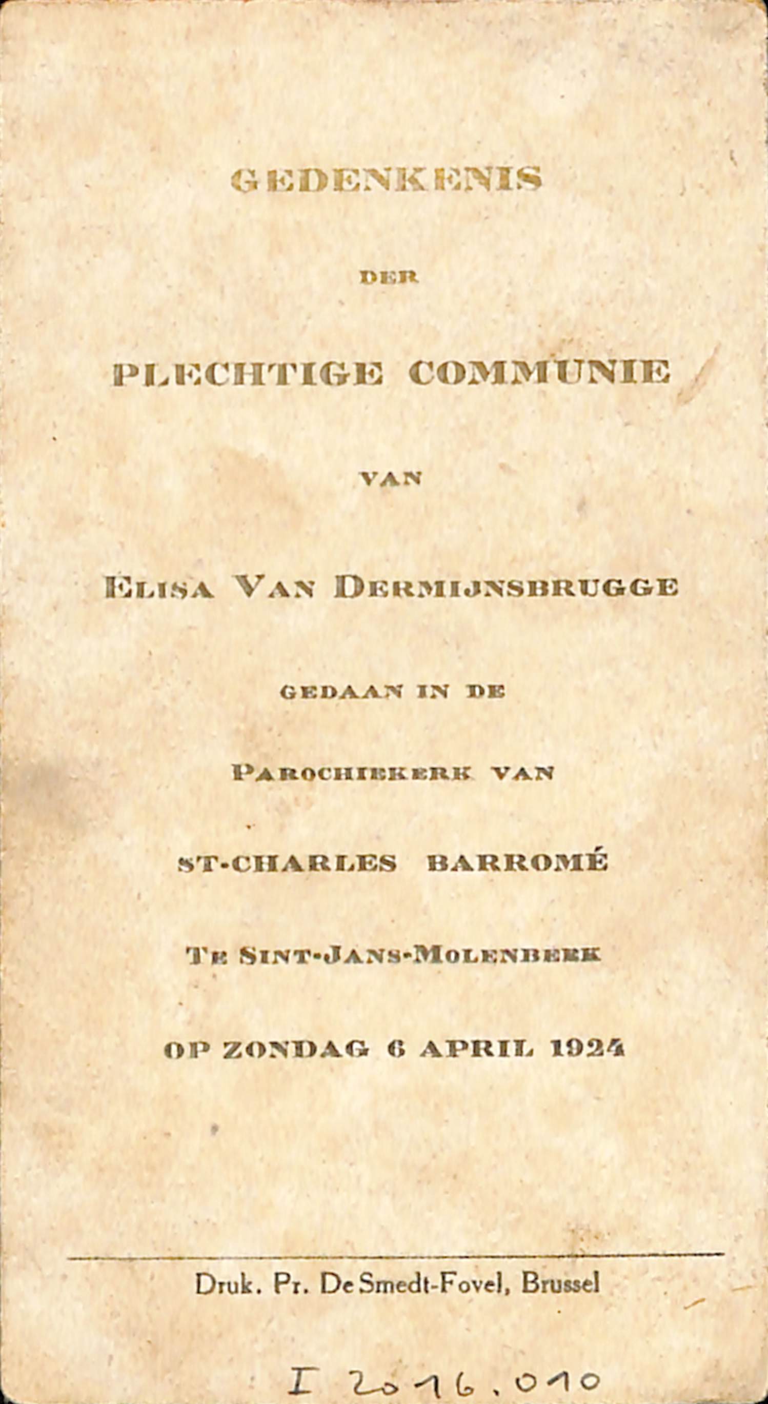 Souvenir de communion solennelle Elisa Dermijnsbrugge, église Saint-Charles-Borromée (Molenbeek-Saint-Jean), éd. F.Sch.N., 1924.