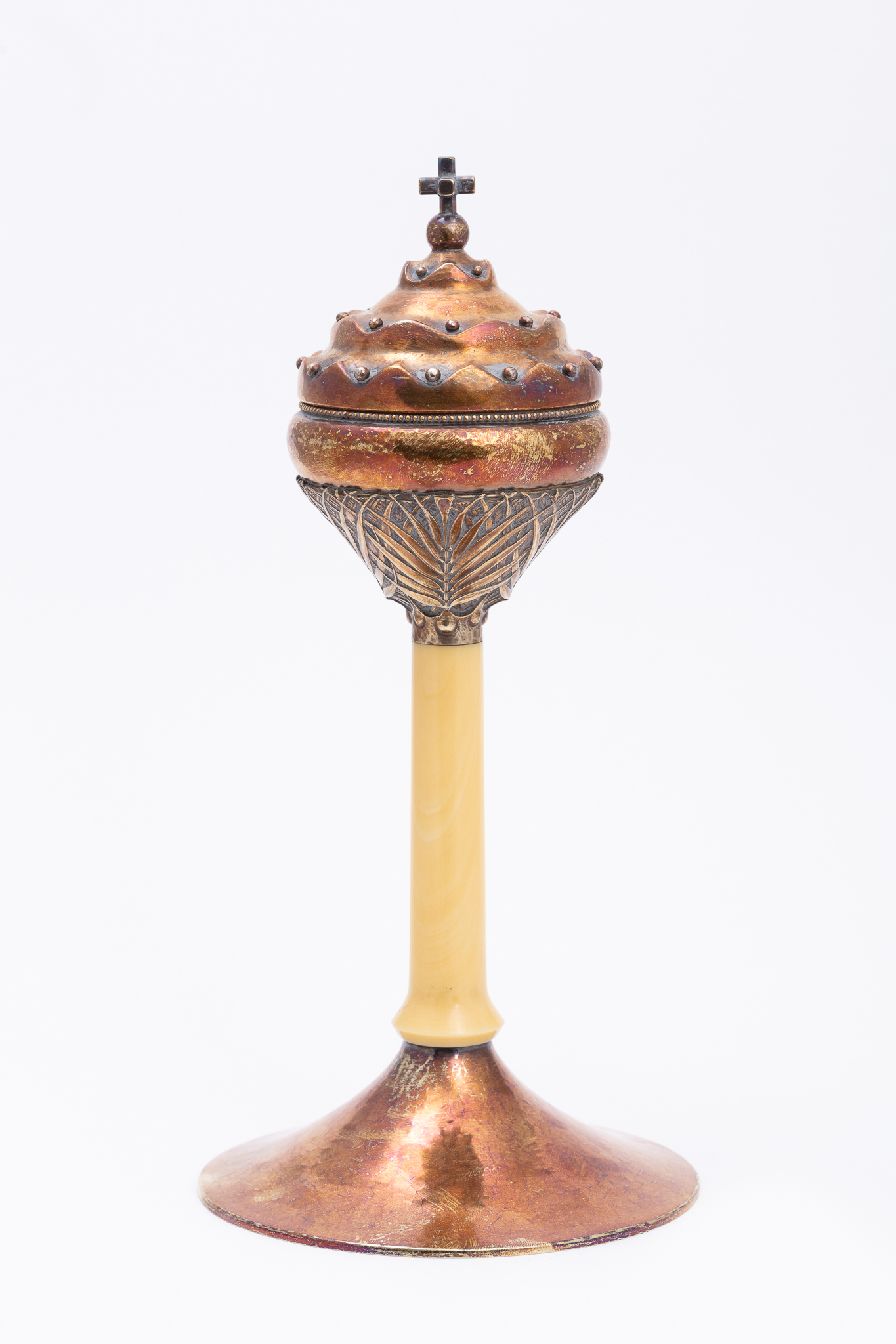 Couvercle piqué d'une sphère et d'une croix en 3 dimensions, avec trois étages évoquant une tiare.