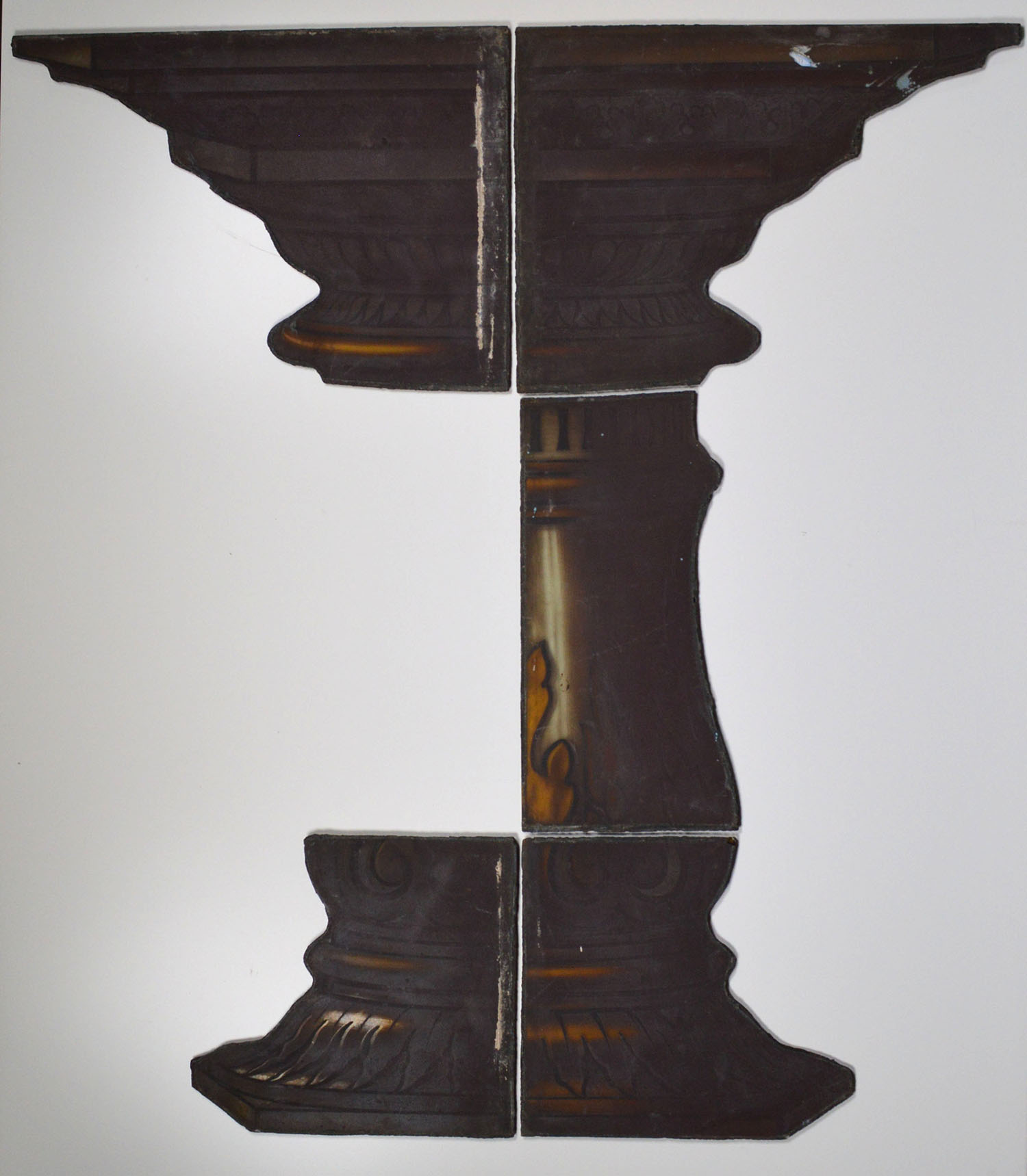 Cinq fragments d’un vitrail qui, ensemble, forment une ou deux demi-colonnes