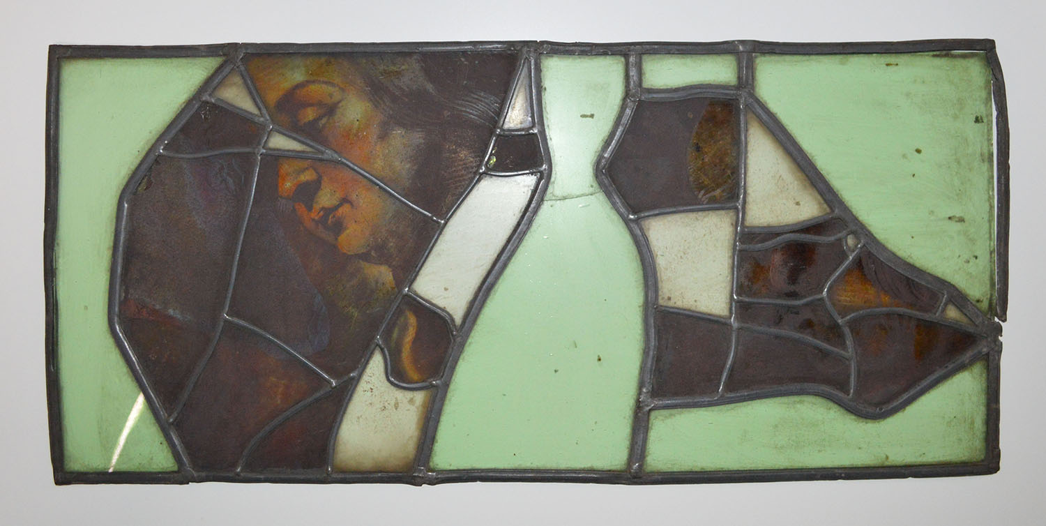 Cinq fragments d’un vitrail qui, ensemble, forment une ou deux demi-colonnes
