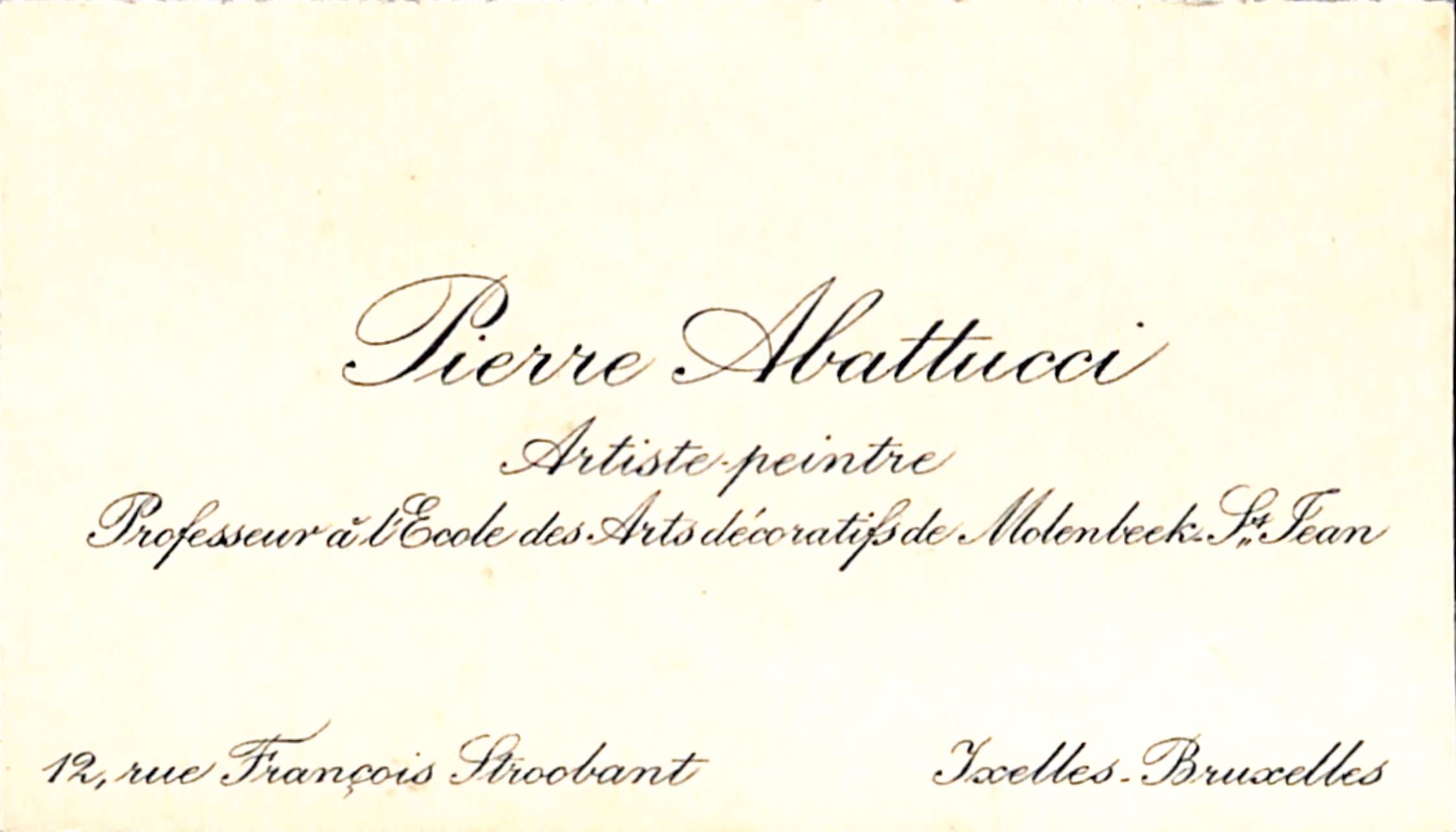 "Pierre Abattucci / Artiste-peintre / Professeur à l'Ecole des Arts décoratifs de Molenbeek-St-Jean / 12, rue François Stroobant Ixelles-Bruxelles"