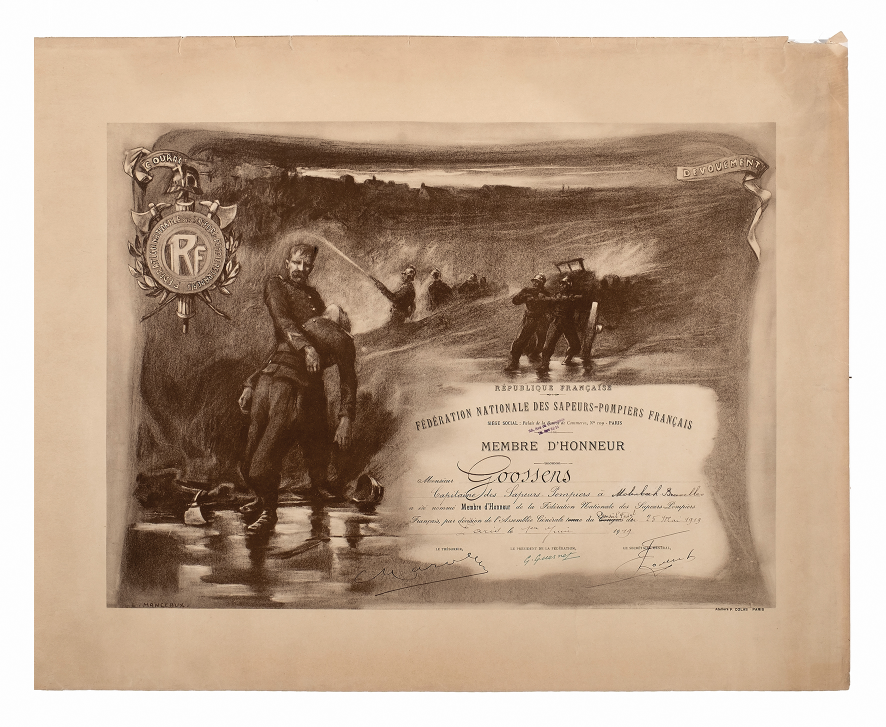 Diplôme de membre d'honneur décerné par la Fédération nationale des sapeurs-pompiers français à Oscar Goossens, capitaine des sapeurs-pompiers de Molenbeek-Saint-Jean, 1919.