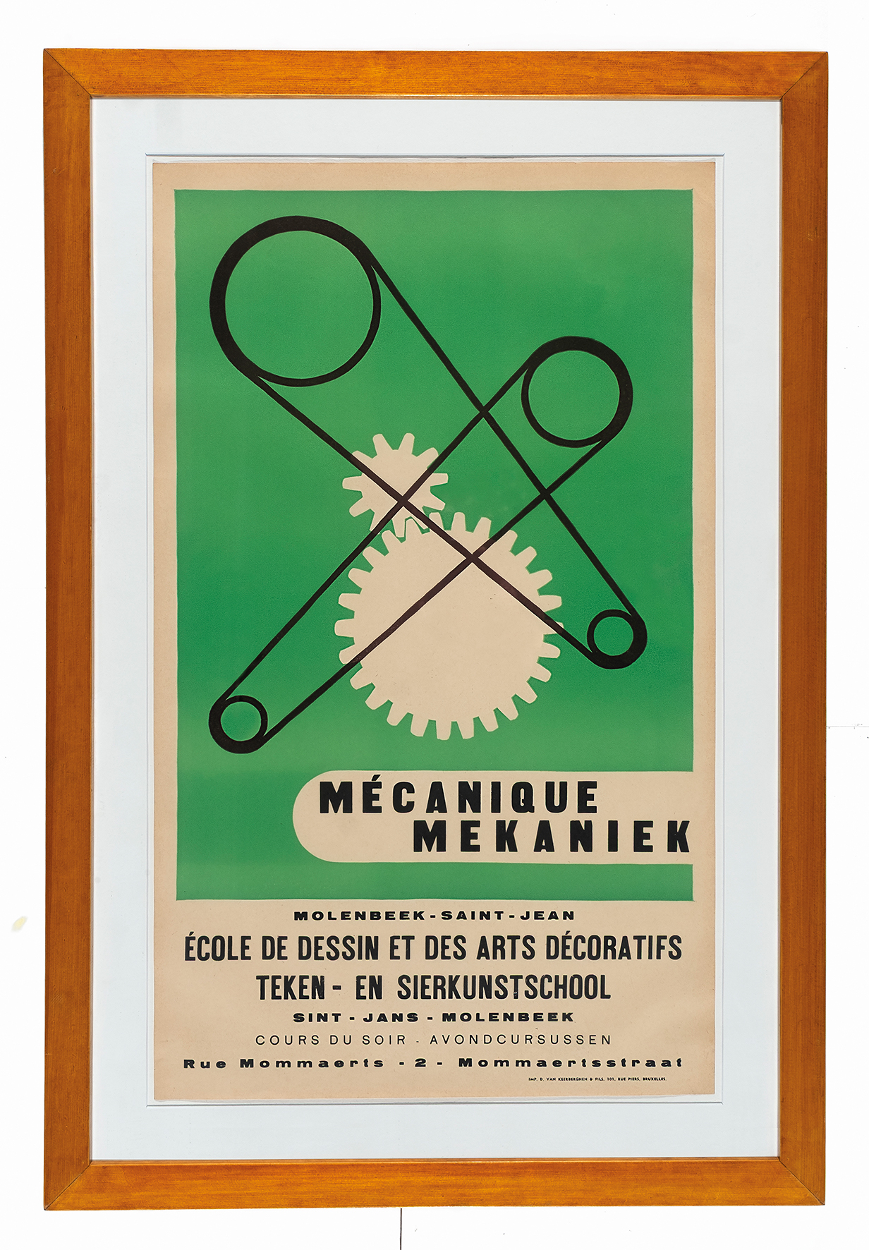 Affiche publicitaire Cours de mécanique de l’Académie de dessin de Molenbeek-Saint-Jean, impr. D. Van Keerbergen et fils (Molenbeek-Saint-Jean), s.d.