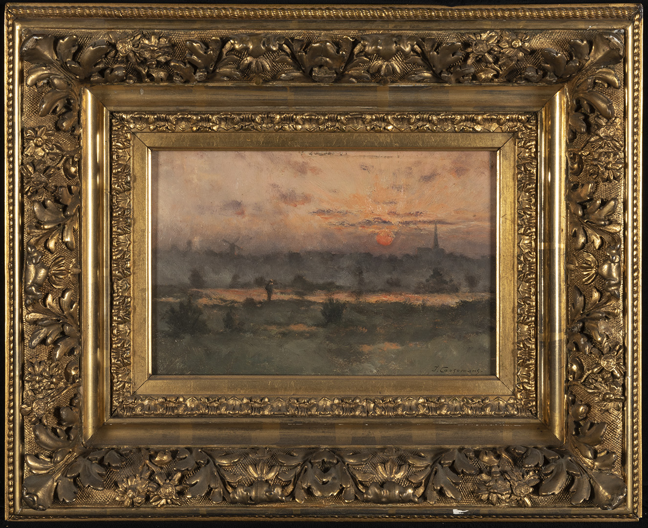 Coucher de soleil fut présenté en 1908 à l’exposition rétrospective de peinture et de sculpture organisée par le Cercle des arts, des sciences et des lettres de Schaerbeek dont Joseph Coosemans fut membre fondateur.Joseph Coosemans est issu d’une famille modeste et devient orphelin de mère en bas âge. Dirigé par son père vers une carrière dans l’administration, il obtient un poste de receveur communal à Tervuren, qu’il exerce de 1854 à 1872. C’est durant cette période qu’il entre en contact avec les paysagistes de l’école de Tervuren et plus particulièrement avec Hippolyte Boulenger (1837-1874) et Théodore Fourmois (1814-1871), qui furent ses premiers maîtres. Sa passion pour la peinture de paysage le conduit ensuite à Barbizon, où il réalise de nombreuses œuvres influencées par l’École de Fontainebleau. De retour en Belgique, le peintre s’installe d’abord à Louvain, puis dans la Campine limbourgeoise, notamment aux environ de Genk. Toutefois, il retourne peindre régulièrement à Tervuren. En 1887, sa nomination comme professeur de peinture de paysage à l’Institut Supérieur d’Anvers vient couronner sa carrière.