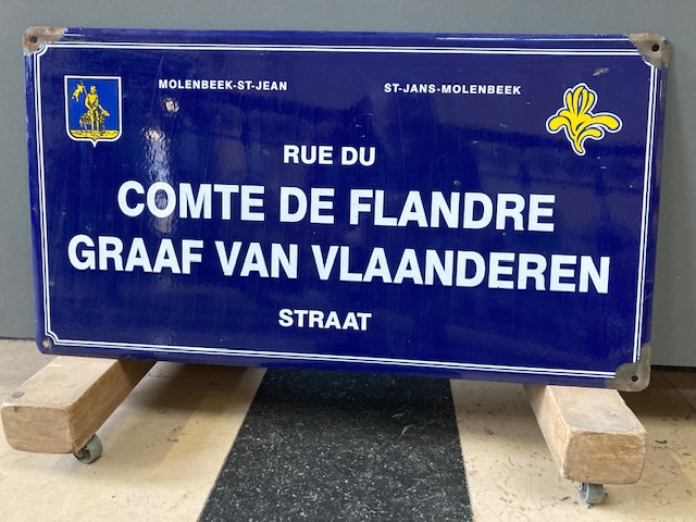 Plaque de rue émaillée Rue du Comte de Flandre / Graaf van Vlaanderen straat (Molenbeek-Saint-Jean), Emaillerie belge (Molenbeek-Saint-Jean), tôle, 1999.