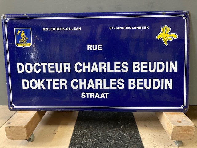 Plaque de rue émaillée Rue Docteur Charles Beudin / Dokter Charles Beudin straat (Molenbeek-Saint-Jean), Emaillerie belge (Molenbeek-Saint-Jean), tôle, 1999.