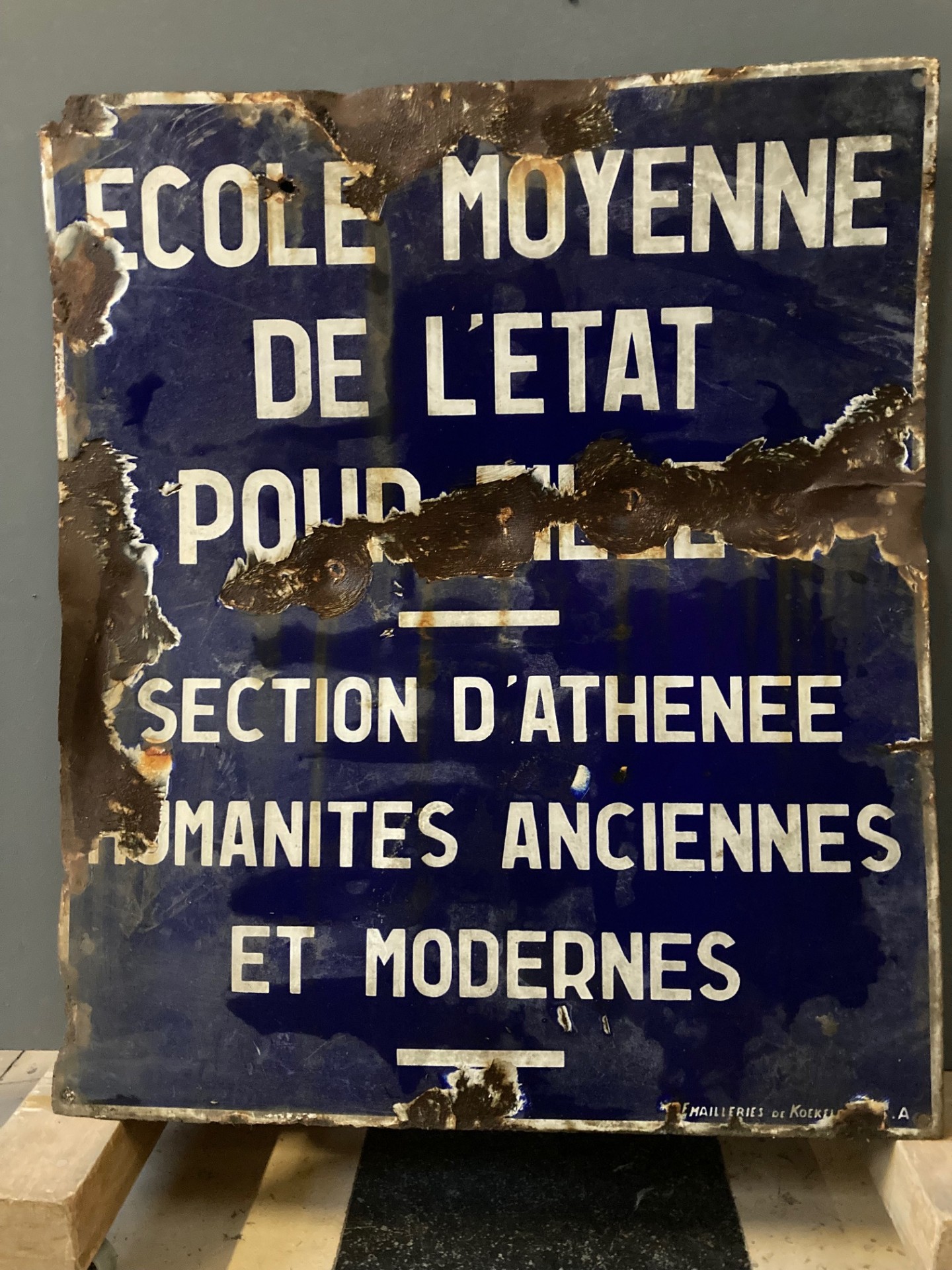 Plaque émaillée Ecole moyenne de l'Etat pour filles, section d'athénée, humanités anciennes et modernes (Molenbeek-Saint-Jean), Emailleries de Koekelberg S.A., s.d.
