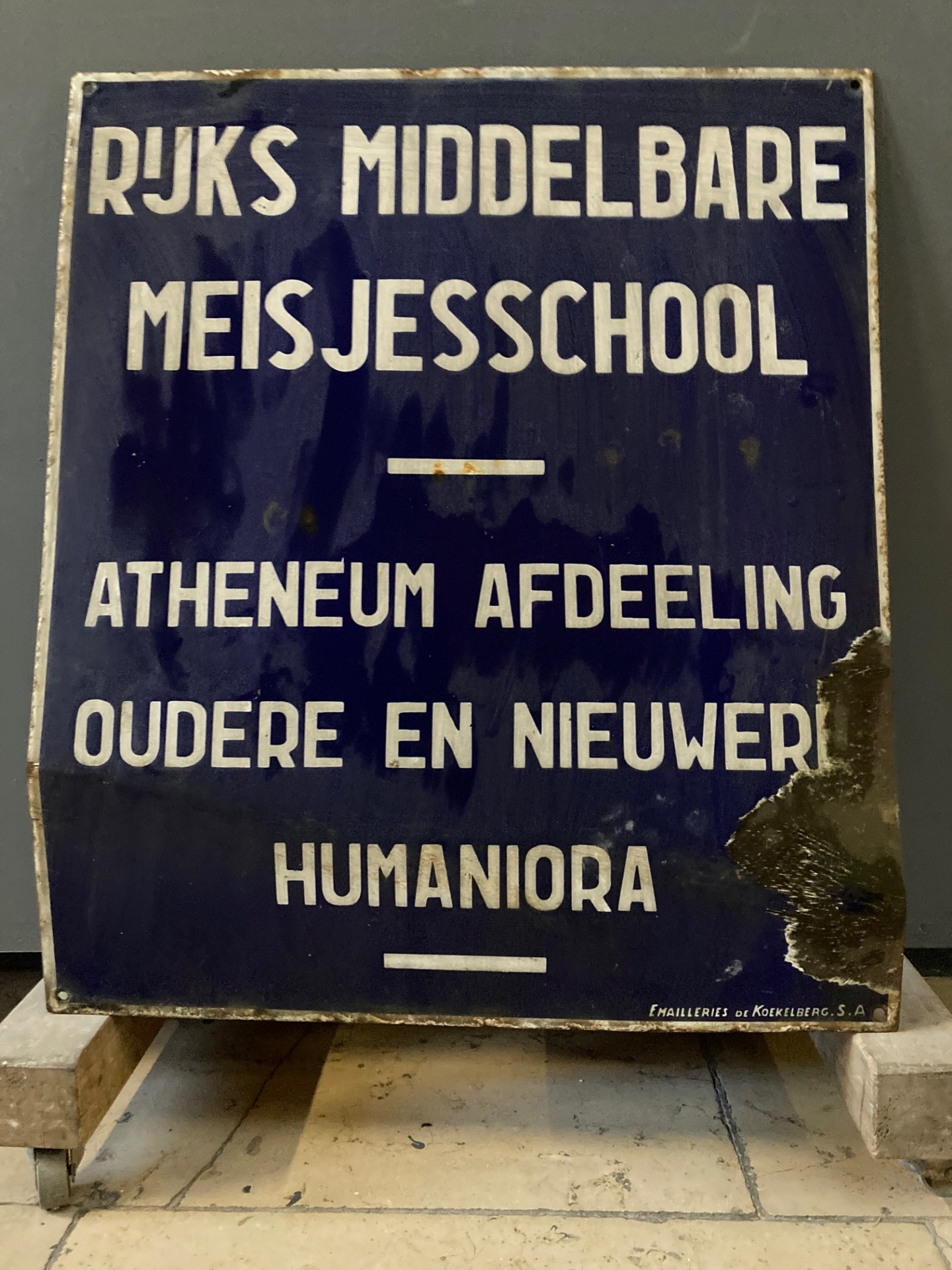 Plaque émaillée "Rijks middelbare meisjesschool, afdeling atheneum, oudere en nieuwere humaniora" (Molenbeek-Saint-Jean), Emailleries de Koekelberg S.A., s.d.