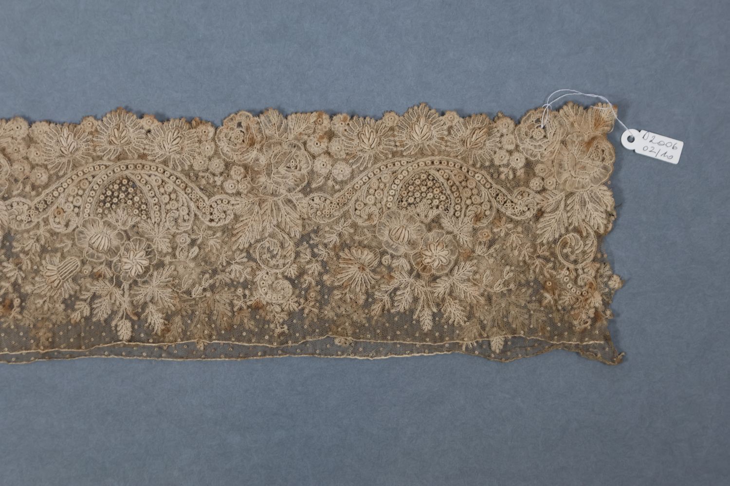Très fine dentelle à motifs floraux rehaussés de parties en relief se détachant du fond. Discussion