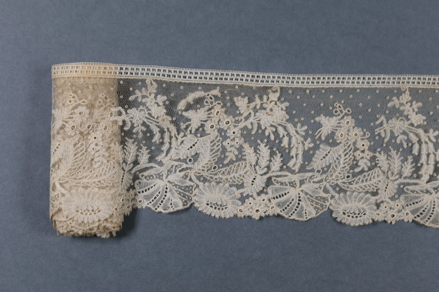 Fond de gaze très fin parsemé de pois. Décor floral occupant presque toute la hauteur du métrage. Bord inférieur festoné formé d'une alternace de fleurs épanouies et de feuilles. Coeur des fleurettes en relief comme dans la rosaline perlée.