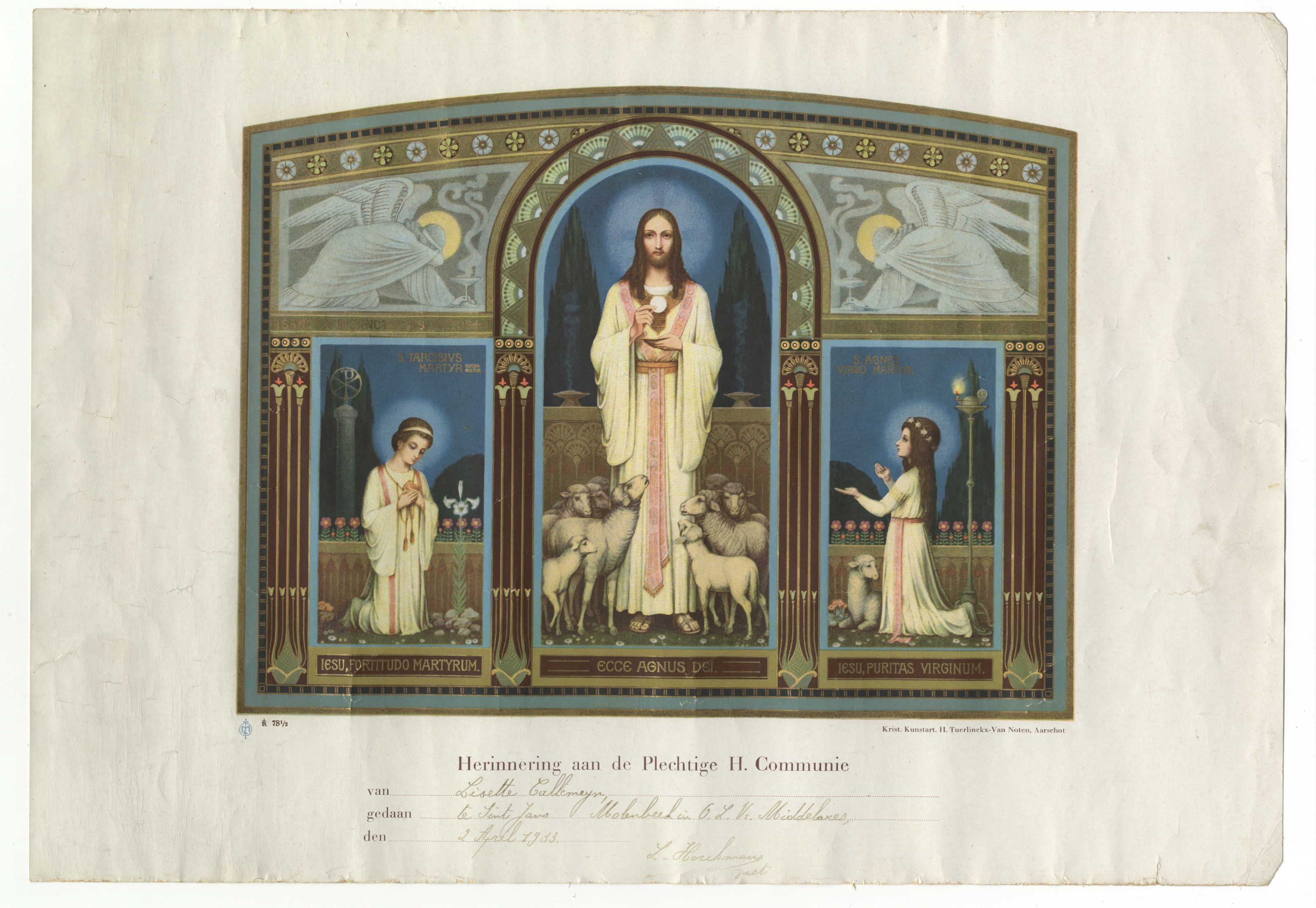 Souvenir Communion solennelle Lisette Callemeyn à l'église Notre-Dame-Médiatrice (Molenbeek-Saint-Jean), 1933.