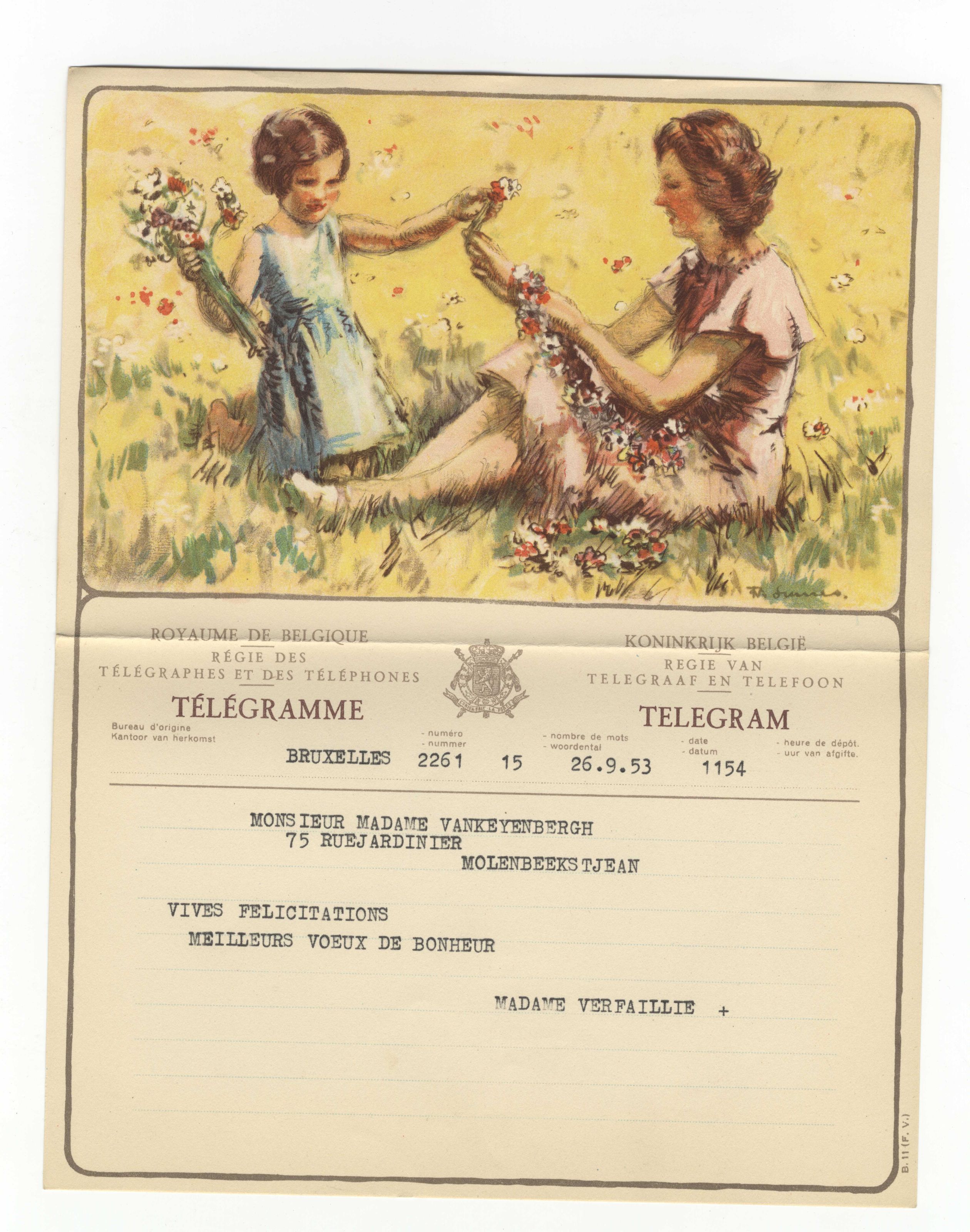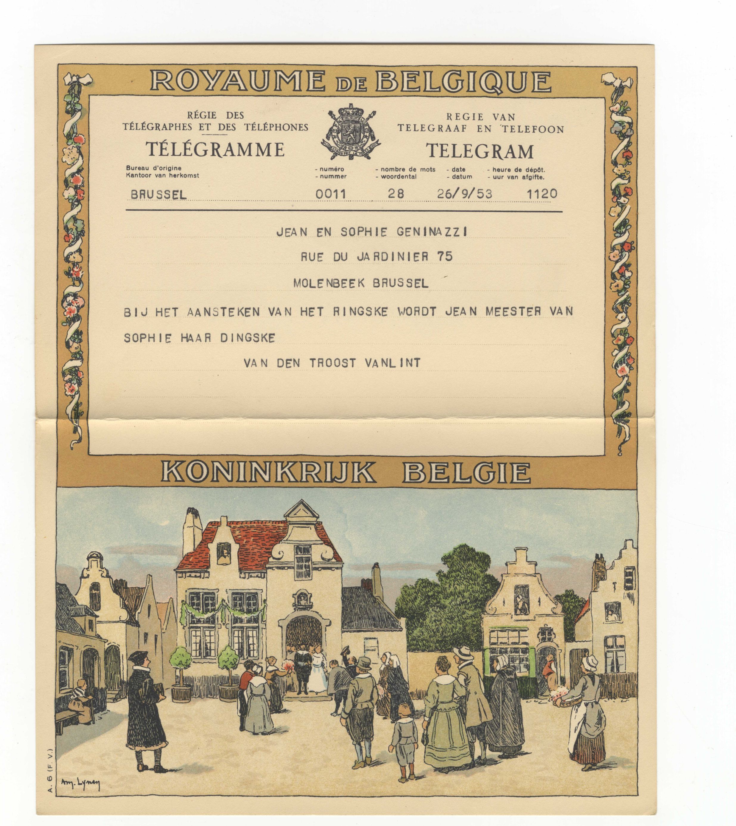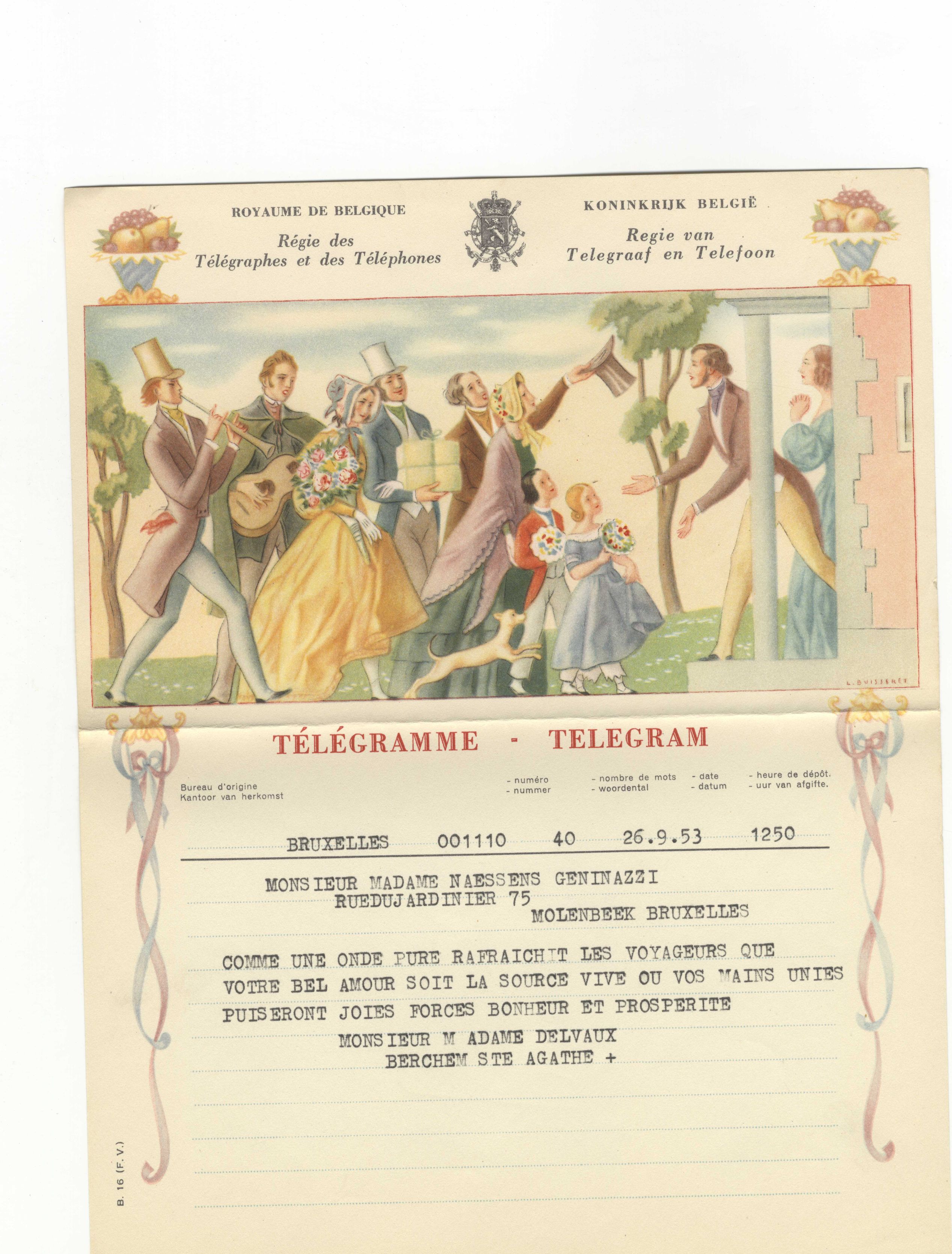 7 télégrammes avec vœux et félicitations pour le mariage de M. et Mme Vankeyenbergh-Geninazzi à Molenbeek-Saint-Jean, 1953.