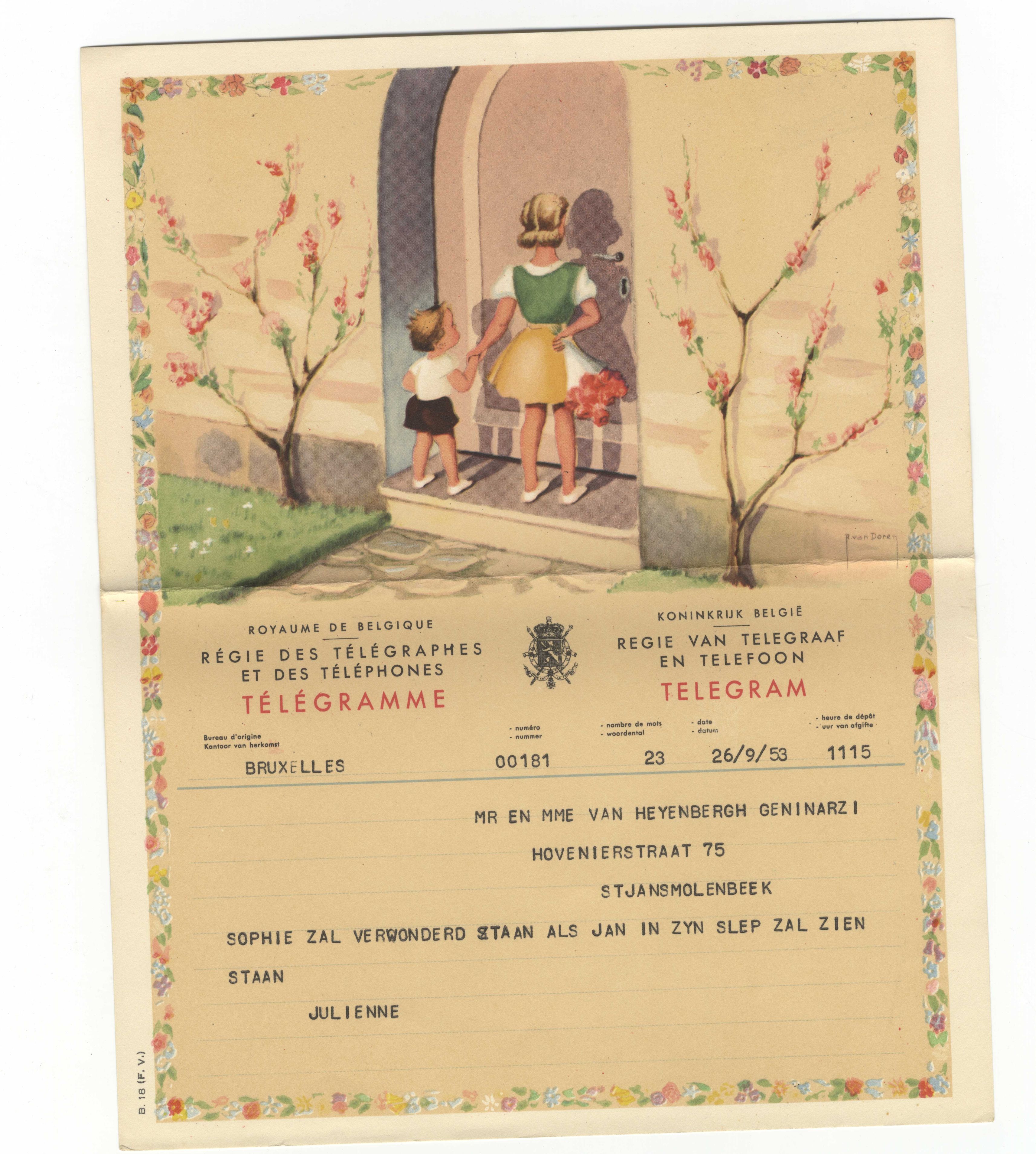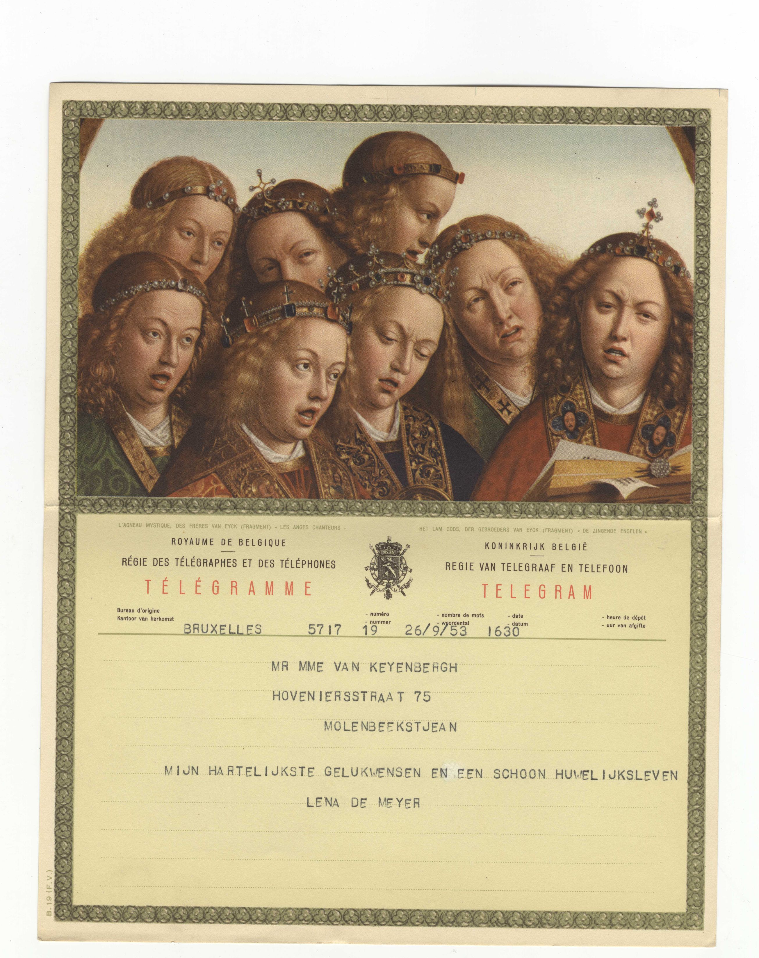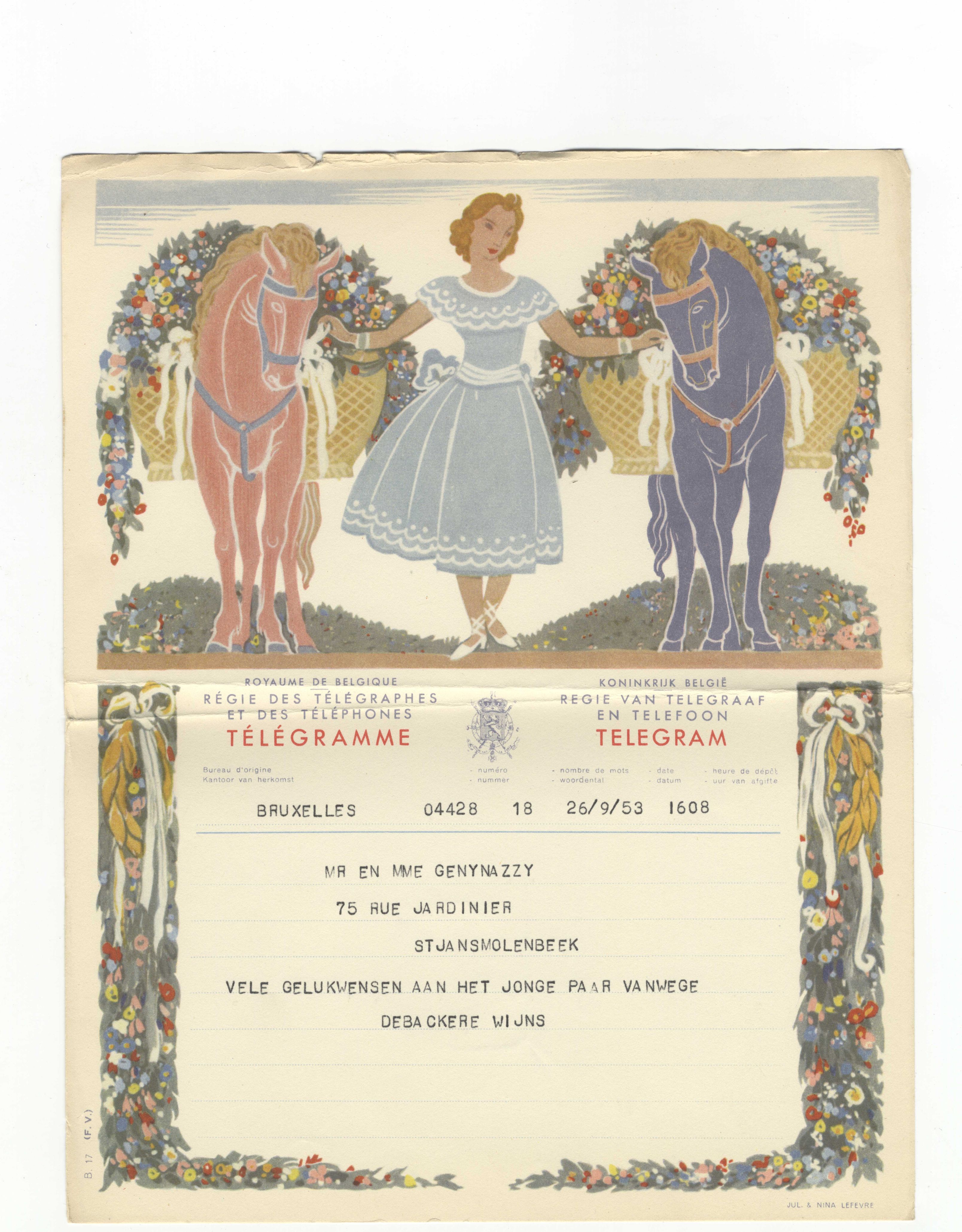 7 télégrammes avec vœux et félicitations pour le mariage de M. et Mme Vankeyenbergh-Geninazzi à Molenbeek-Saint-Jean, 1953.