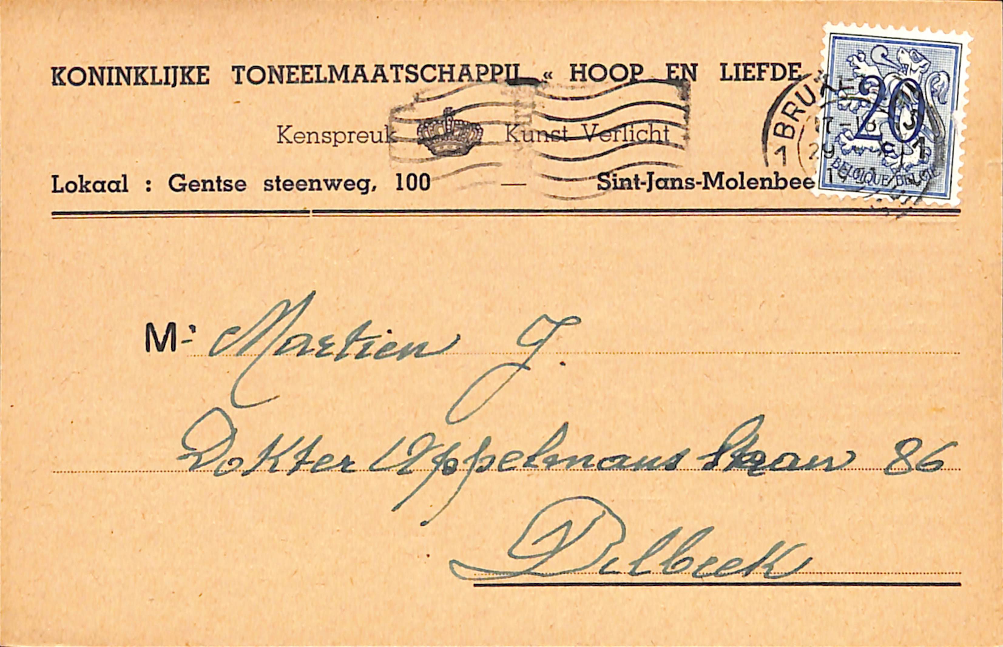 Carte postale Koninklijke Toneelmaatschappij "Hoop en Liefde", Chaussée de Gand, 100 (Molenbeek-Saint-Jean), s.d.