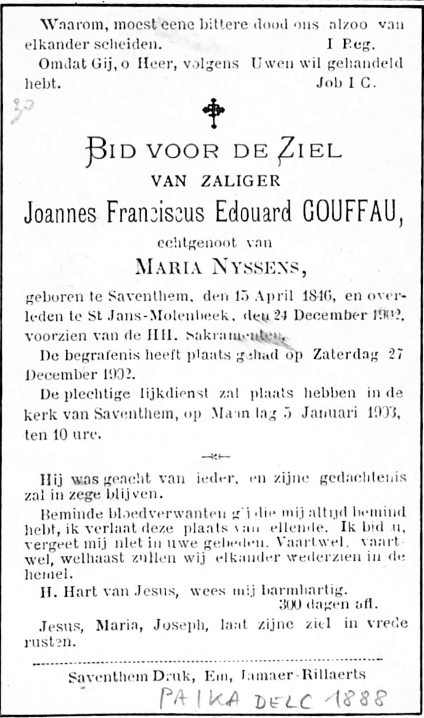 Souvenir pieux Joannes Franciscus Edouard Gouffau, époux de Maria Nyssen (Zaventhem, 1846 - Molenbeek-Saint-Jean, 1902), impr. Em. Jamaer-Rillaerts (Zaventhem), 1902.