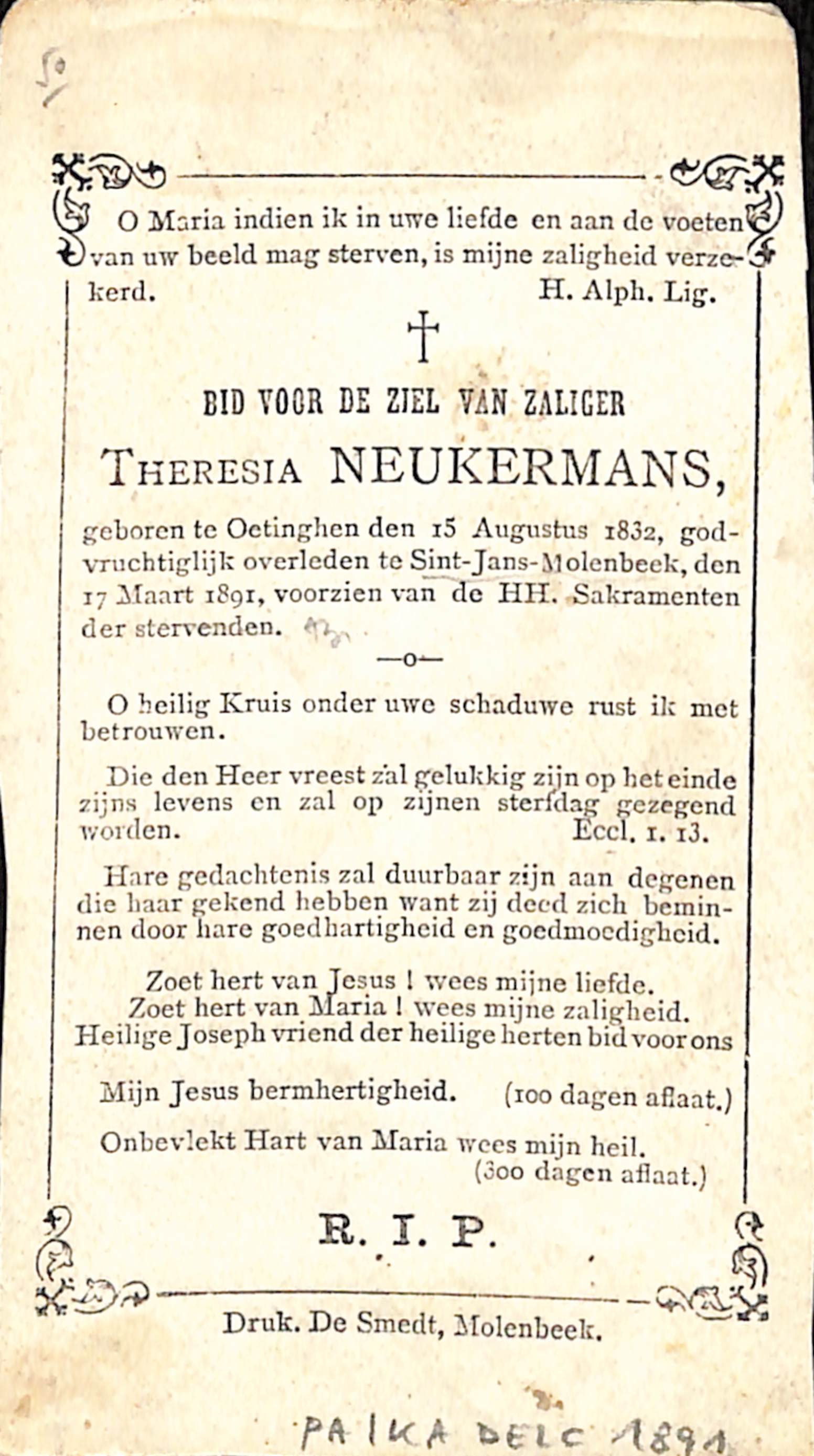 Souvenir pieux Theresia Neukermans (Oetinghen, 1832 - Molenbeek-Saint-Jean, 1891), éd. Boumard et fils (Paris), impr. De Smedt (Molenbeek-Saint-Jean), 1891.