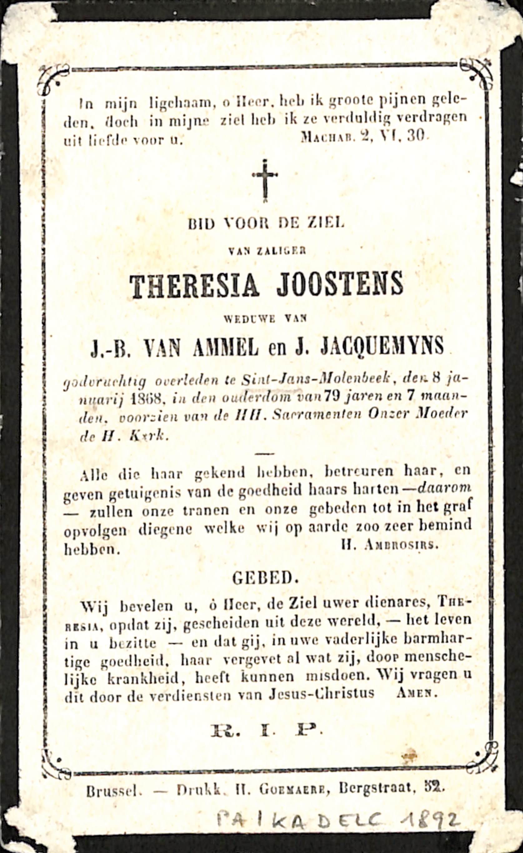 Souvenir pieux Theresia Joostzns, veuve de J.-B. Van Ammel et J. Jacquemyns (décédée à Molenbeek-Saint-Jean, 1868), éd. Ch. Letaille (Paris), impr. H. Goemaere (Bruxelles), 1868.