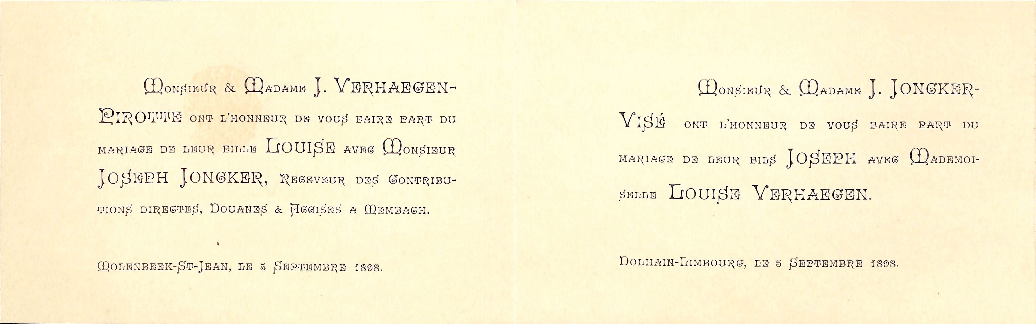 Faire-part de mariage Louise Verhaegen et Joseph Joncker (Molenbeek-Saint-Jean et Dolhain-Limbourg), 1898.