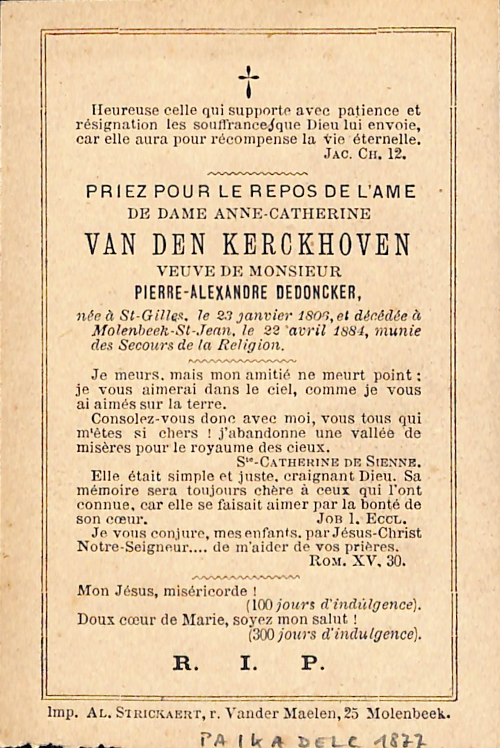 Souvenir pieux Anne-Catherine Van den Kerckhoven, veuve de Pierre-Alexandre Dedoncker (Saint-Gilles, 1806 - Molenbeek-Saint-Jean, 1884), impr. Al. Strickaert (Molenbeek), 1885.